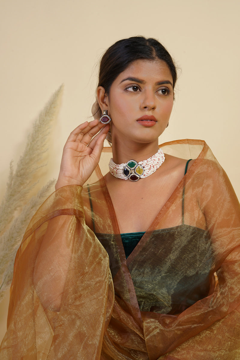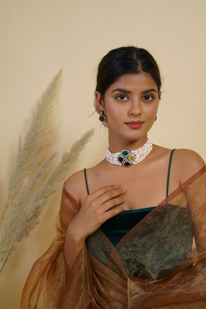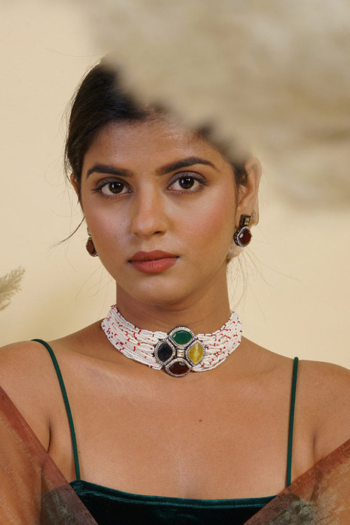 This jewellery set consists of a Necklace & a pair of Earrings. Multicolor Stone Studded Pearl Layered Choker Set, has stone detailing. Secured with drawstring Closure. A pair of matching Earrings, each secured with post and back closure.