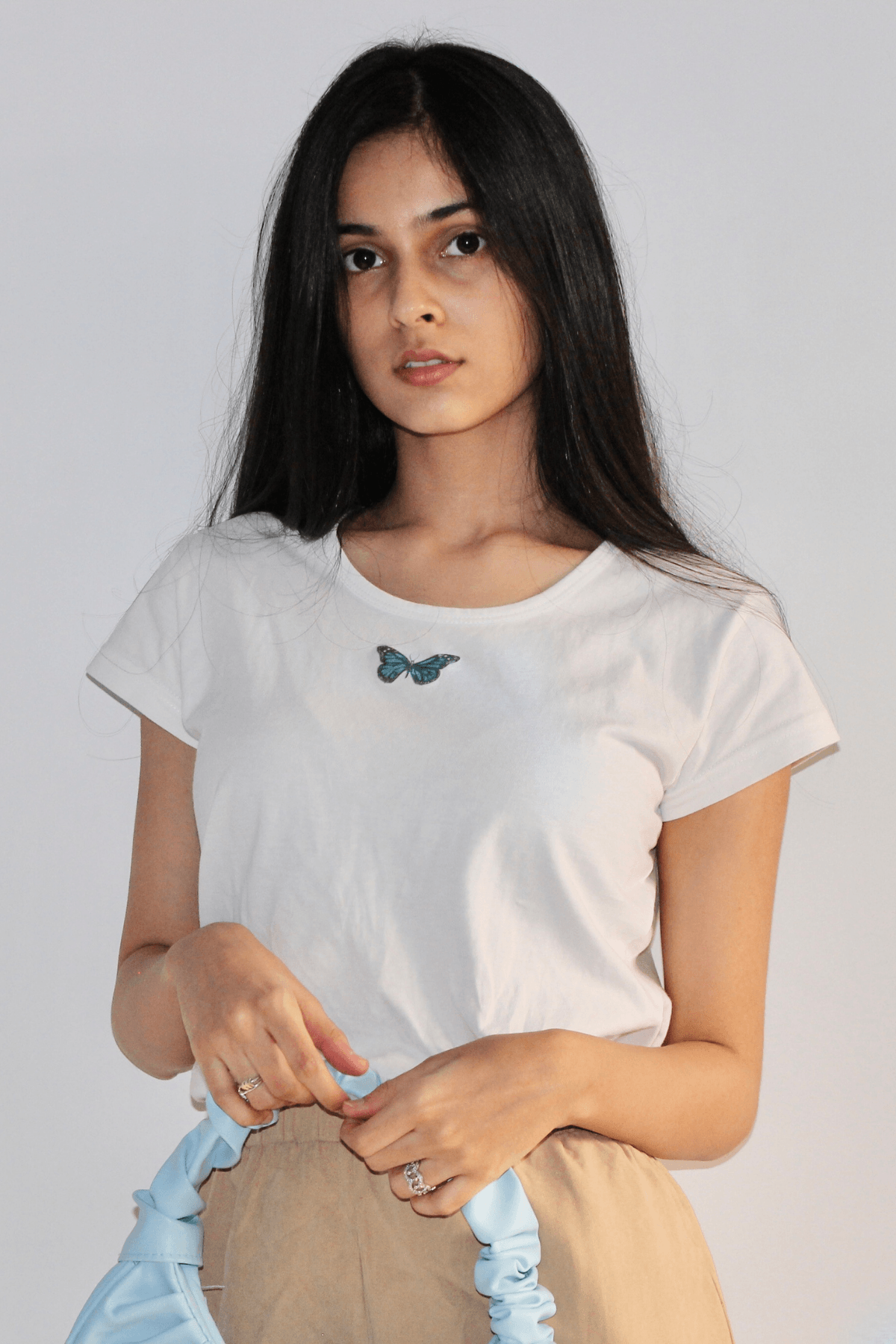 The Monarch Butterfly T-shirt is a 100% cotton, 180 GSM white T- shirt with a printed butterfly on the chest.