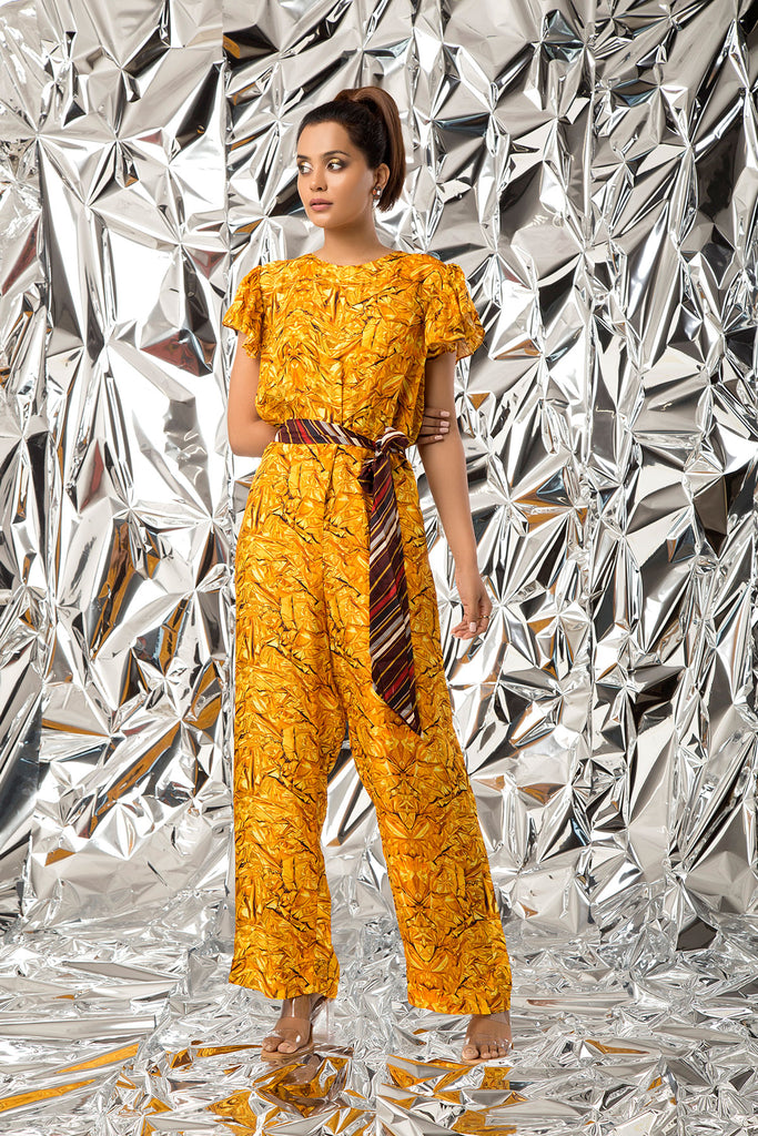 Ruffled sleeve Yellow Gold jumpsuit with belt