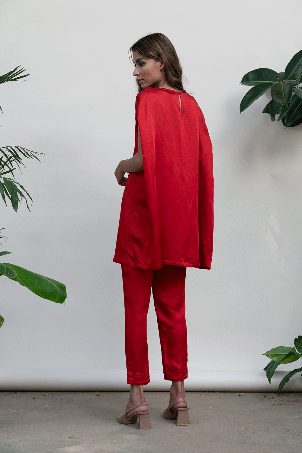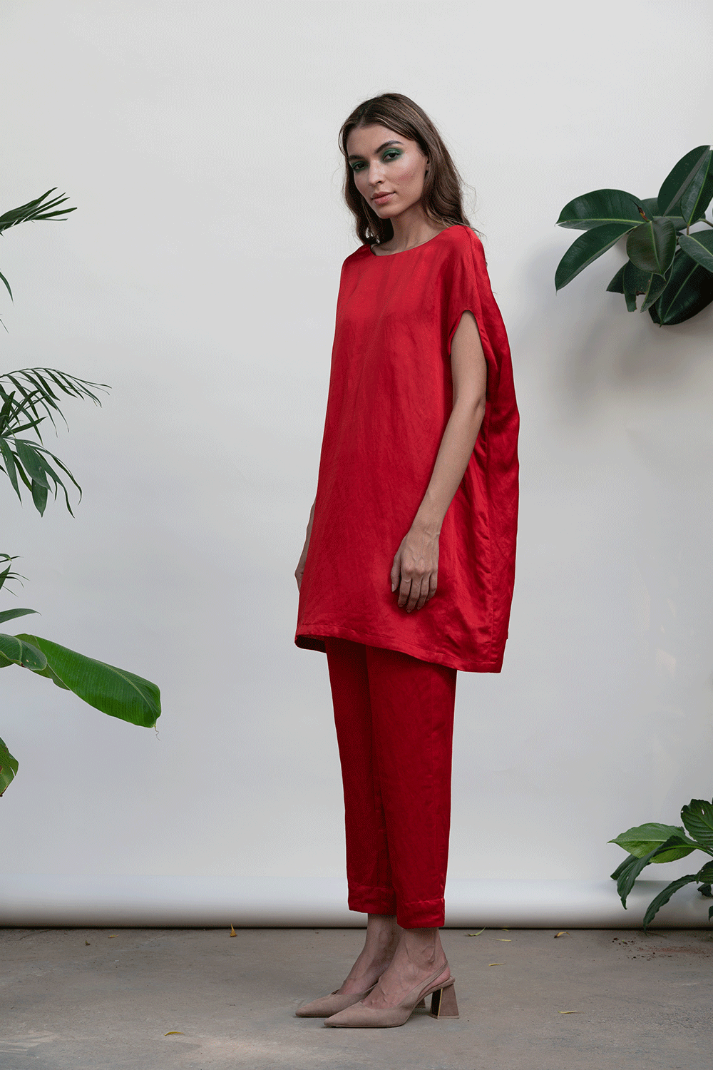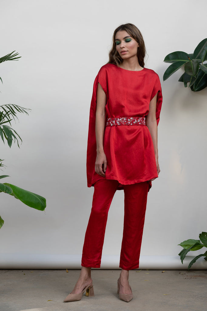 Slightly oversized solid top with drop shoulder. Easy to wear with round neck and a key hole opening at the back. Comes with a hand embroidered belt.