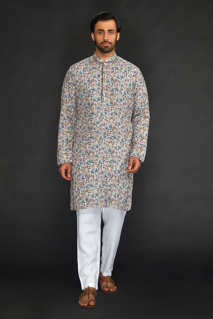 Sky Blue Katha Work Printed Linen Kurta with Churidar