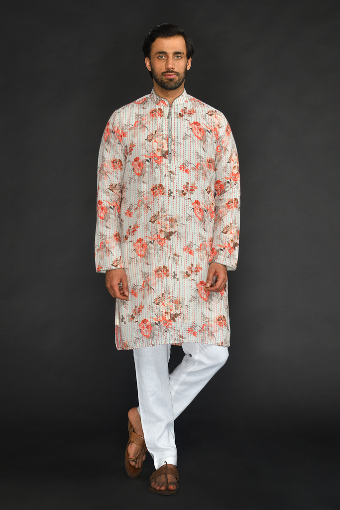 Grey Katha Work Printed Linen Kurta with Churidar