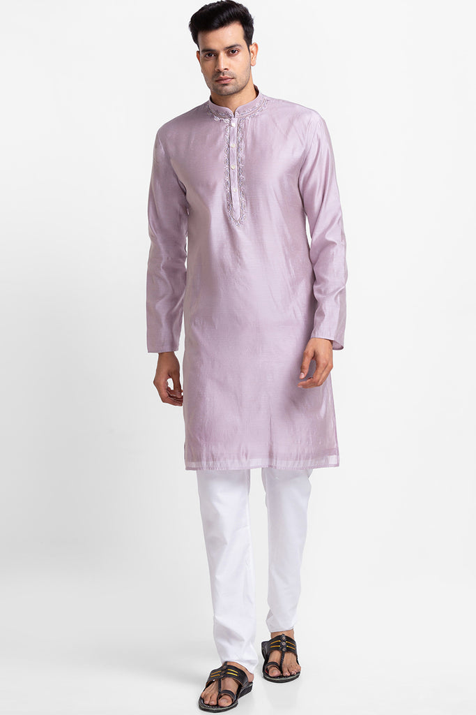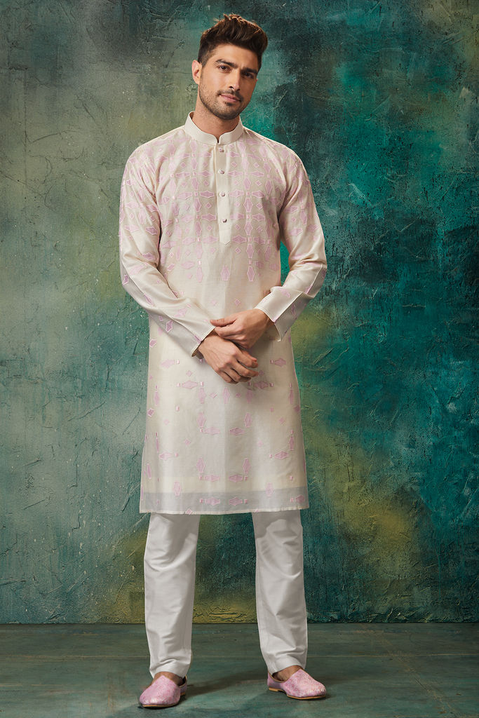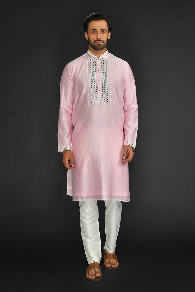 Baby Pink Pure Chanderi Silk Kurta with Applique Thread Embroidery