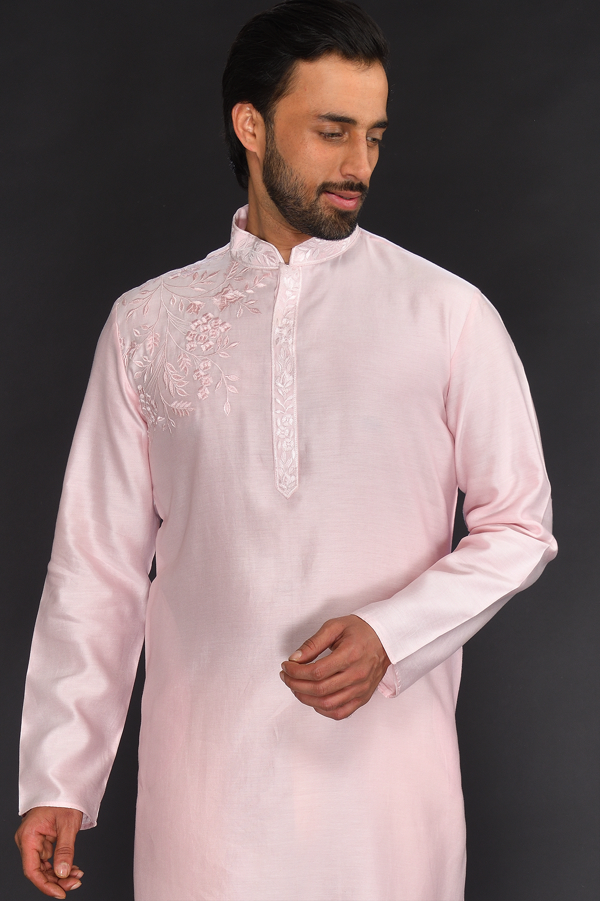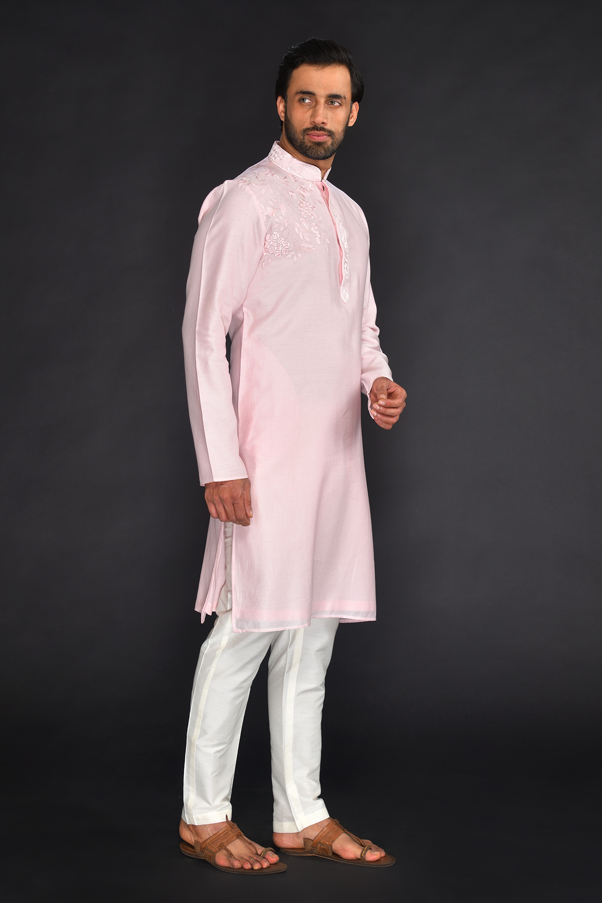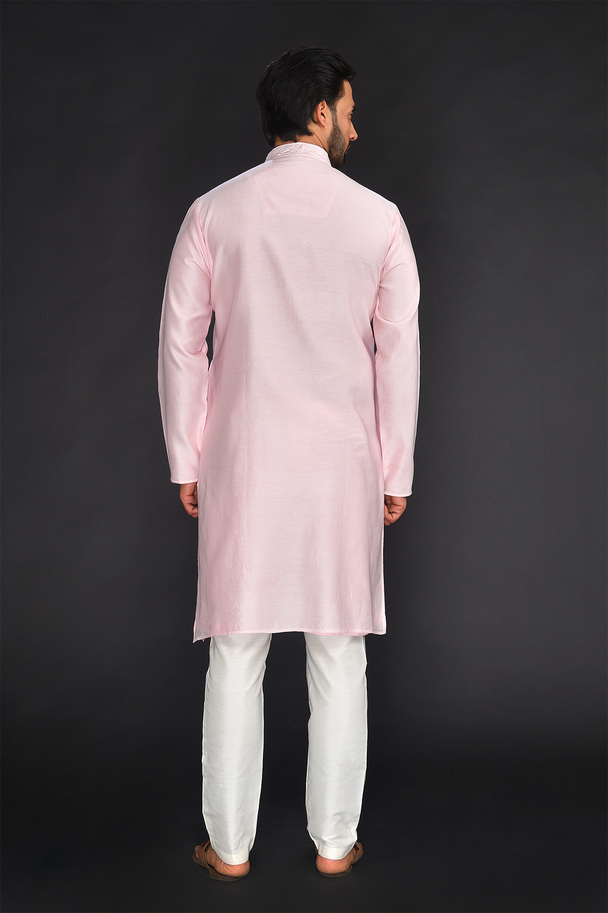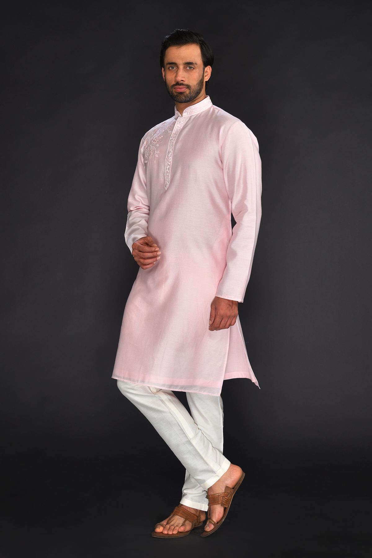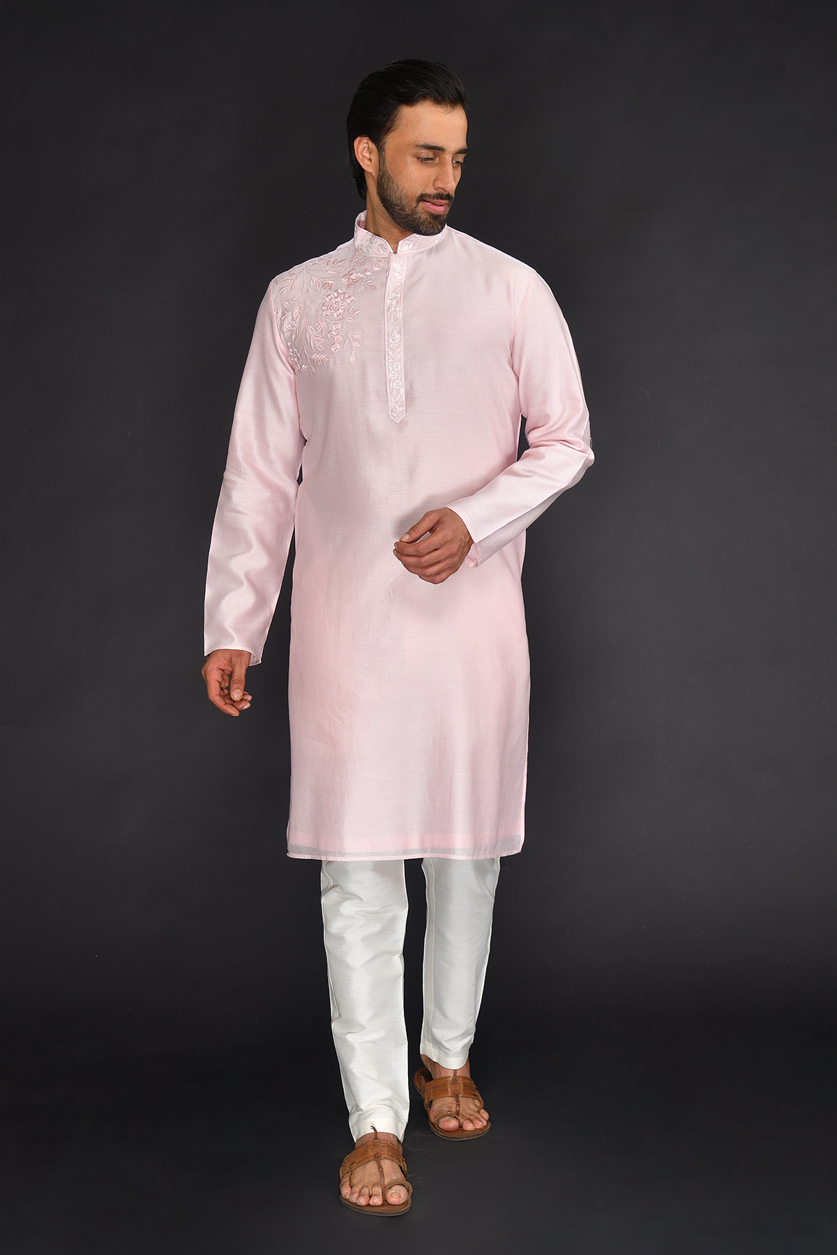Baby Pink Pure Machine Thread Embroidery Kurta with spun silk Off white Chudidar Bottom.