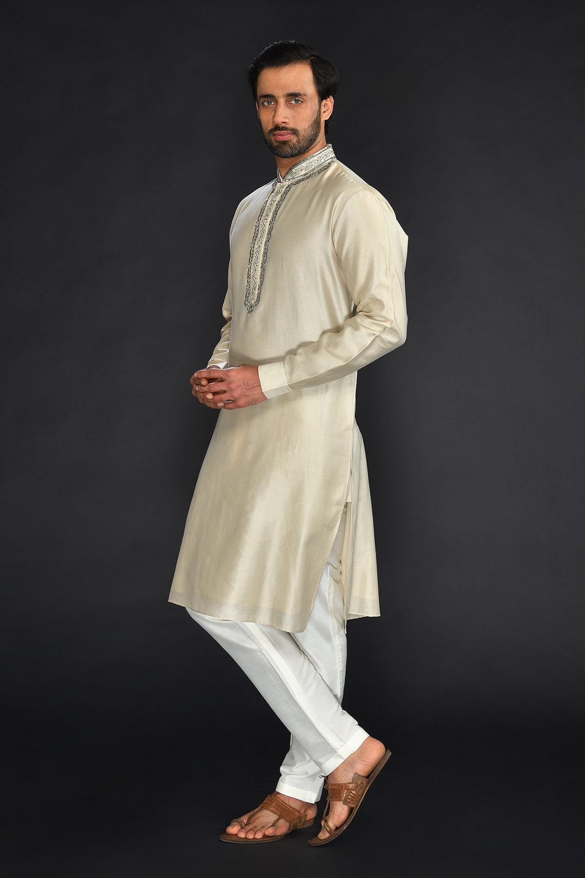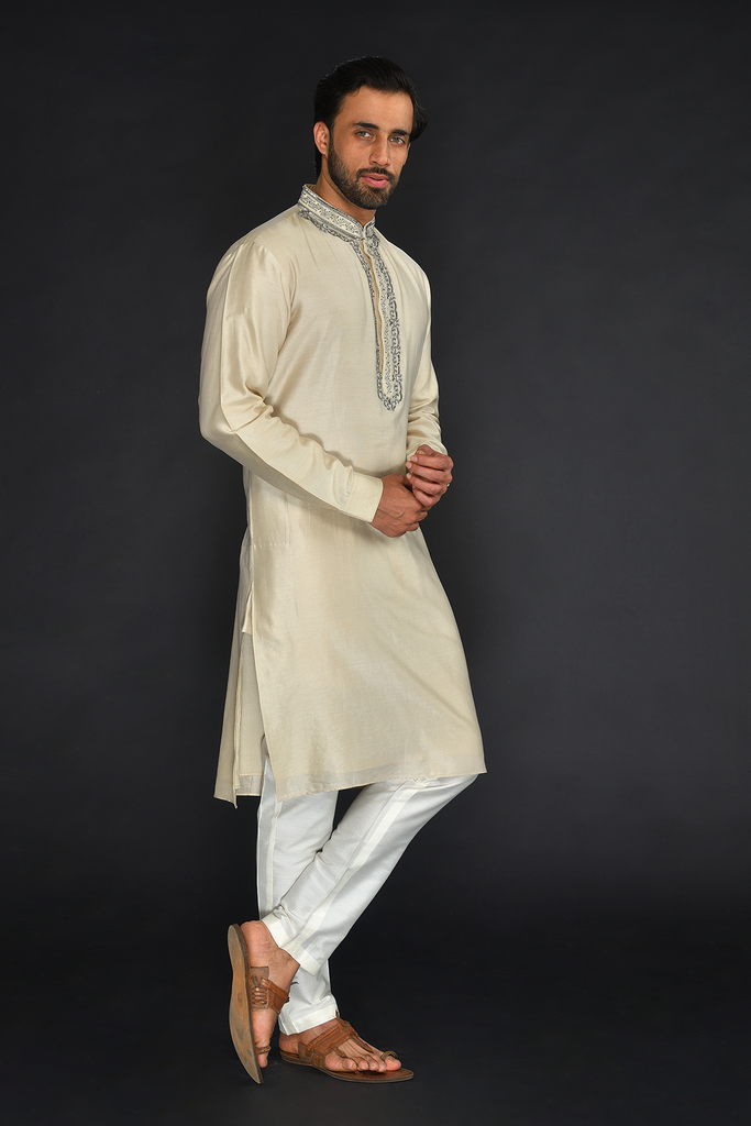 Beige Chanderi Kurta with Hand & Machine Embroidery.