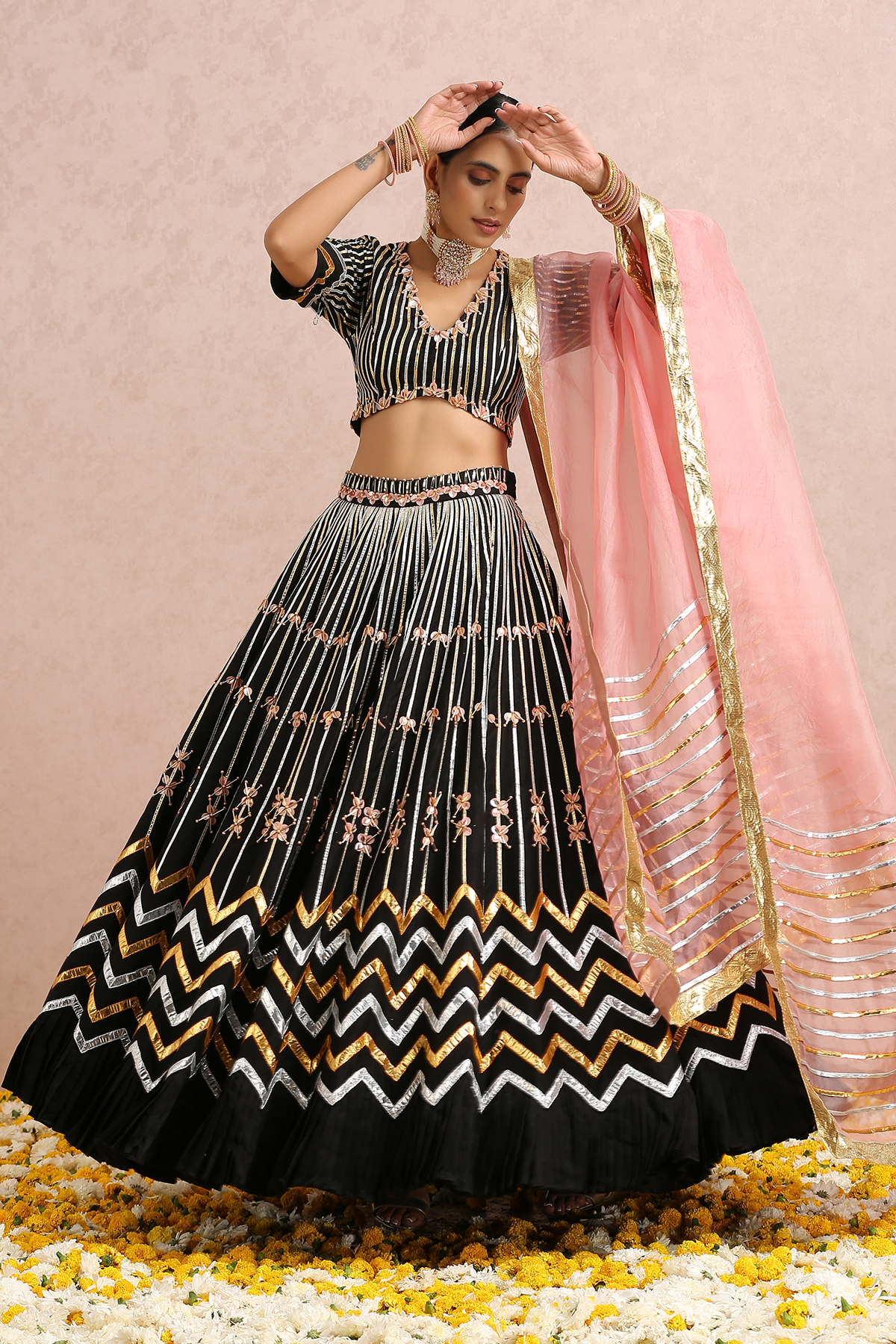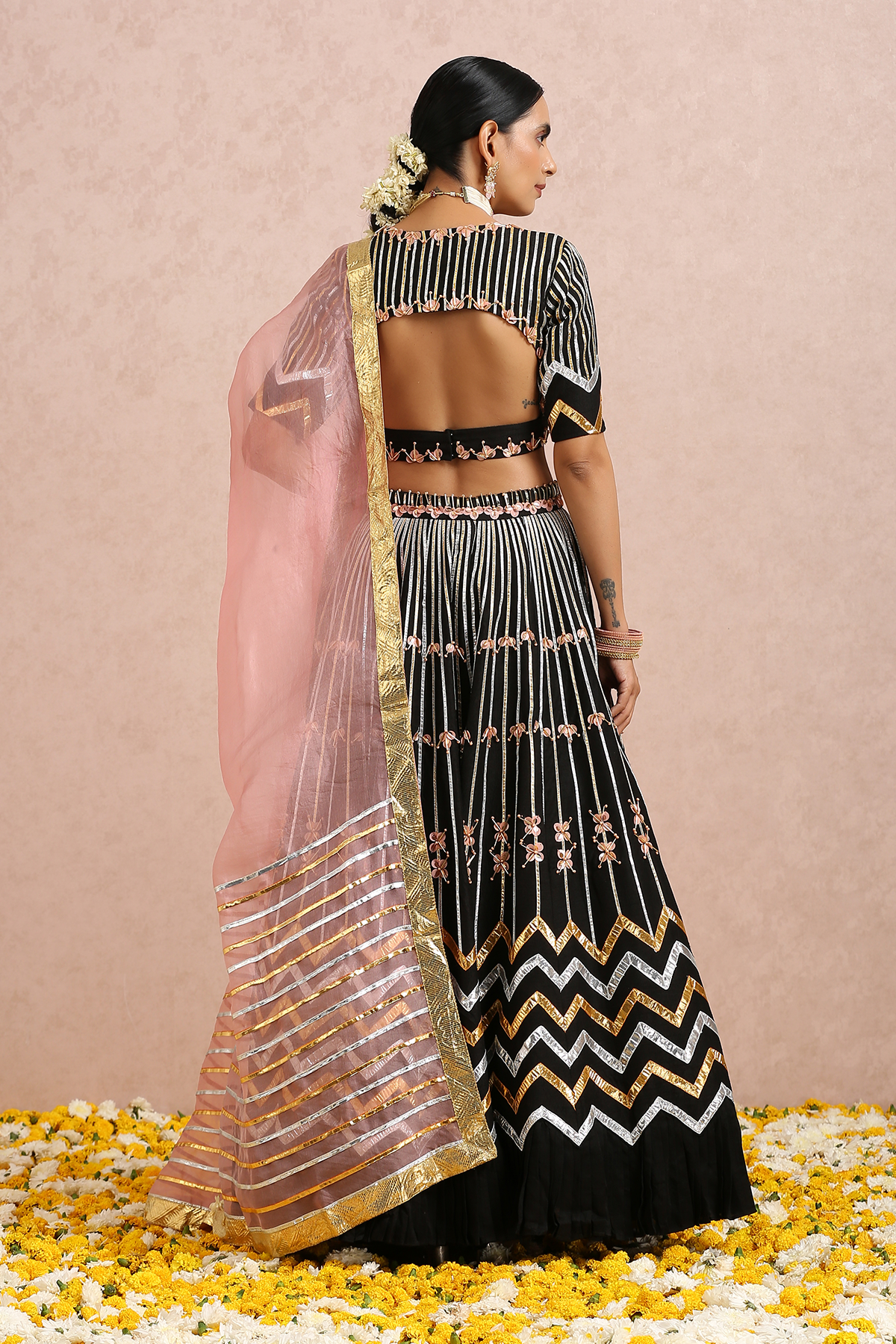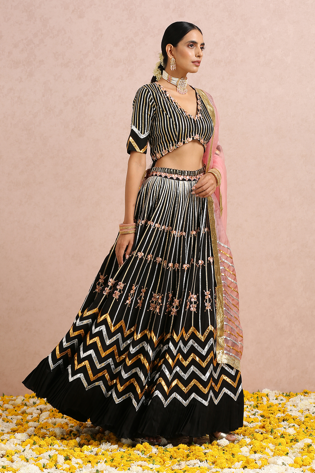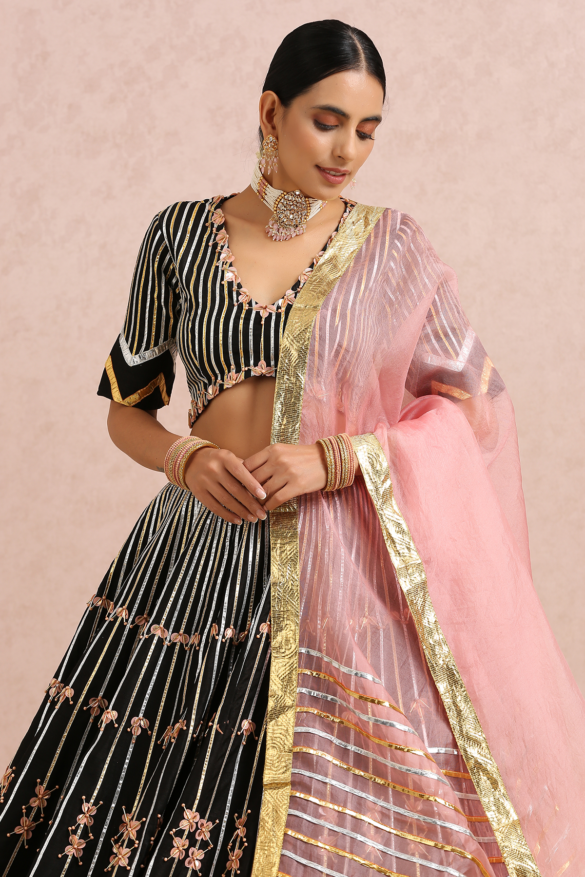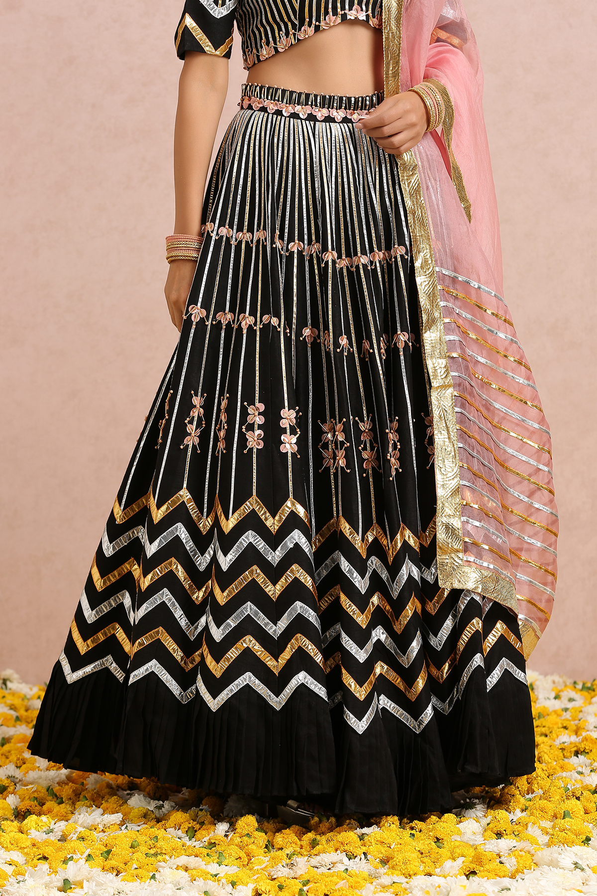 Featuring a black embroidered lehenga in silk base. It is paired with a black embroidered blouse and comes with a coral silk organza dupatta