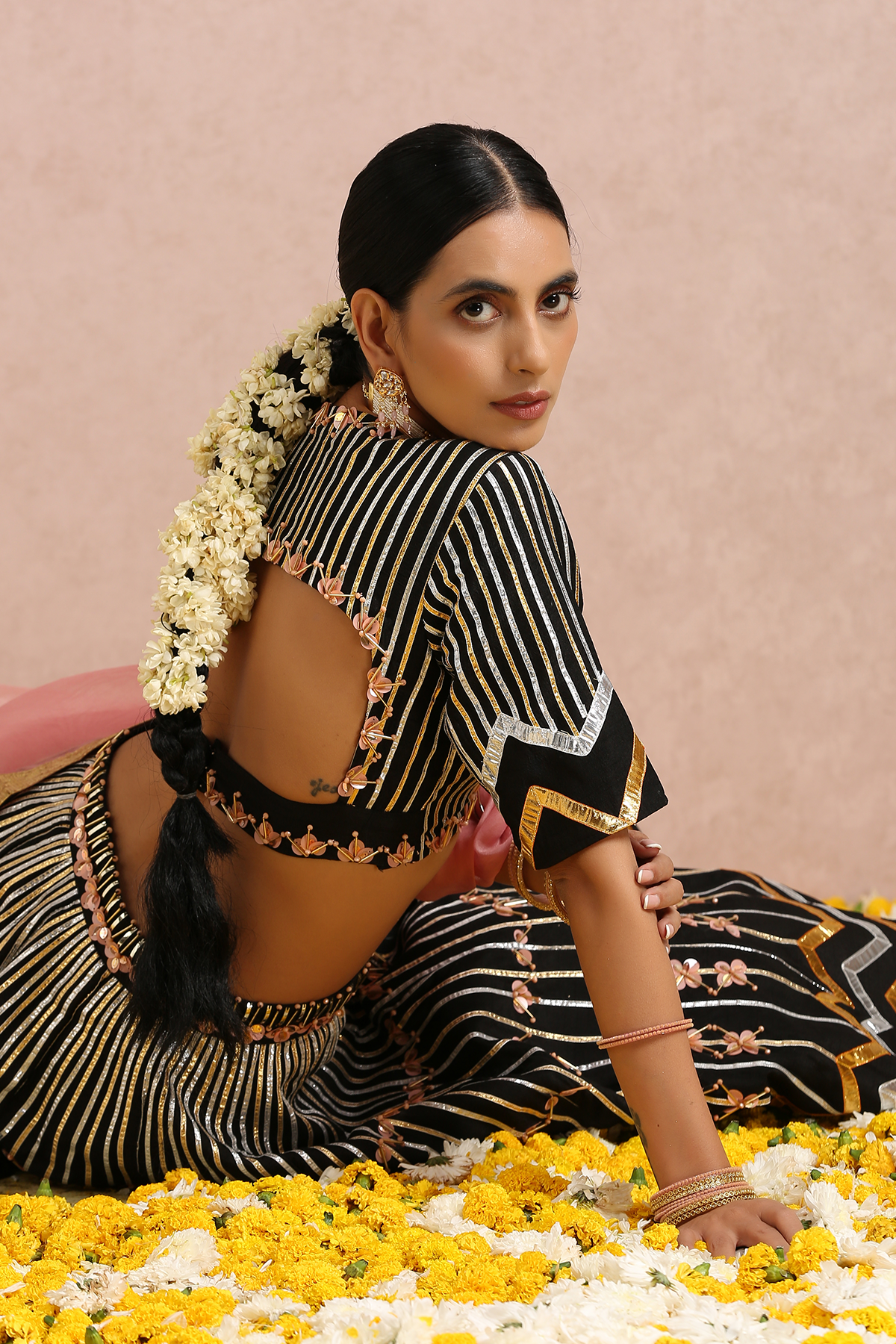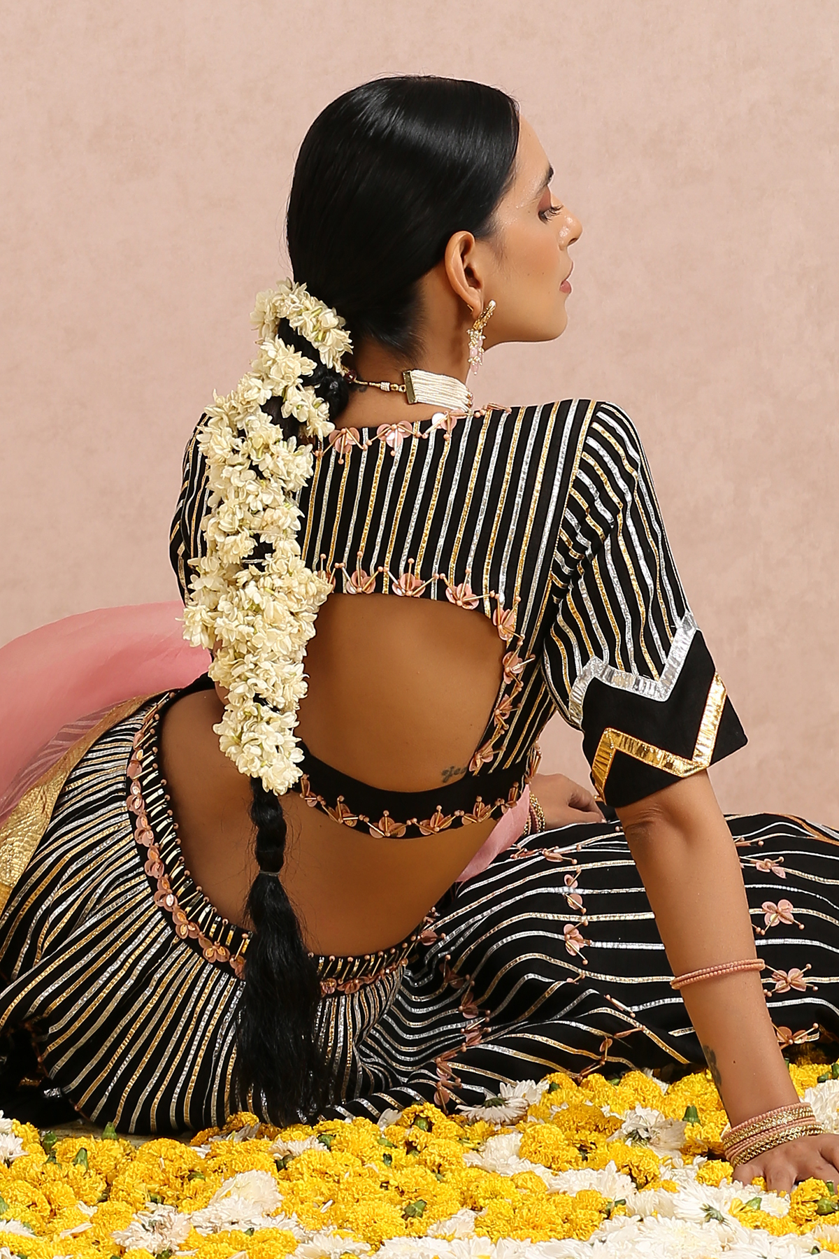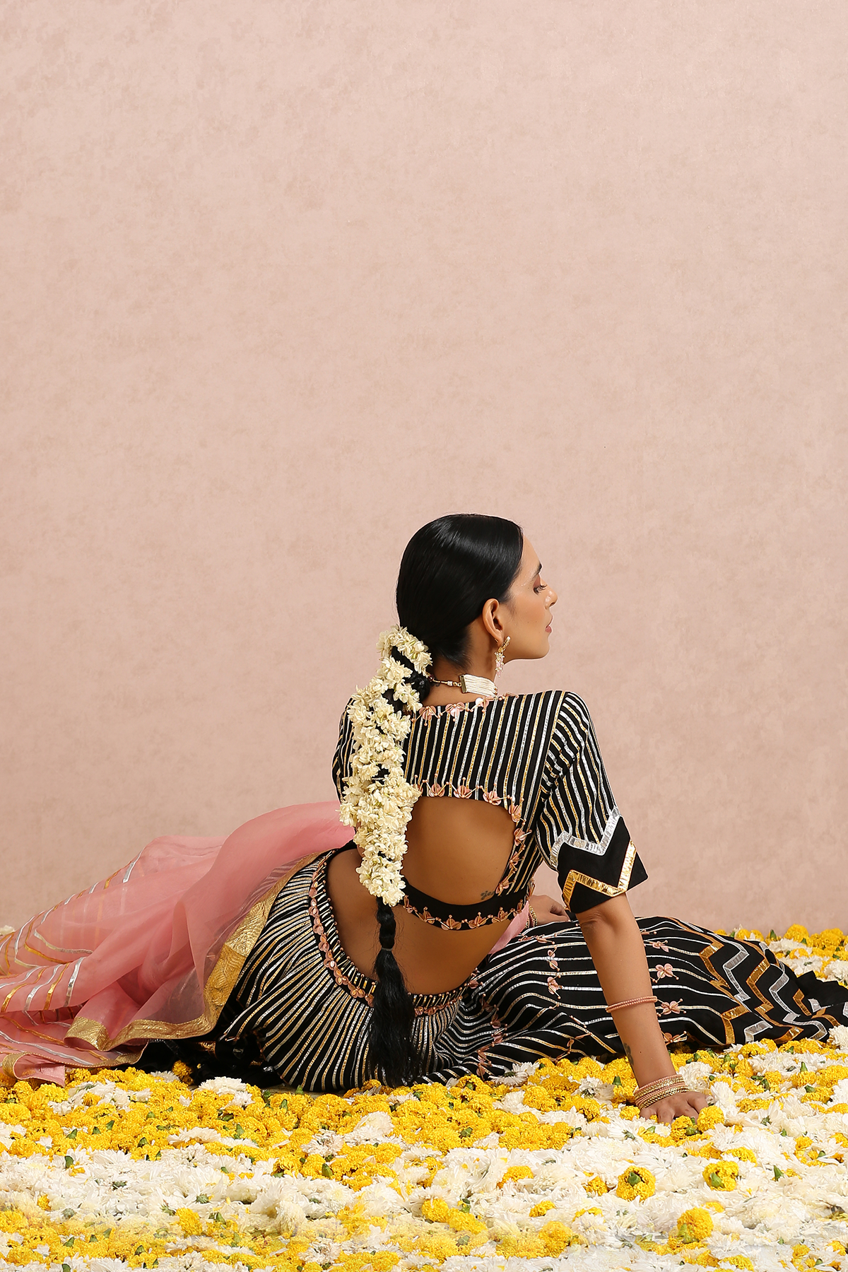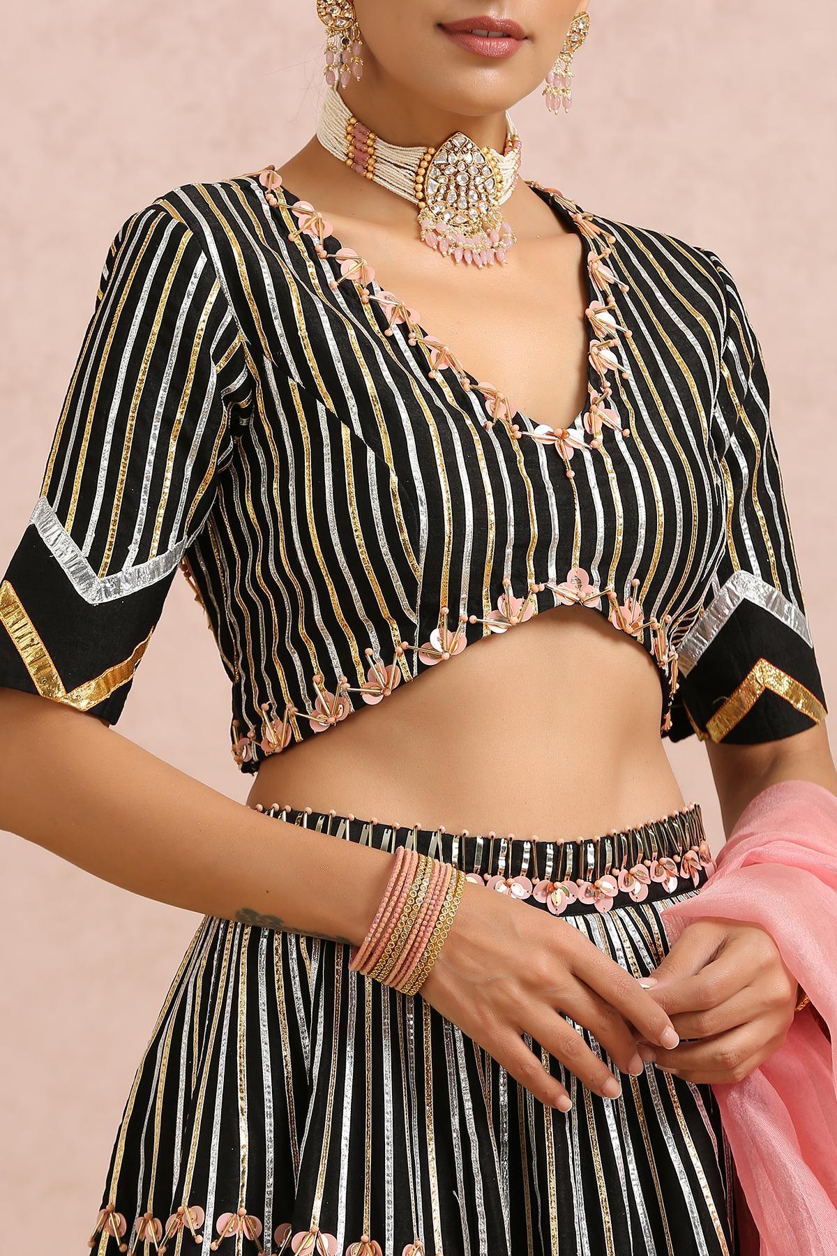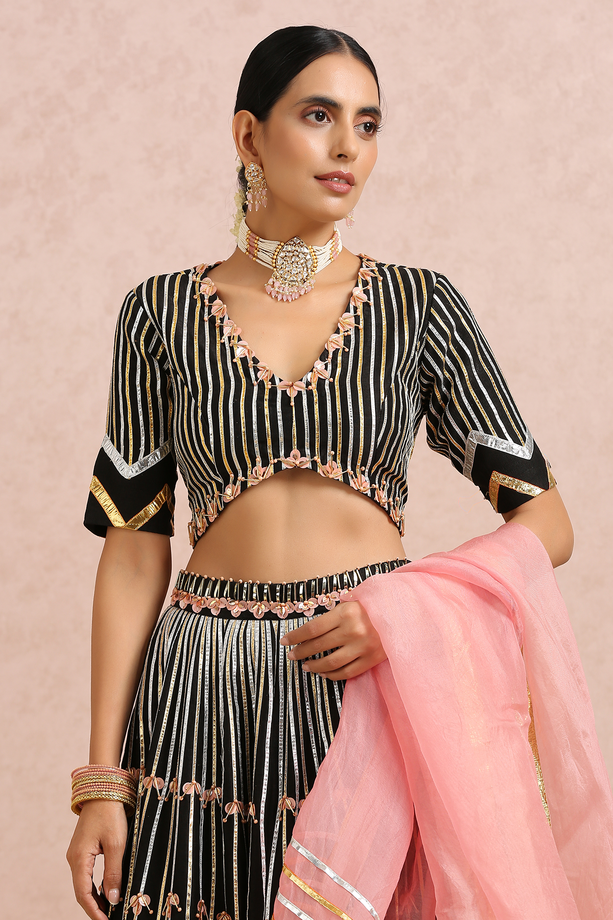 Featuring a black embroidered lehenga in silk base. It is paired with a black embroidered blouse and comes with a coral silk organza dupatta