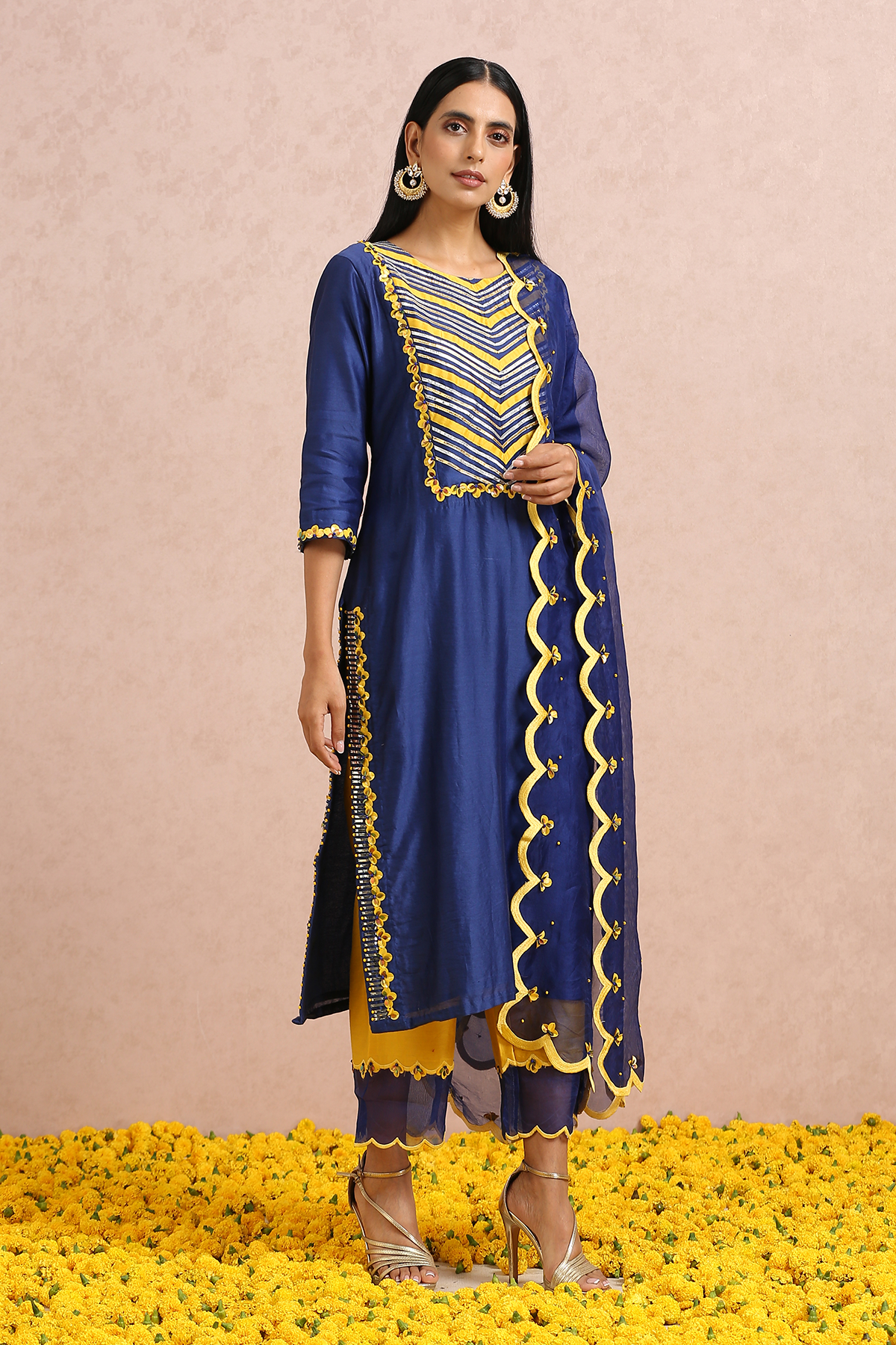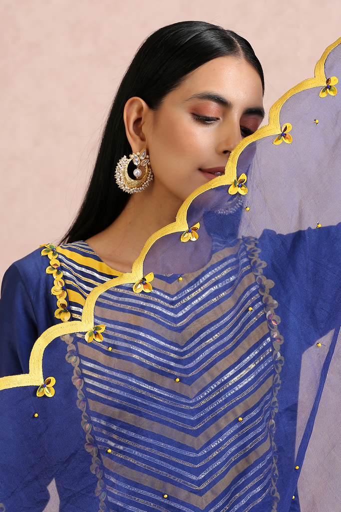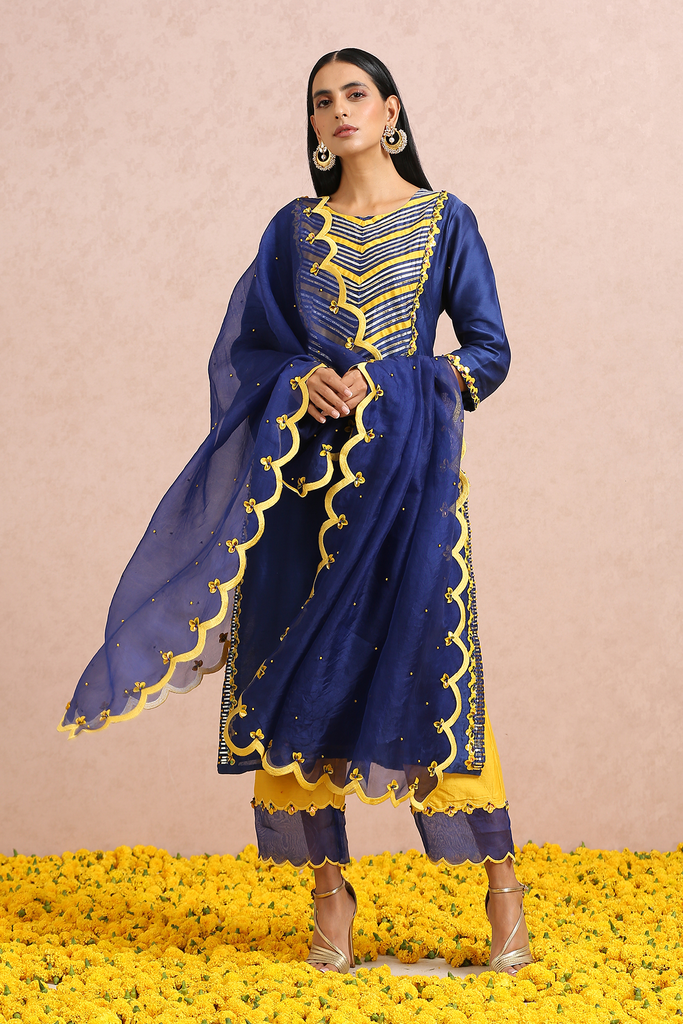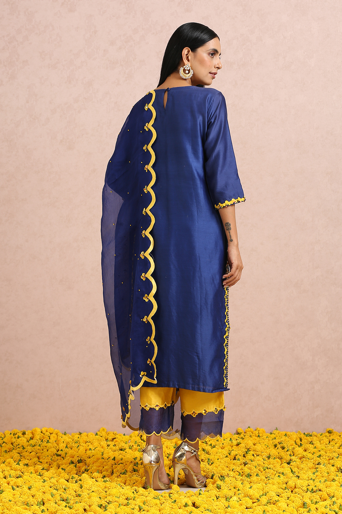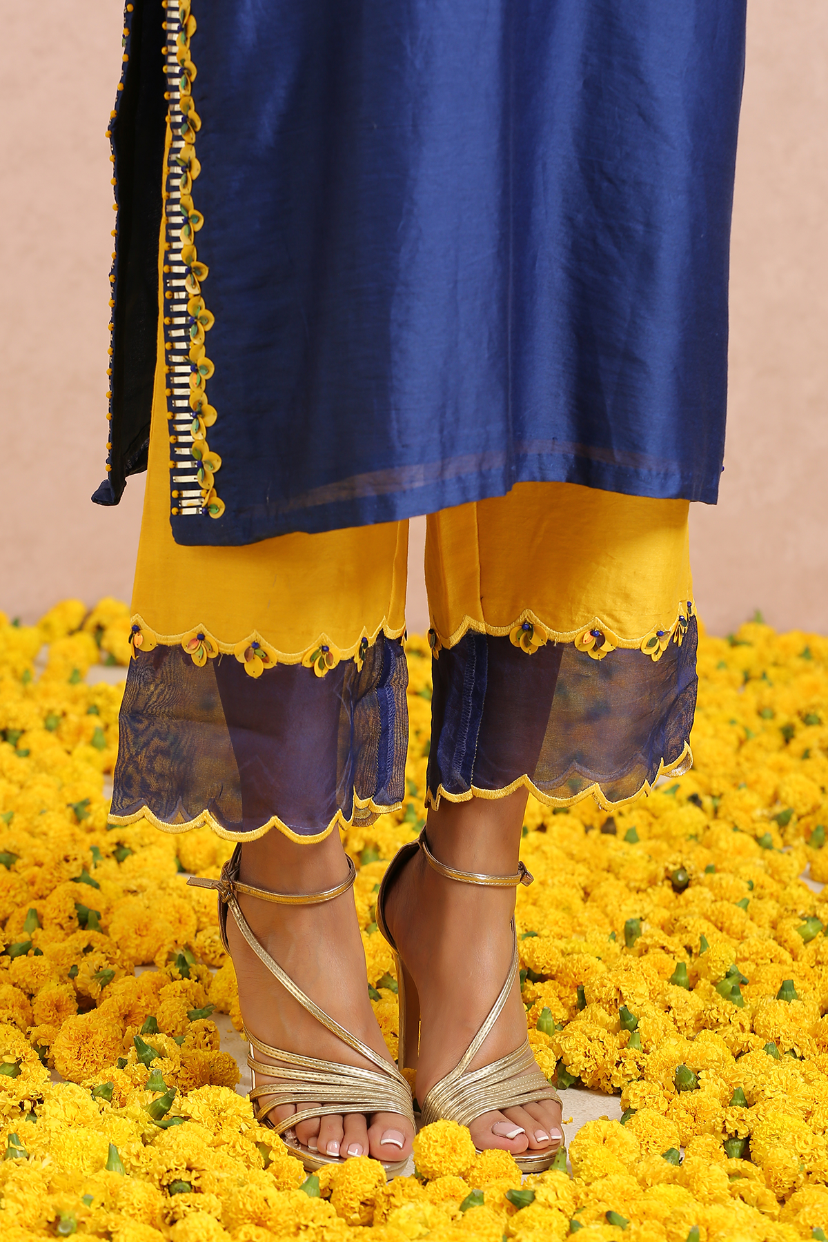 Featuring an ink blue embroidered chanderi kurta set. It comes with a yellow palazzos finished with scallop embroidered edging. It is paired with an ink blue silk organza embroidered dupatta.