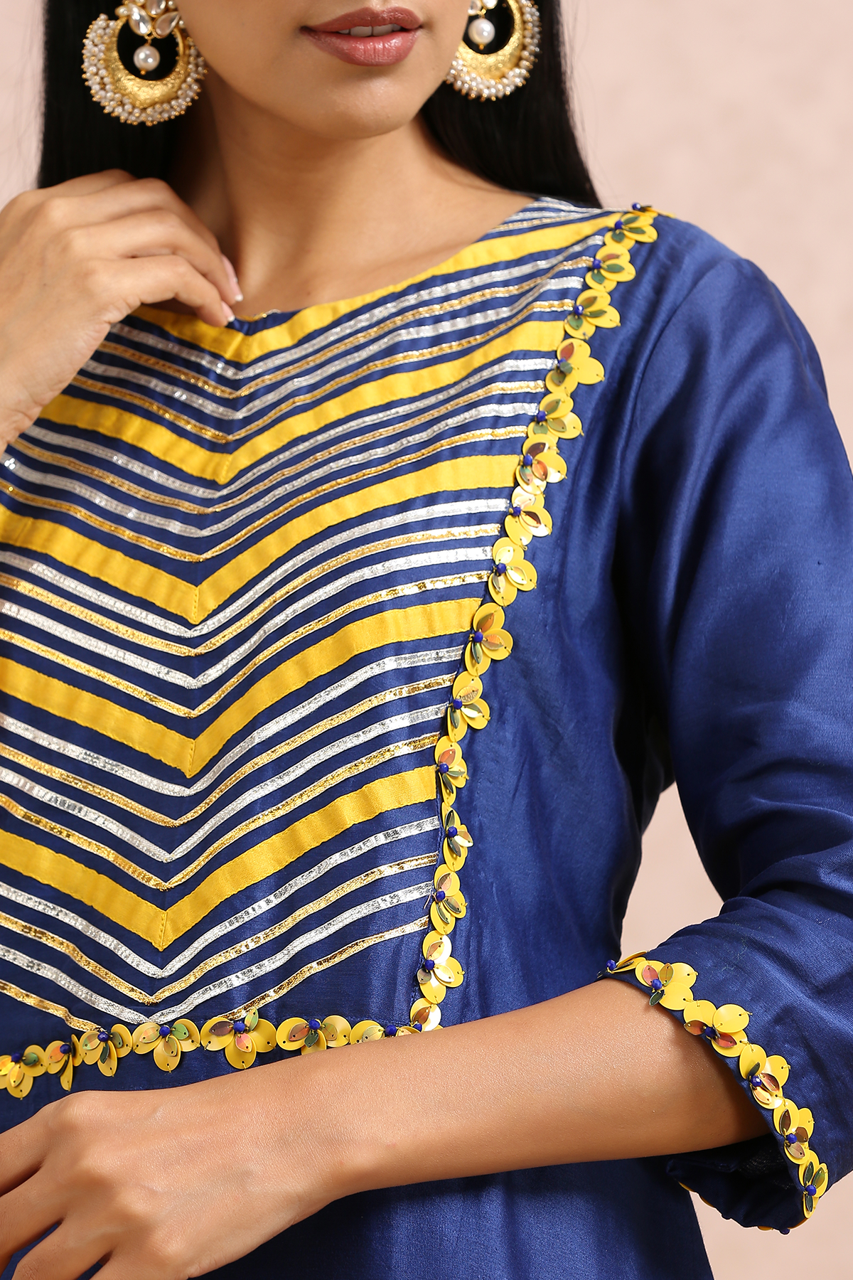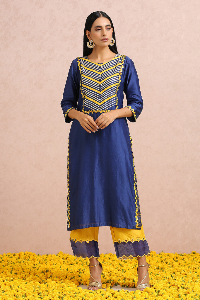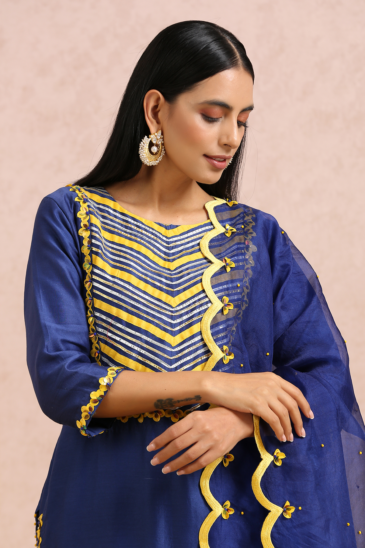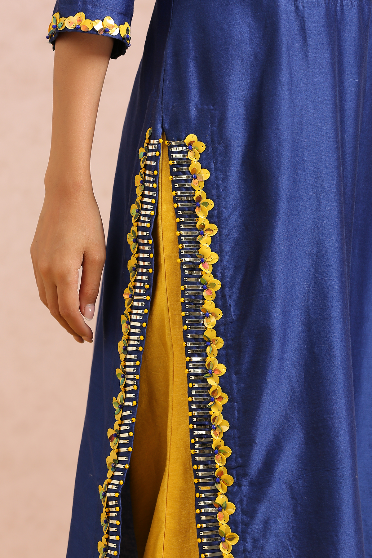 Featuring an ink blue embroidered chanderi kurta set. It comes with a yellow palazzos finished with scallop embroidered edging. It is paired with an ink blue silk organza embroidered dupatta.