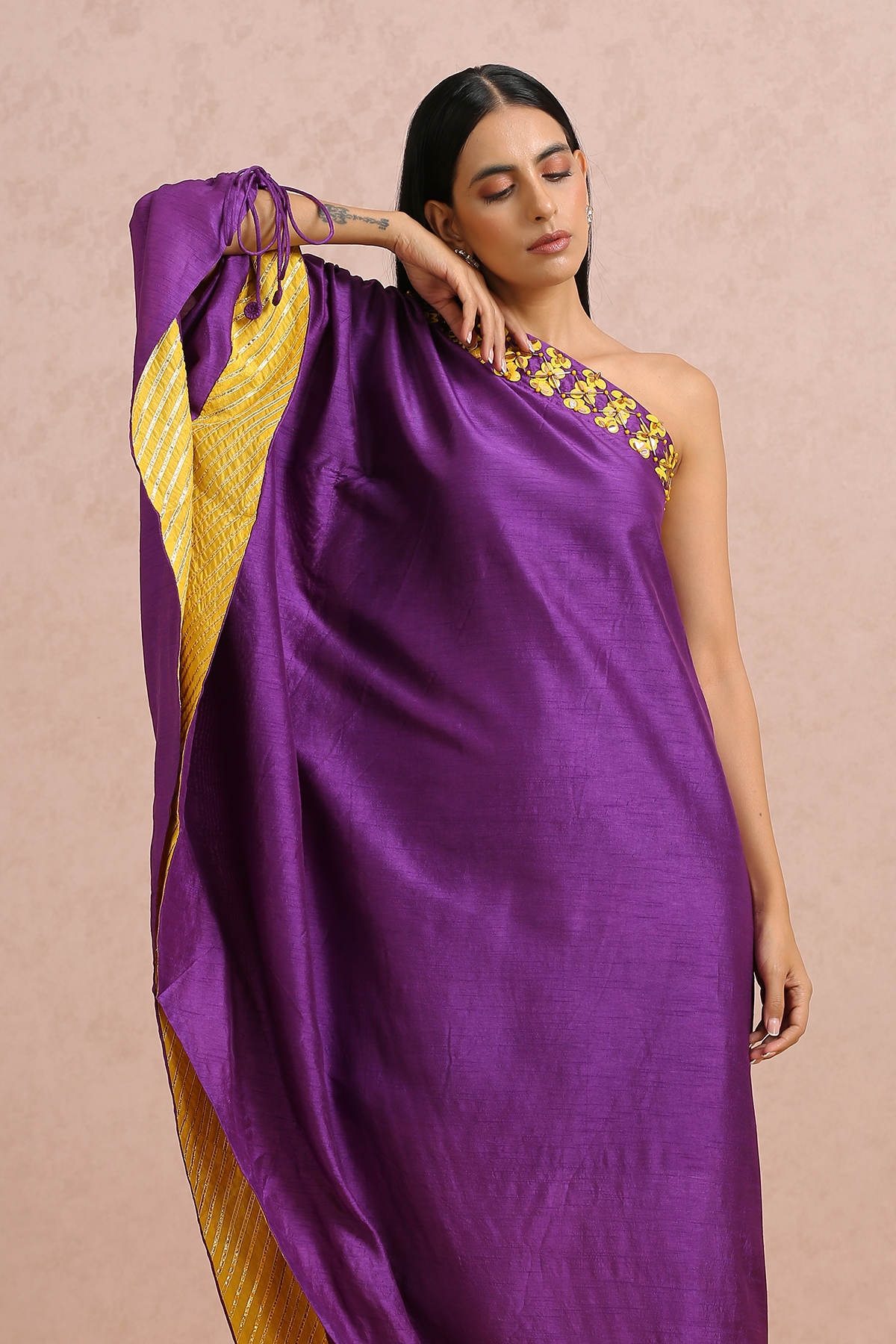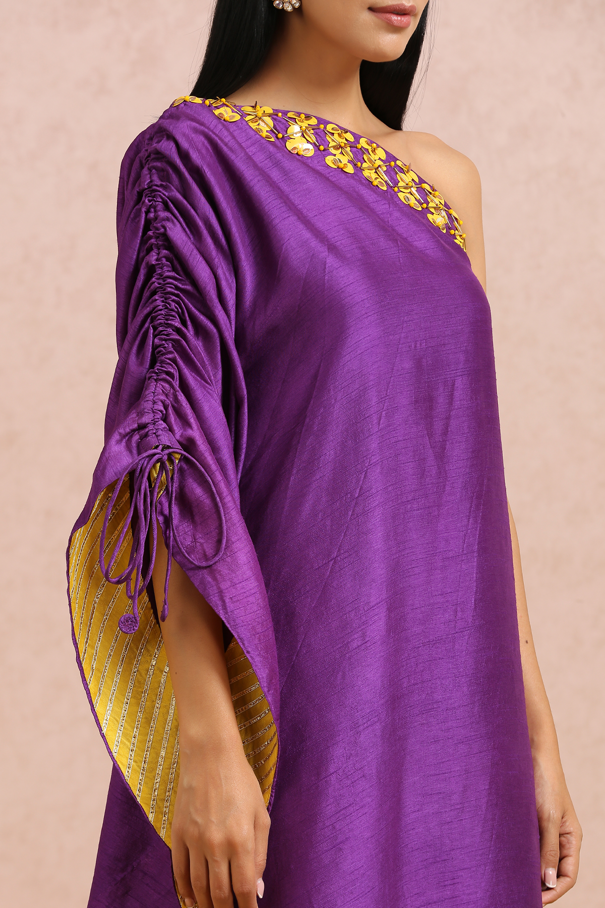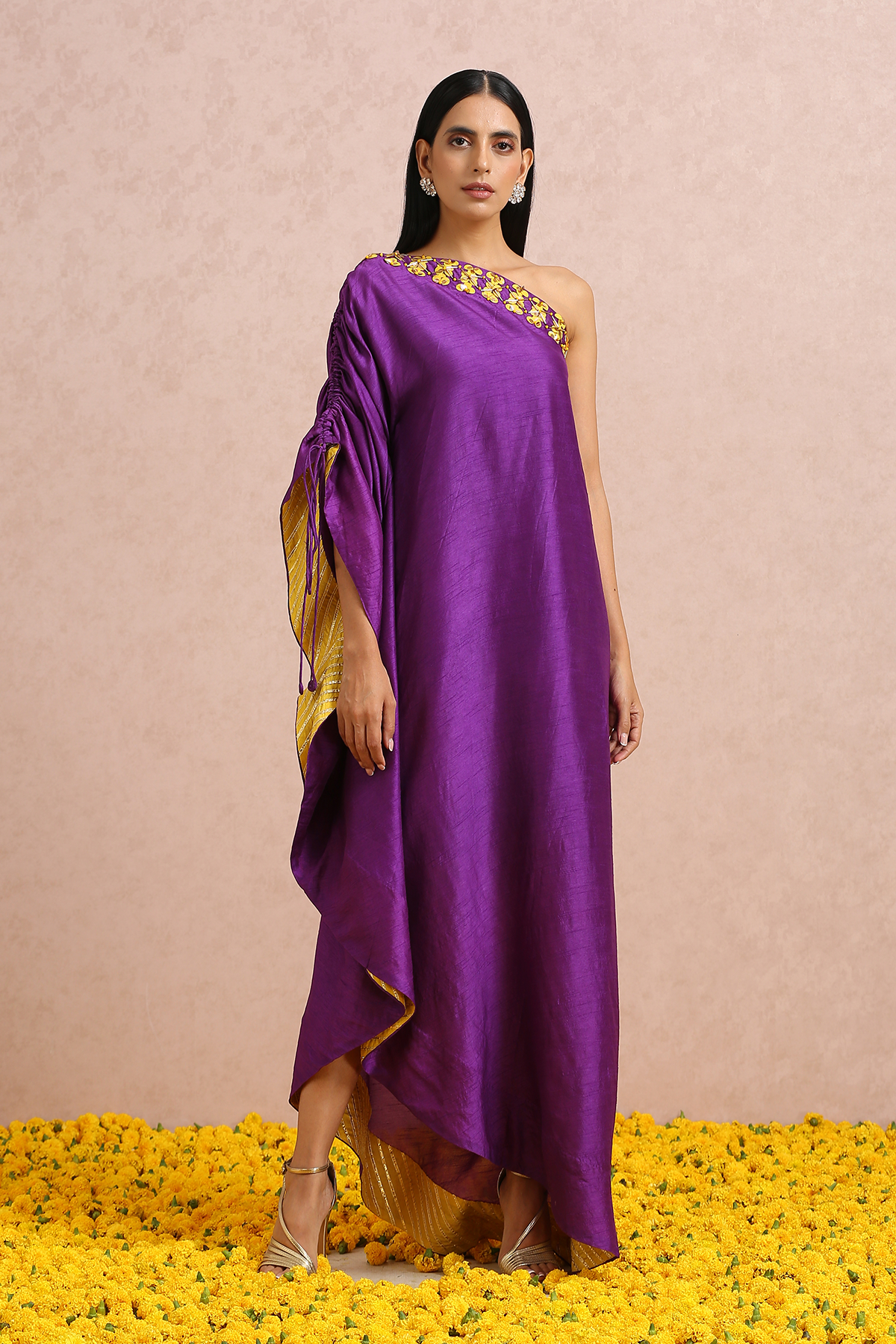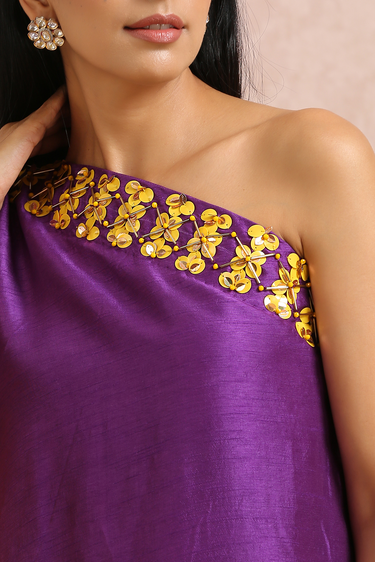 Featuring a plum one shoulder dress with hand embroidered sequins and beads.