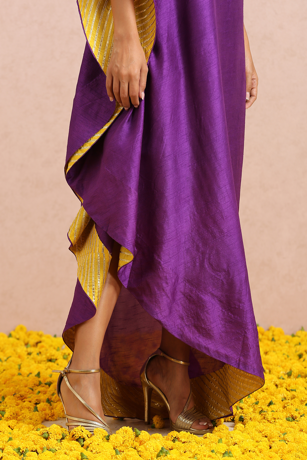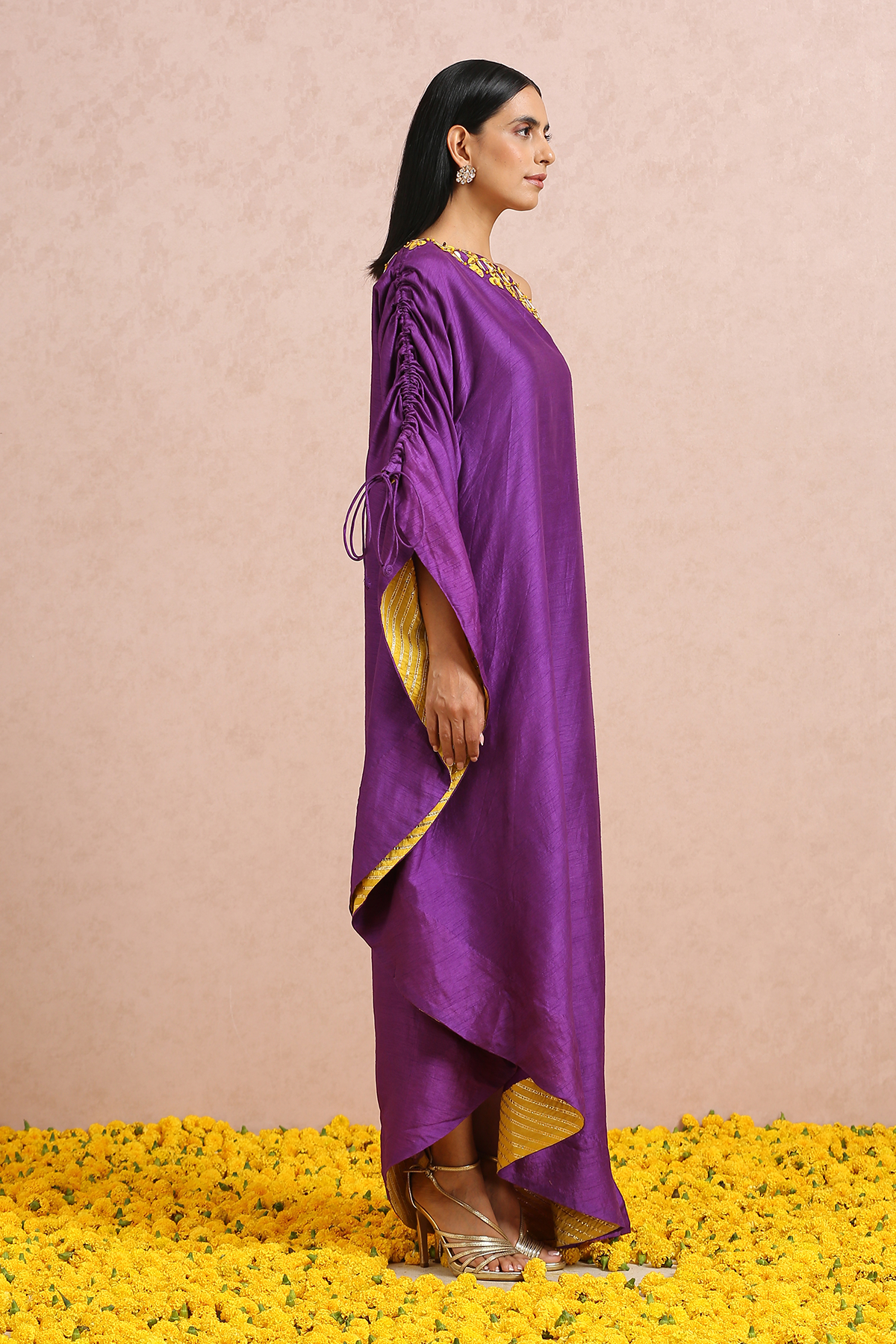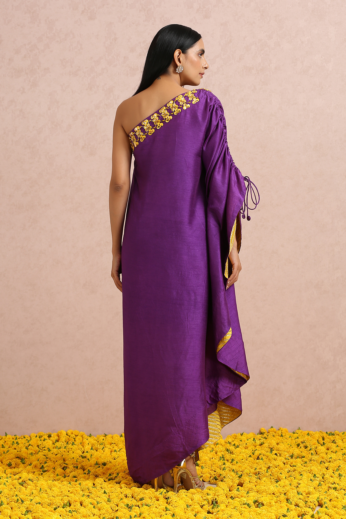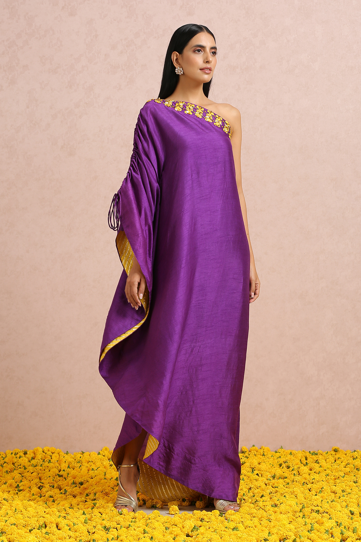 Featuring a plum one shoulder dress with hand embroidered sequins and beads.