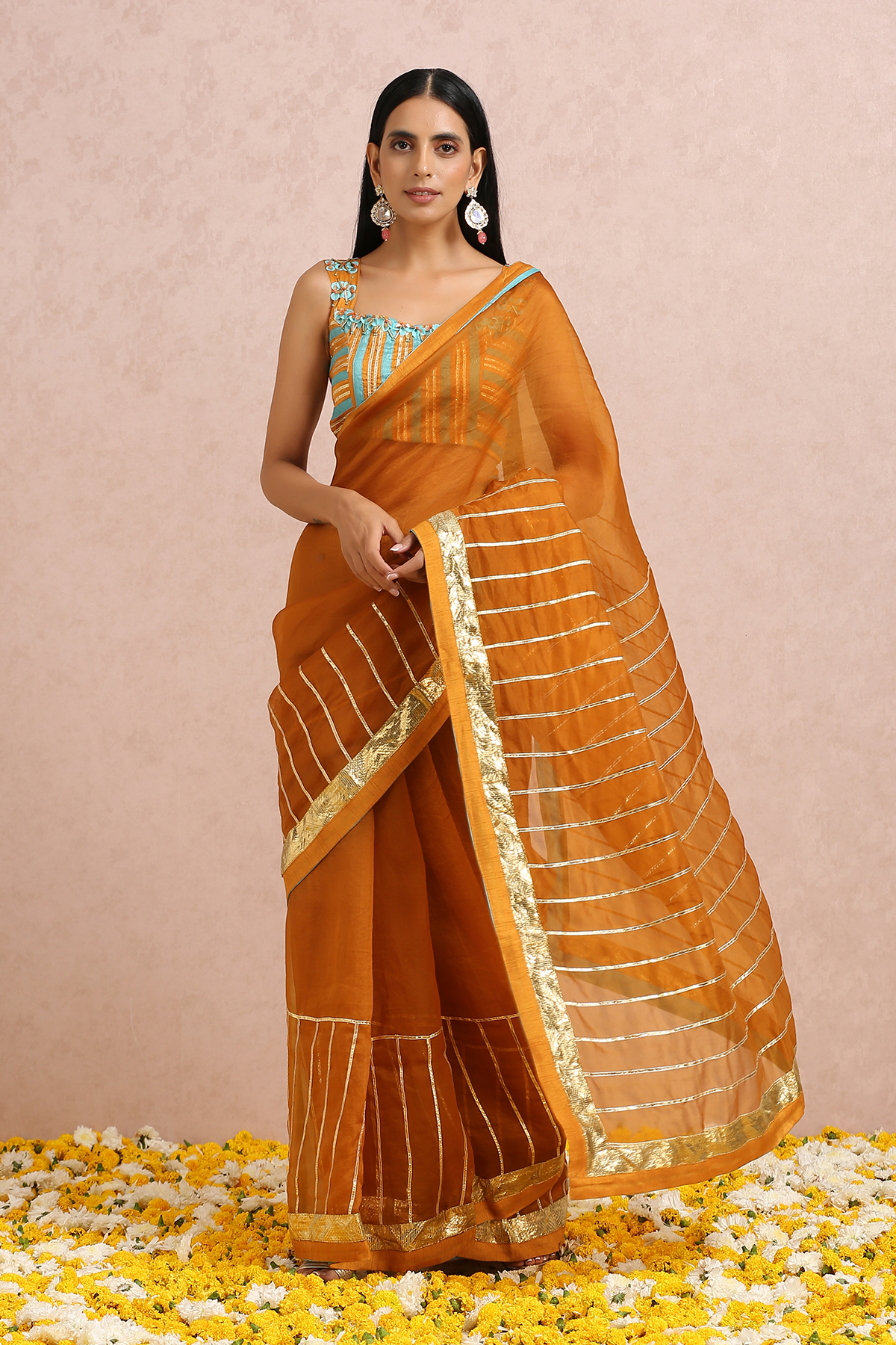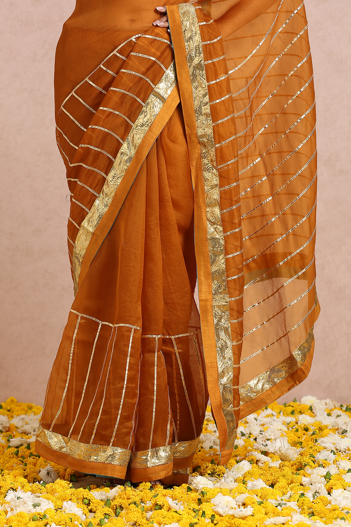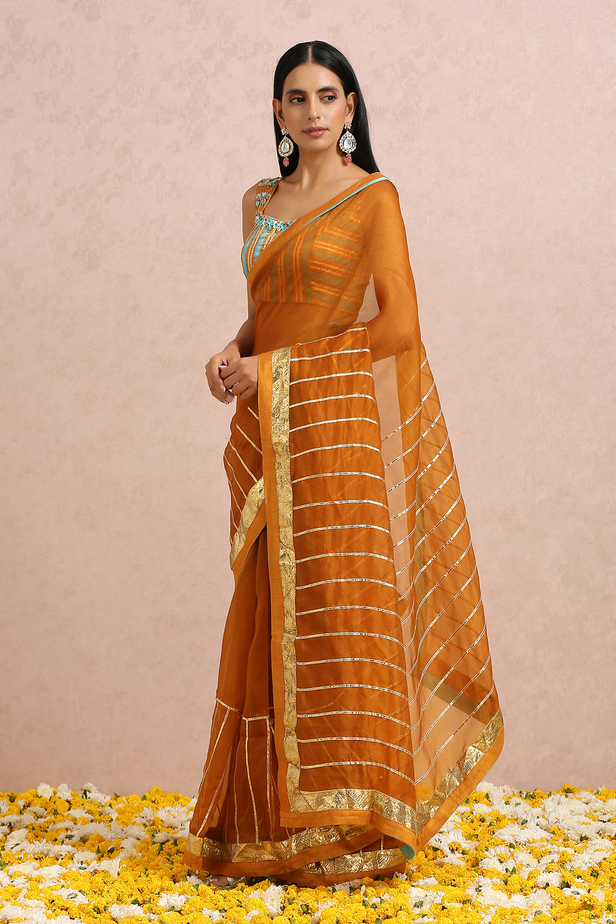 Featuring a rust silk organza saree with gota placements all over. It is paired with a rust sleeveless blouse having gota and hand embroidery.