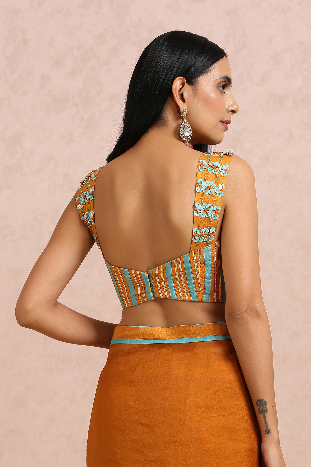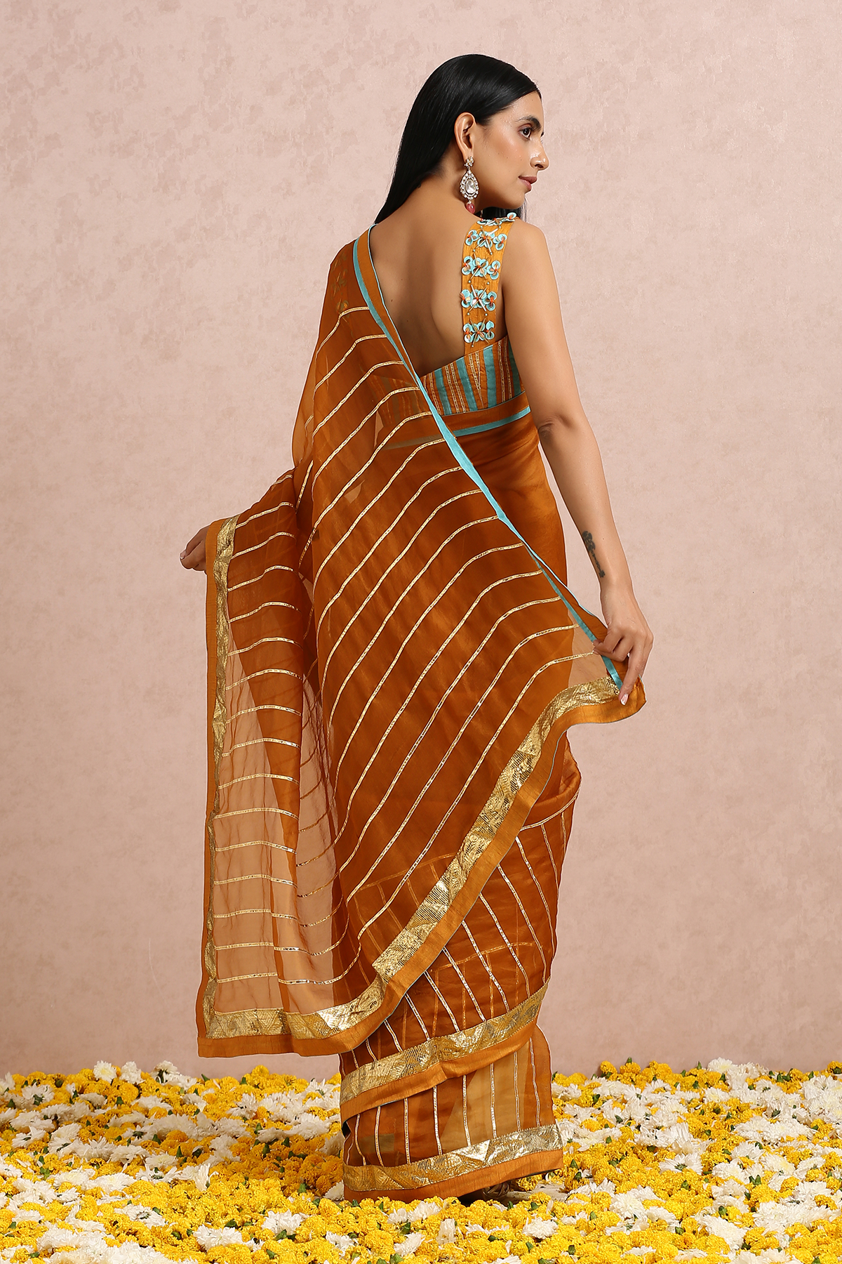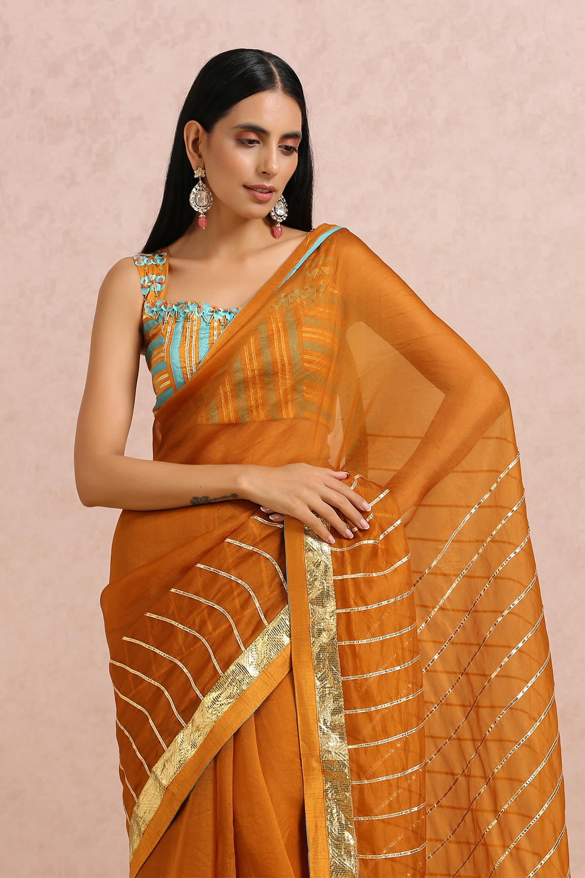 Featuring a rust silk organza saree with gota placements all over. It is paired with a rust sleeveless blouse having gota and hand embroidery.