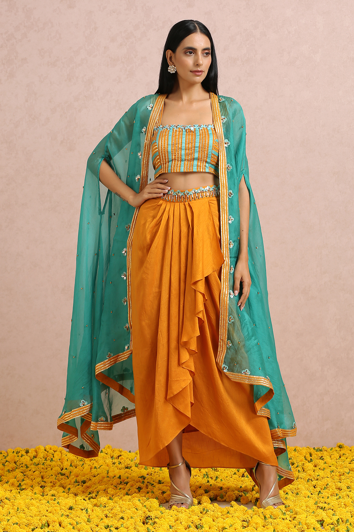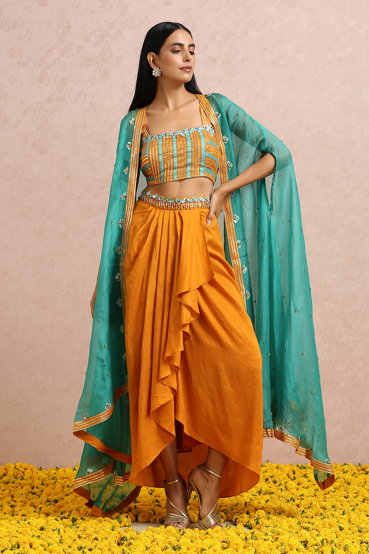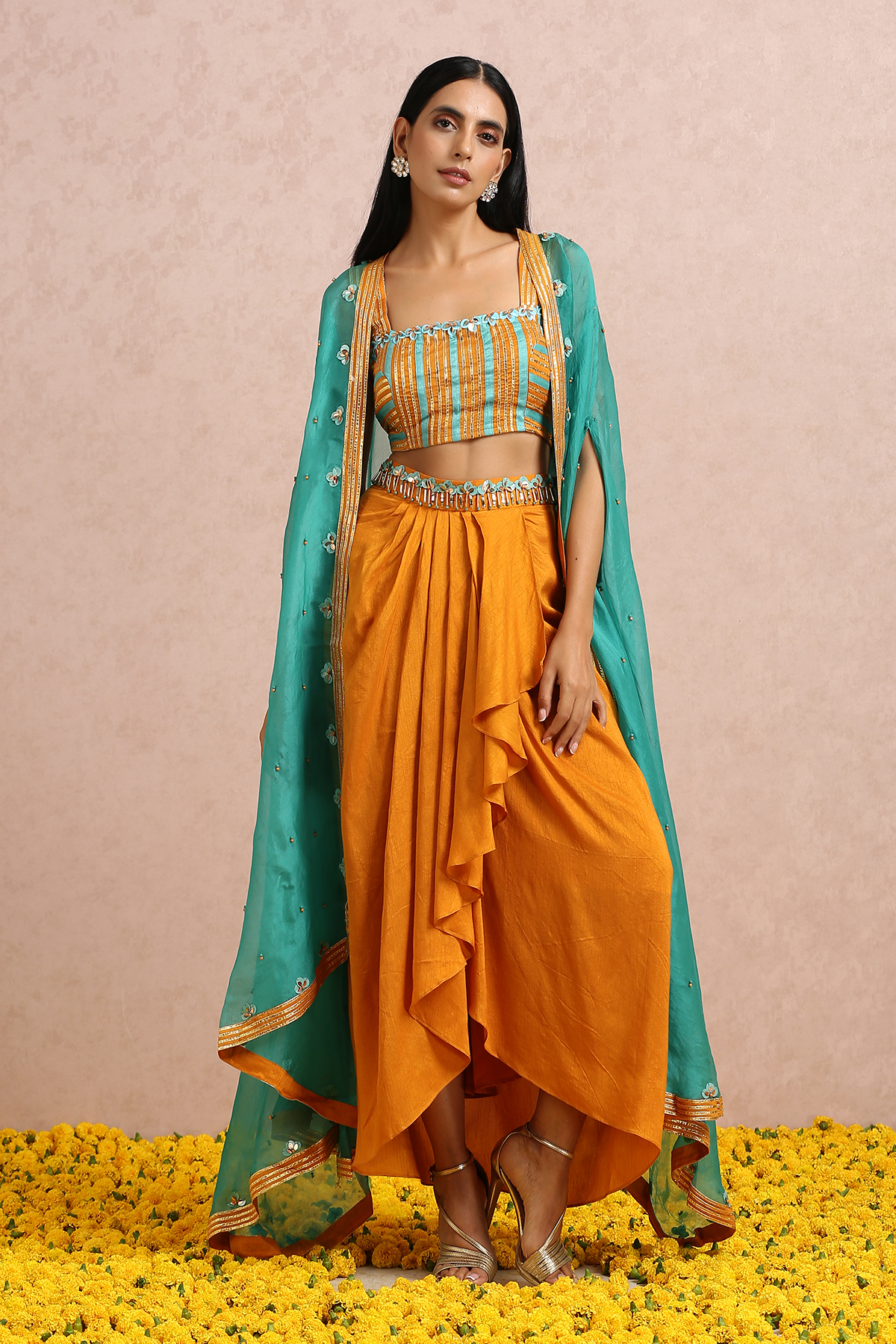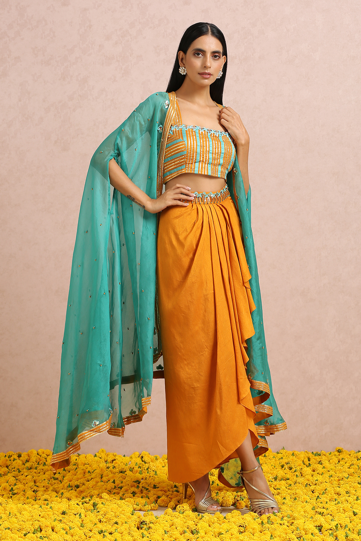 This fusion set features a rust embellished top and dhoti with an embroidered belt.To add a modern twist,it has a teal embroidered silk organza cape.