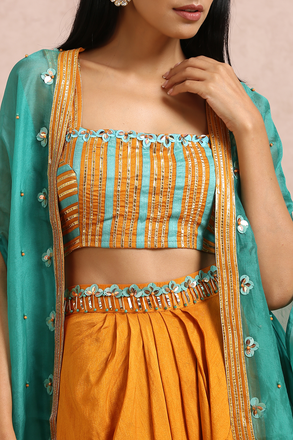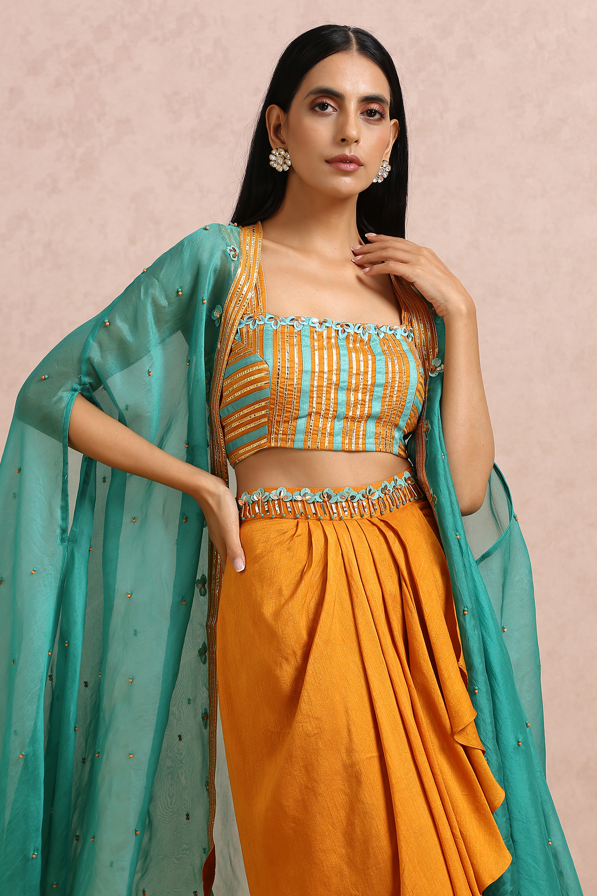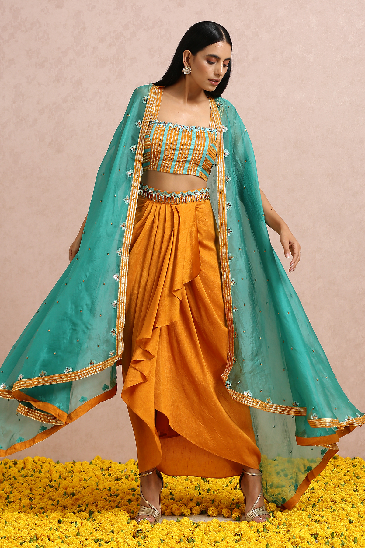 This fusion set features a rust embellished top and dhoti with an embroidered belt.To add a modern twist,it has a teal embroidered silk organza cape.