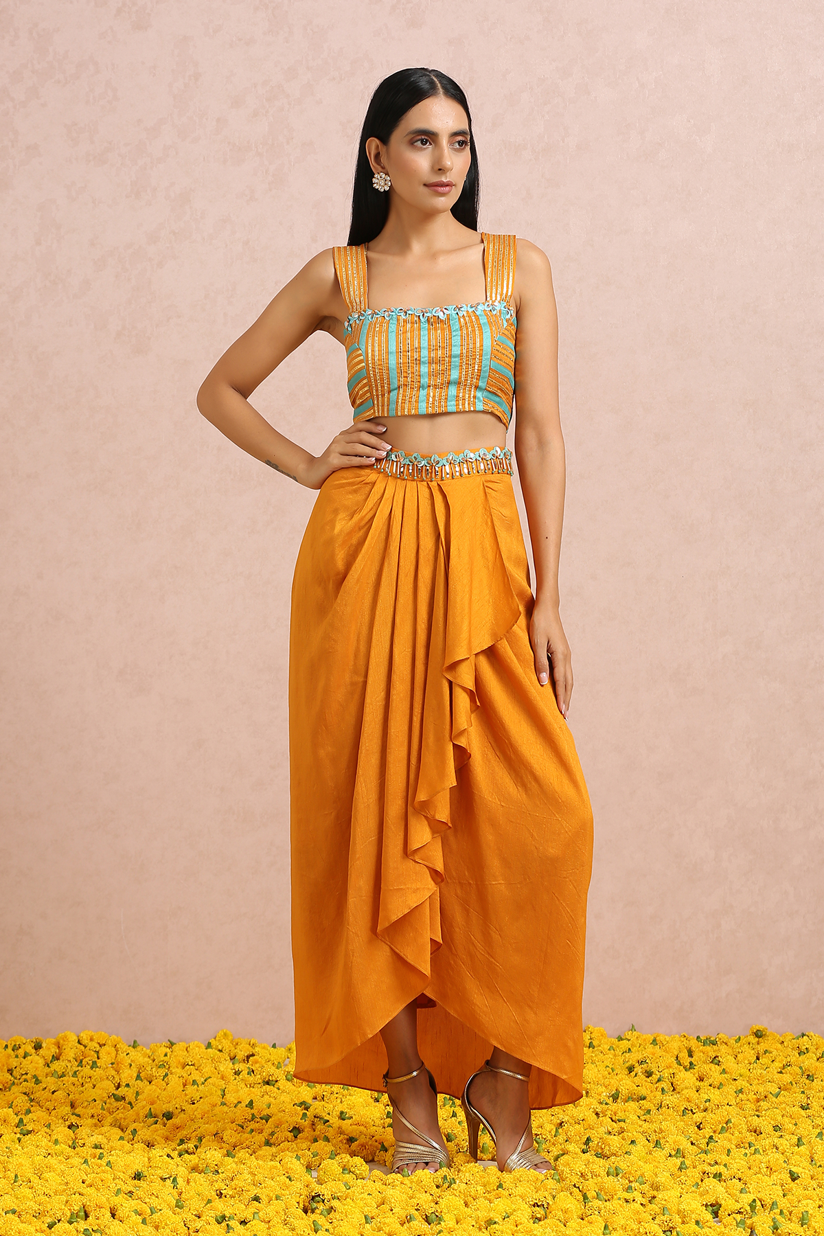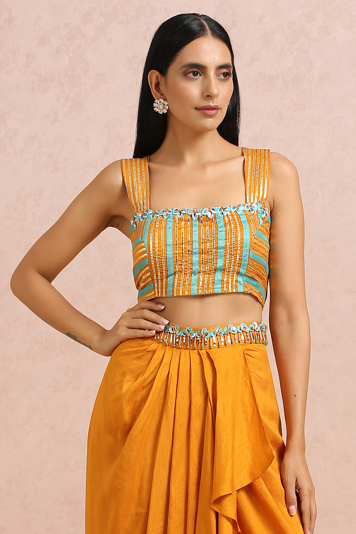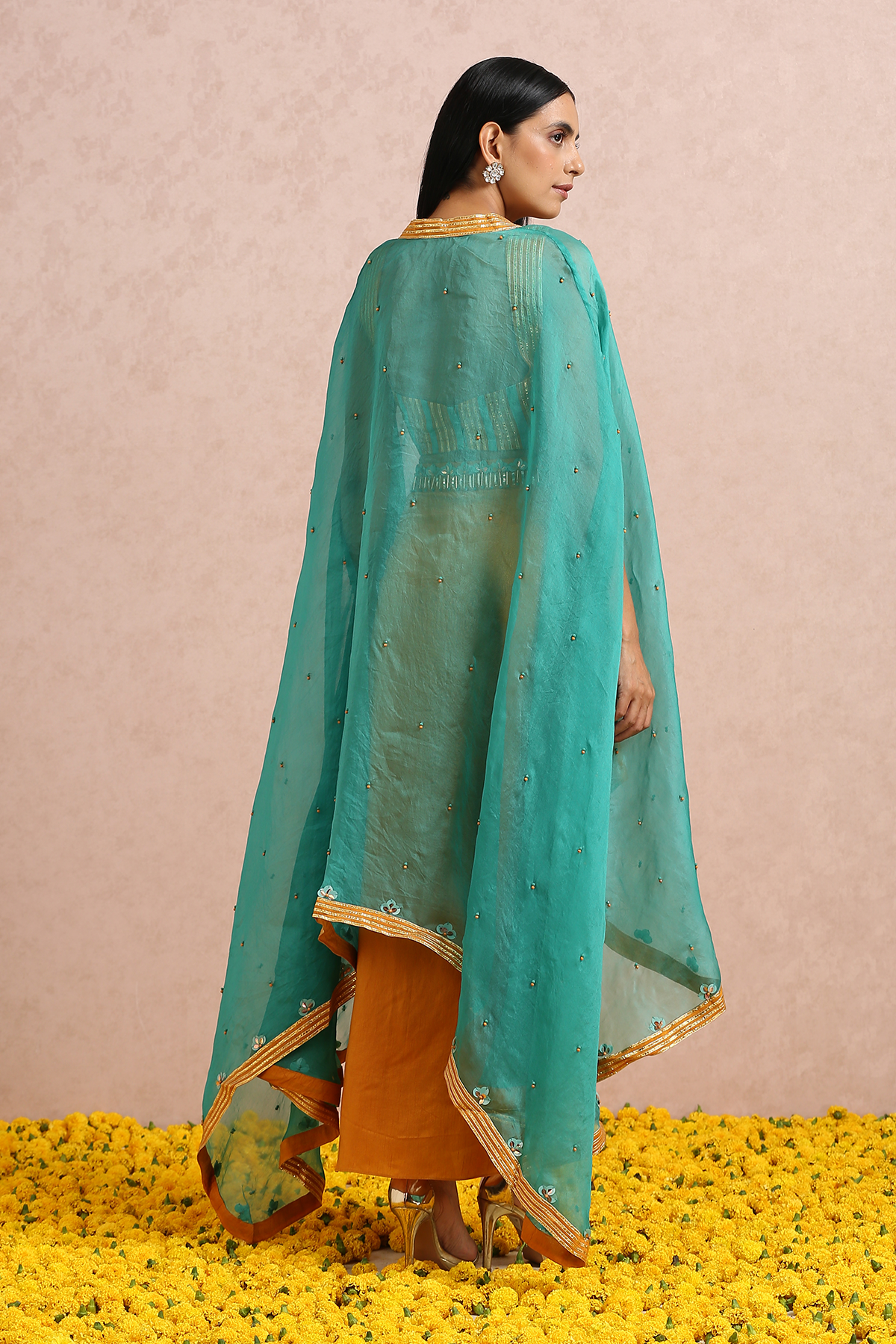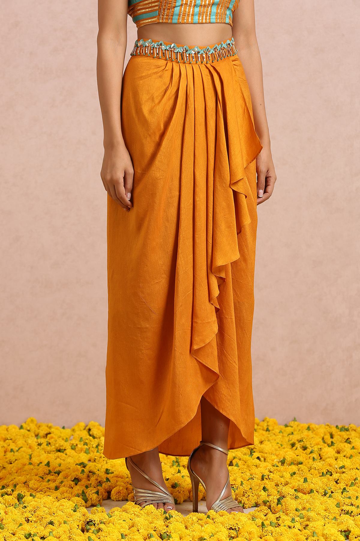This fusion set features a rust embellished top and dhoti with an embroidered belt.To add a modern twist,it has a teal embroidered silk organza cape.