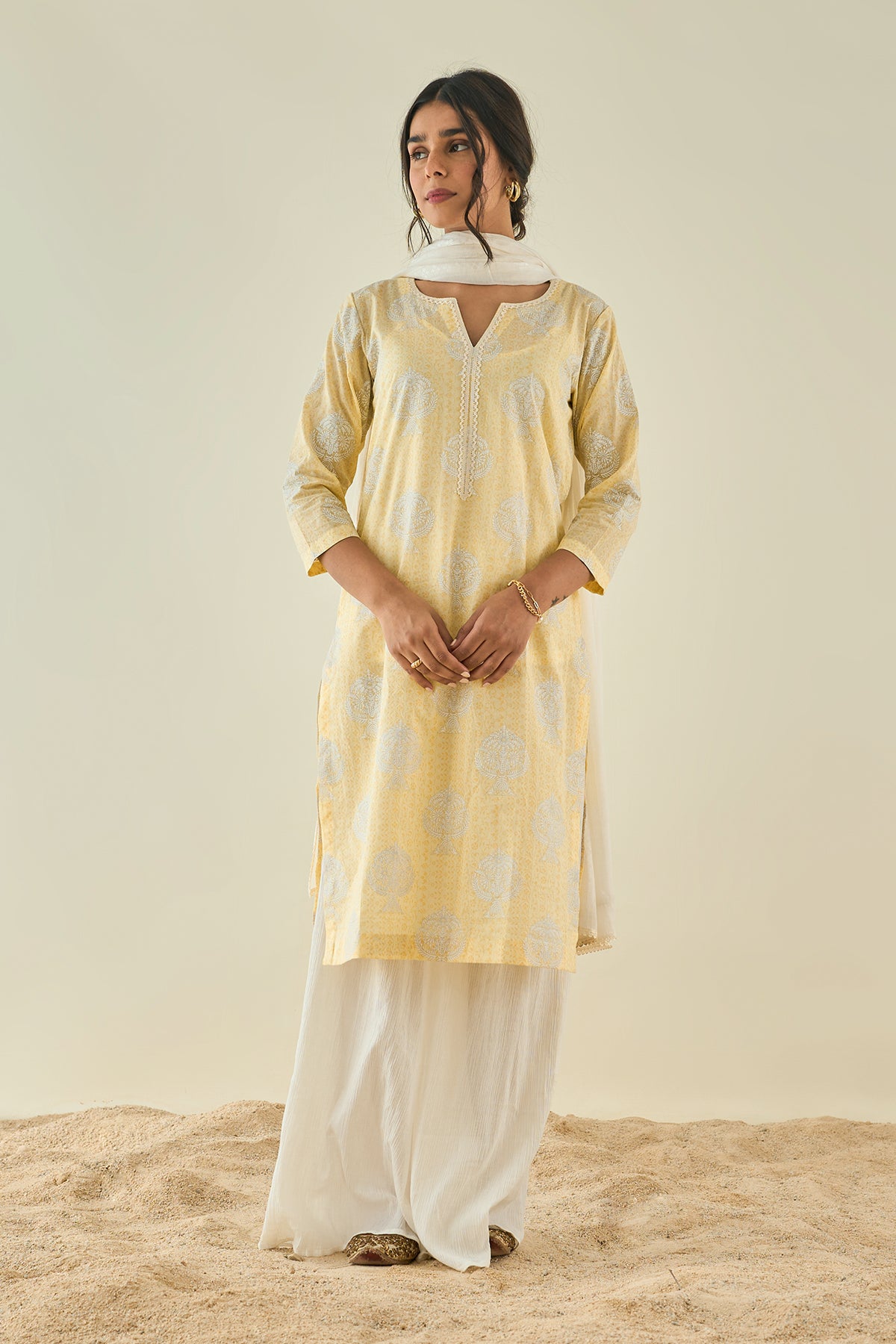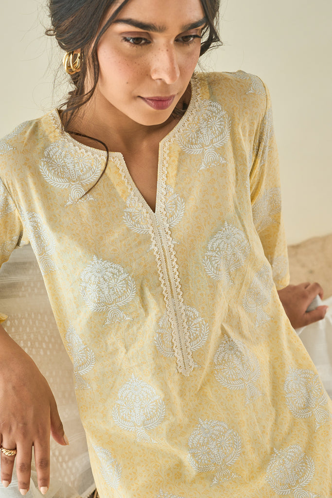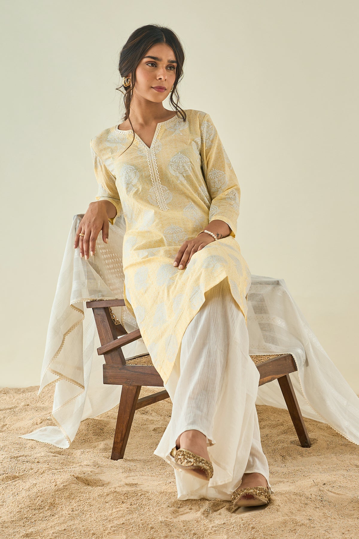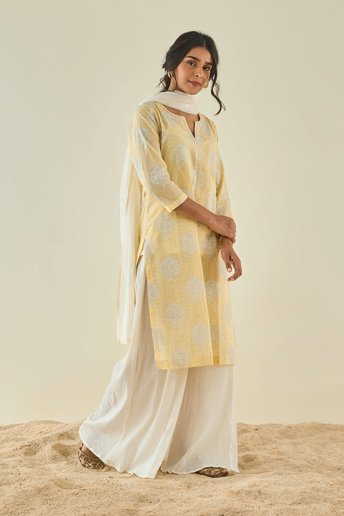 Our dazzling light yellow printed cotton kurta with laced neck twined along with white wrinkled white shrara and self cotton laceddupatta.