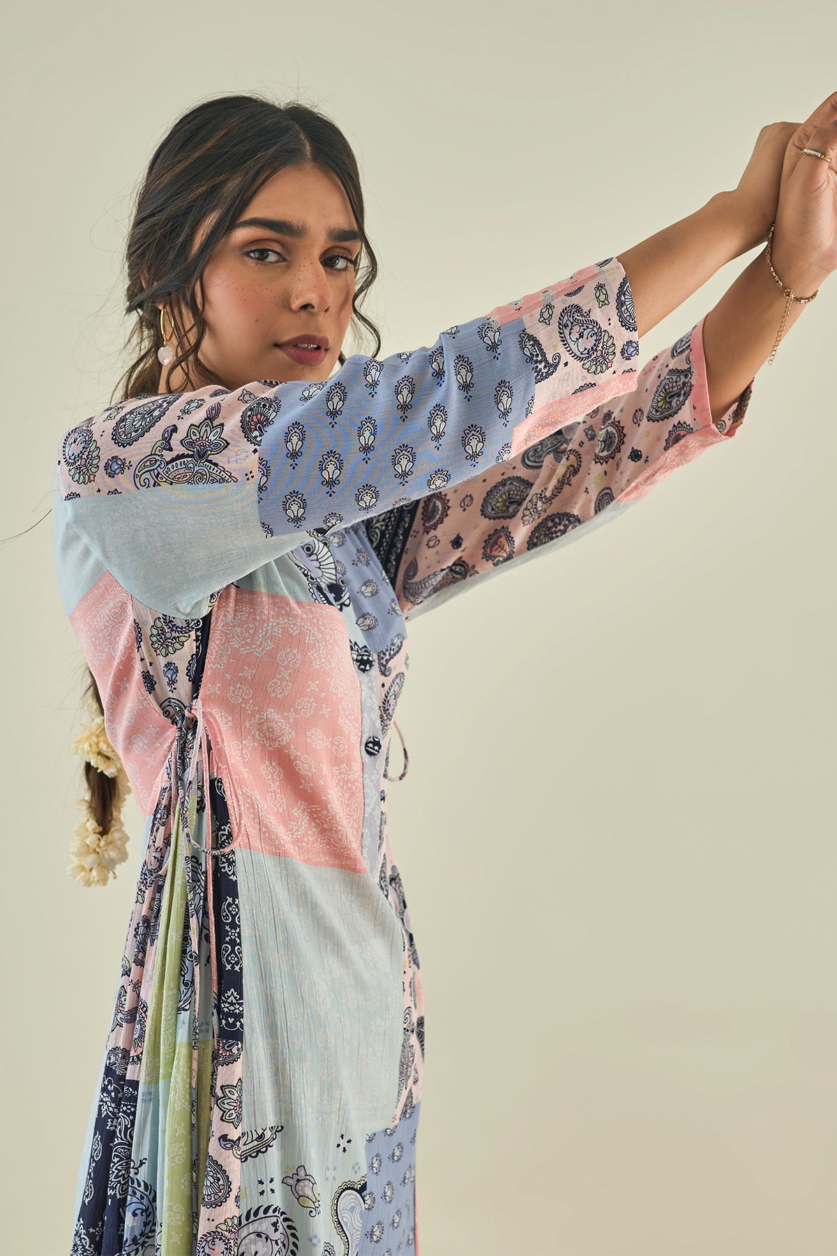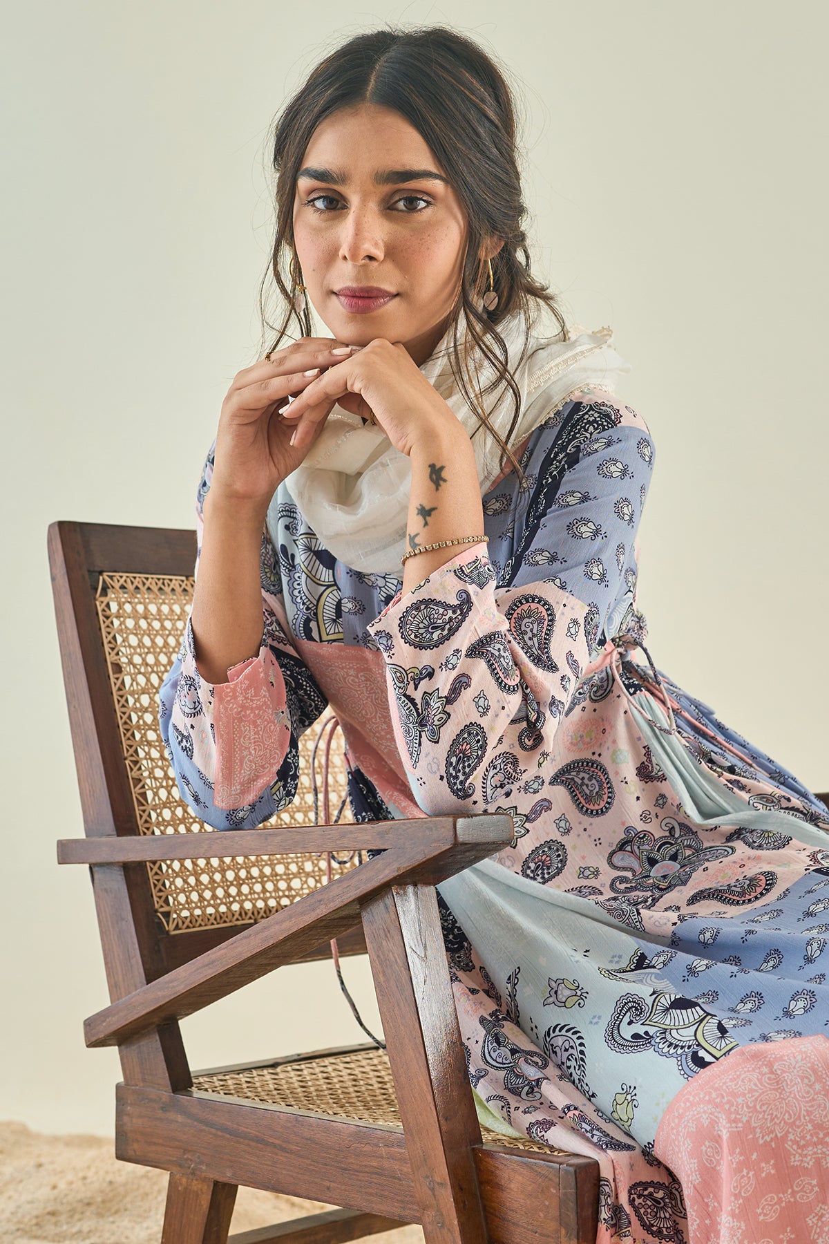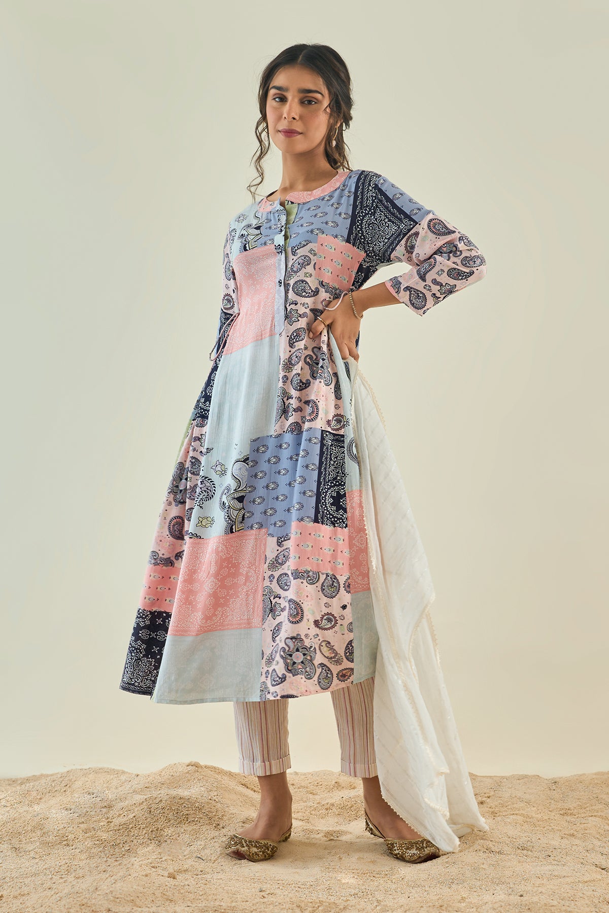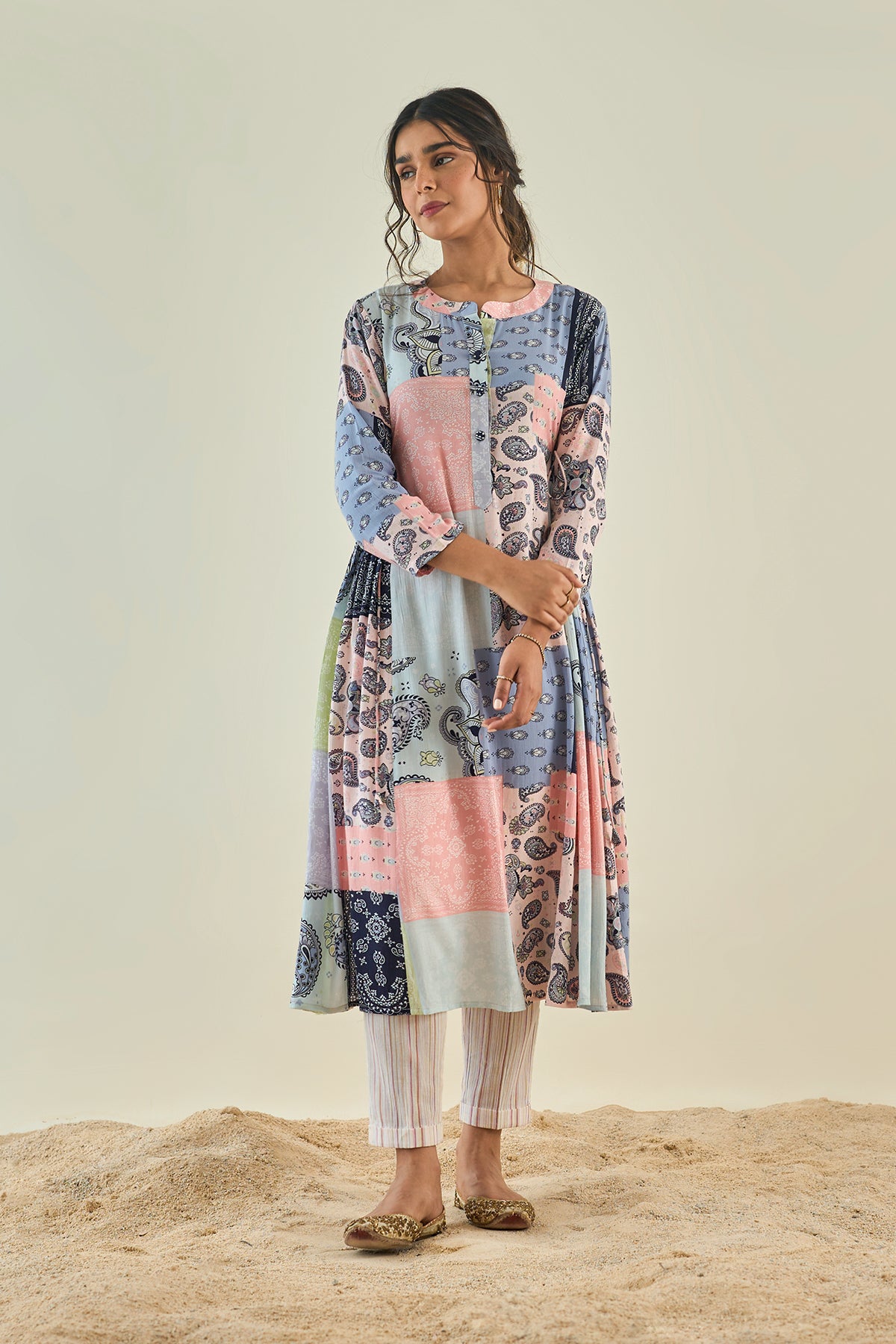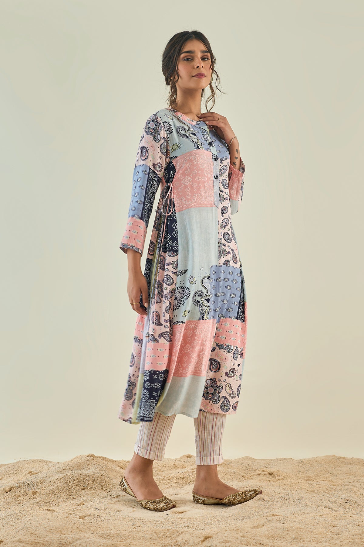Our cheerfully printed cotton kurta with side gathers tagged along with Striped pants and laced stall.