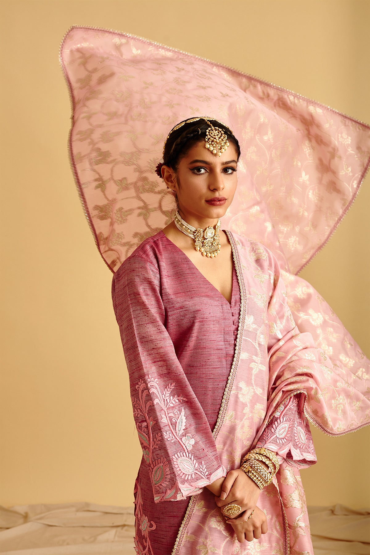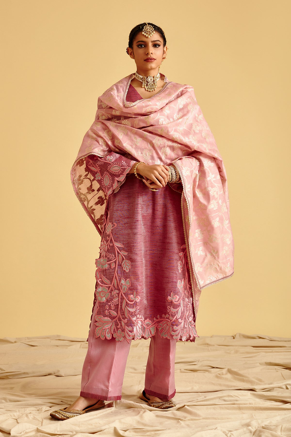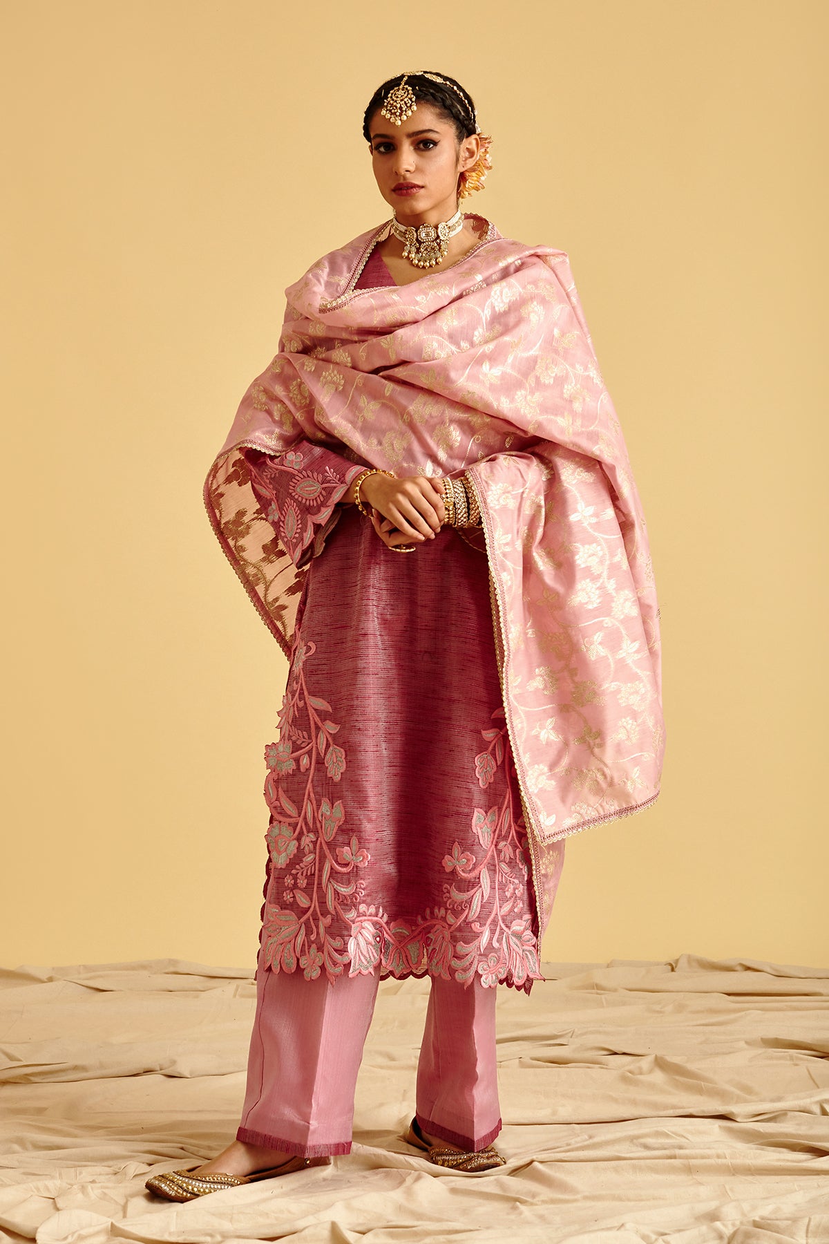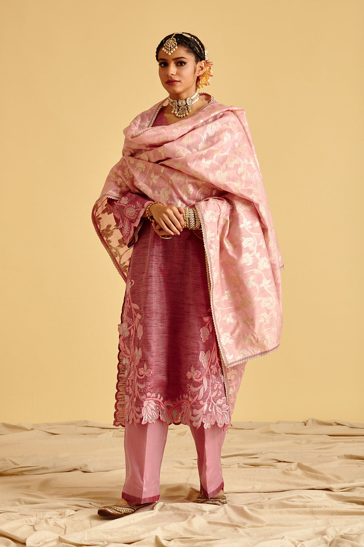 Brocade Shirt with Thread Cut work embroidery on sides ,bottom and sleeves. detailed with potli button on neck combined with brocade purple pants finished with fabric trims. Pair up with chanderi silk all over silver work on it.