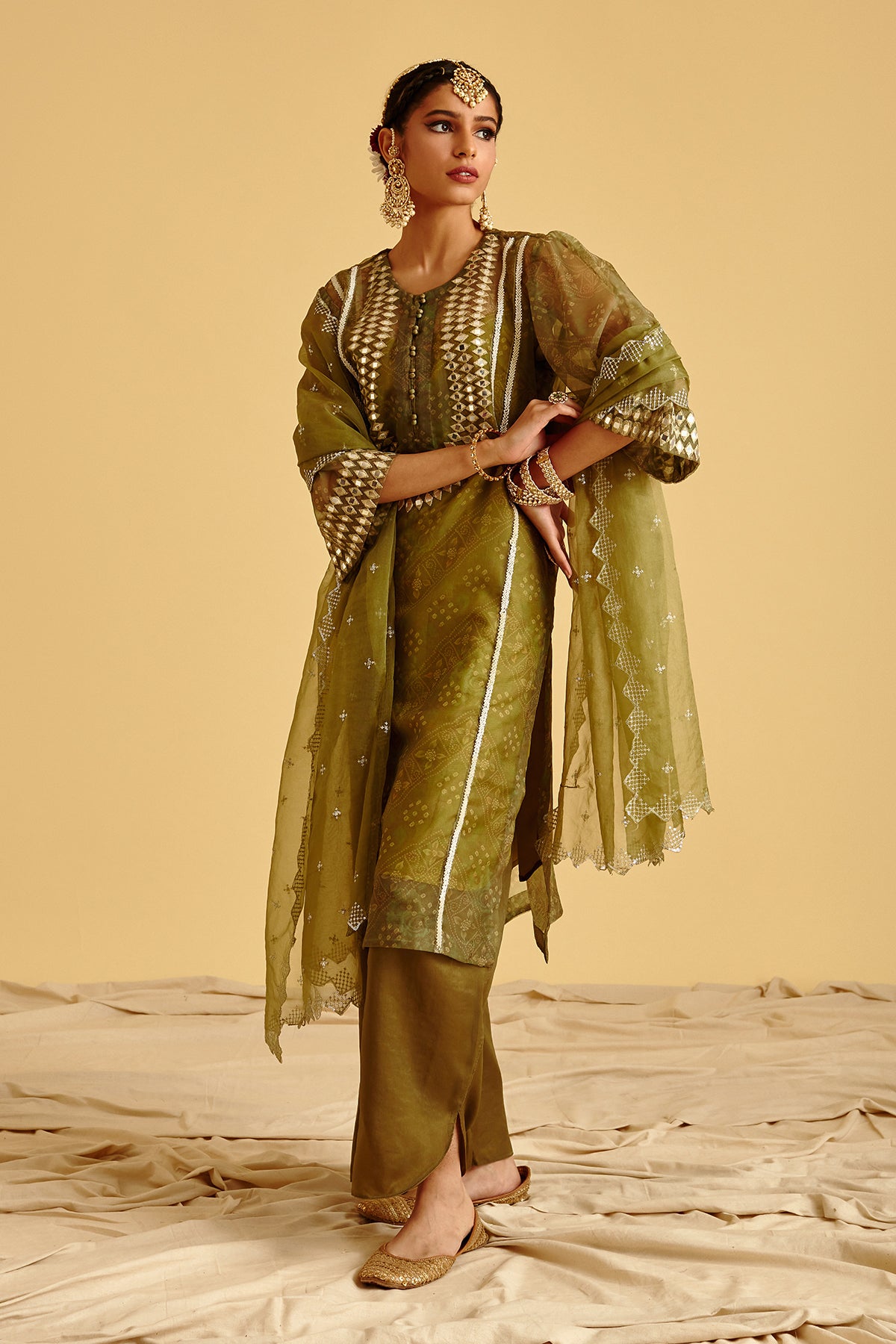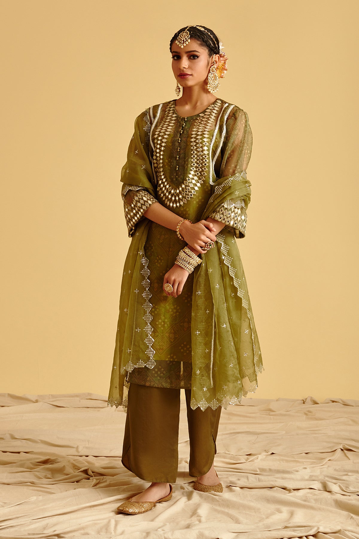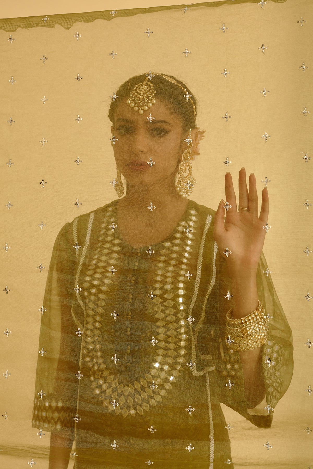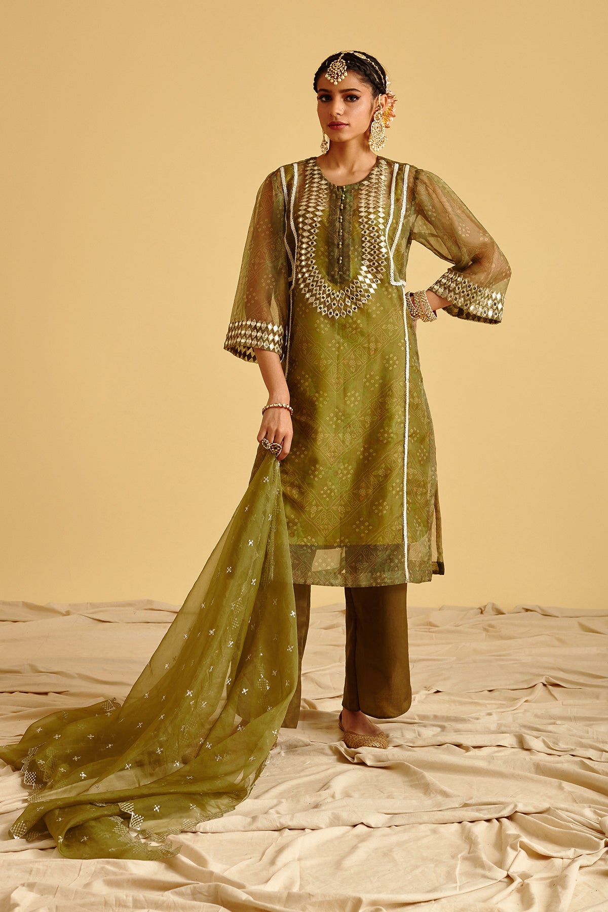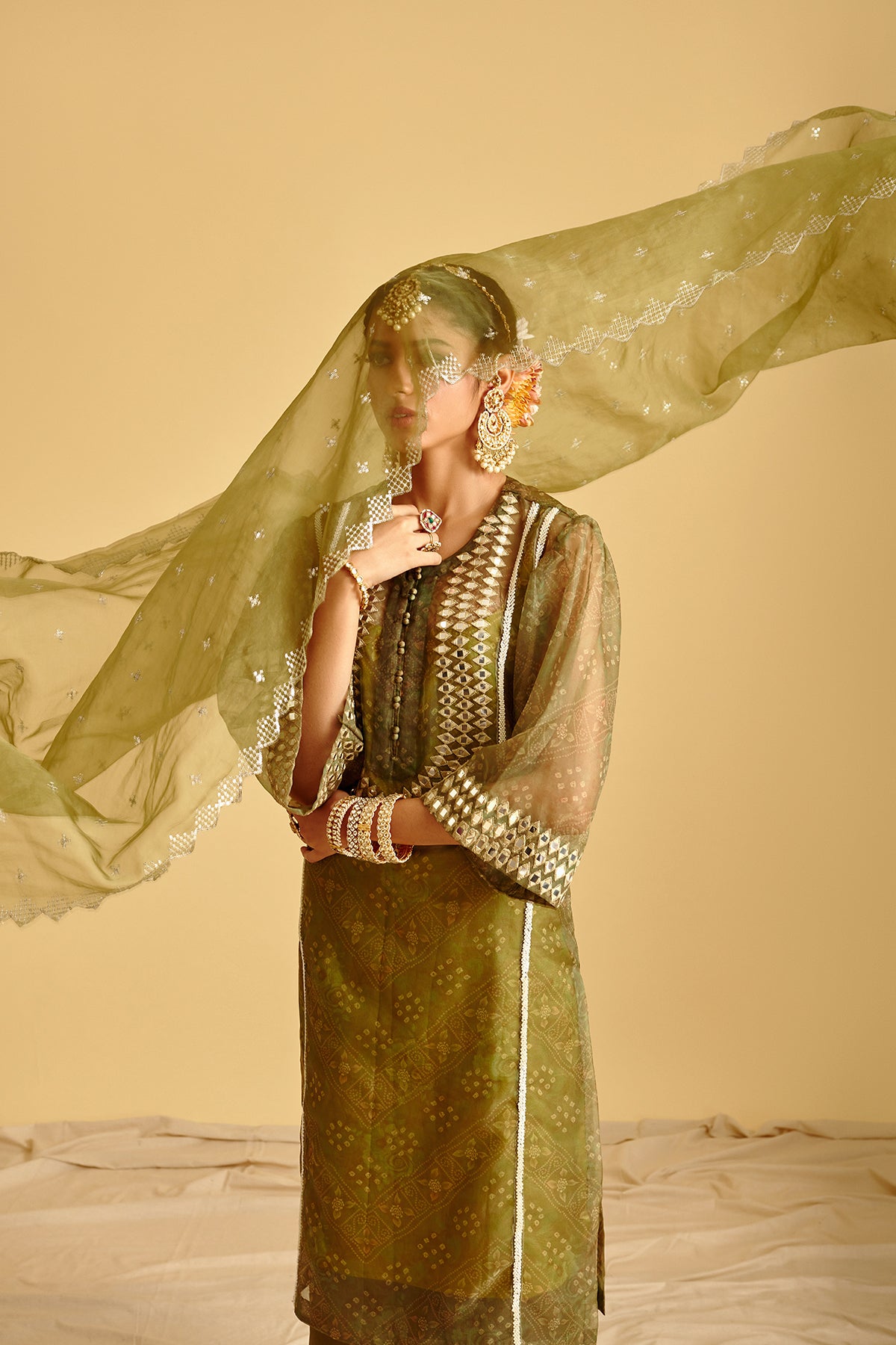 Organza Bandez Print sage green Shirt mirror work on neck and sleeves adorn with intricated hand emb lace detailing Puffed bell sleeves pair up with Organza and Organza Sage green dupatta full sequins embroidery with cut work on borders.
