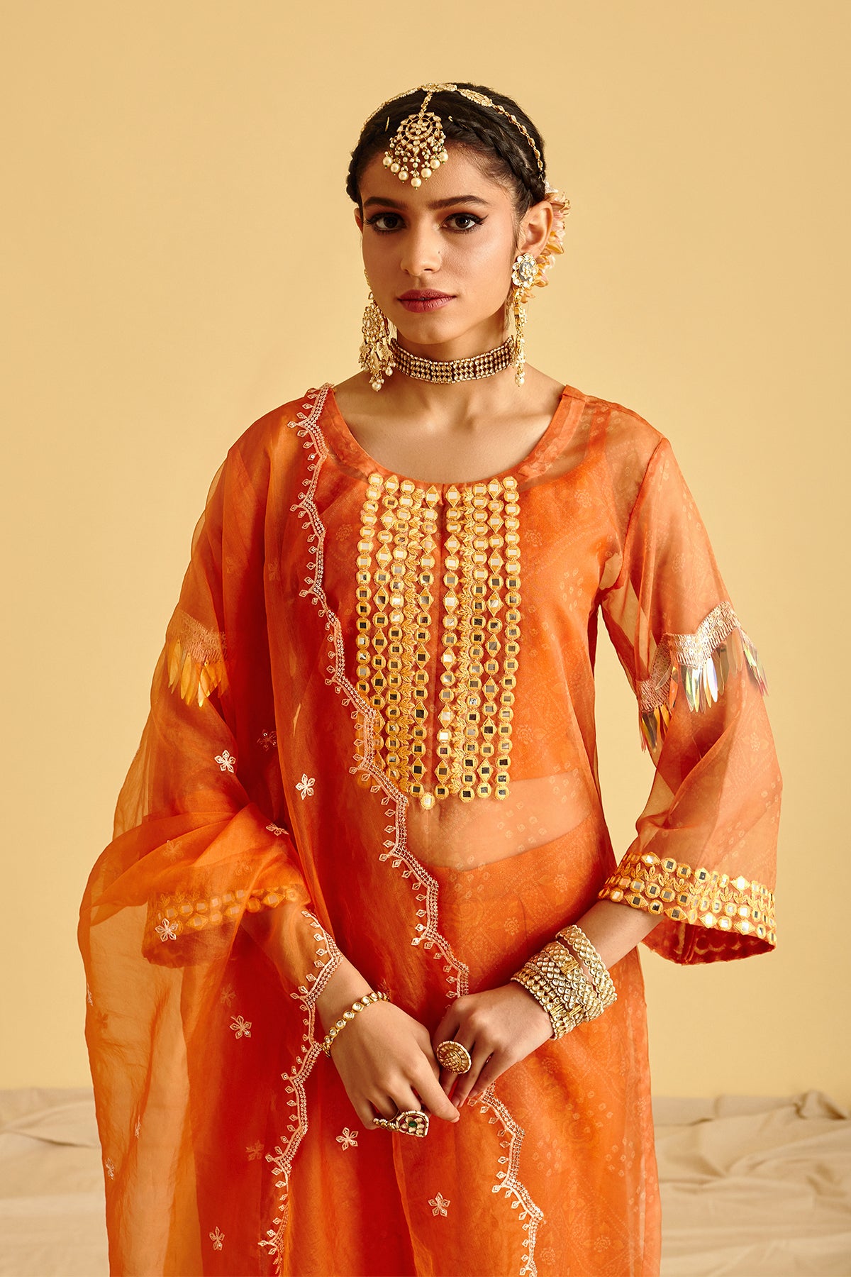 Organza Bandez Print Tangerine Orange Shirt mirror work on neck and sleeves adorn with intricated lace pair up with blouse and wide bias cut shrara in shimmer georgette Dupatta is in sequins cut work dupatta in pastel orange colour.