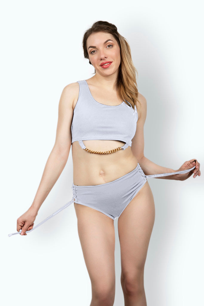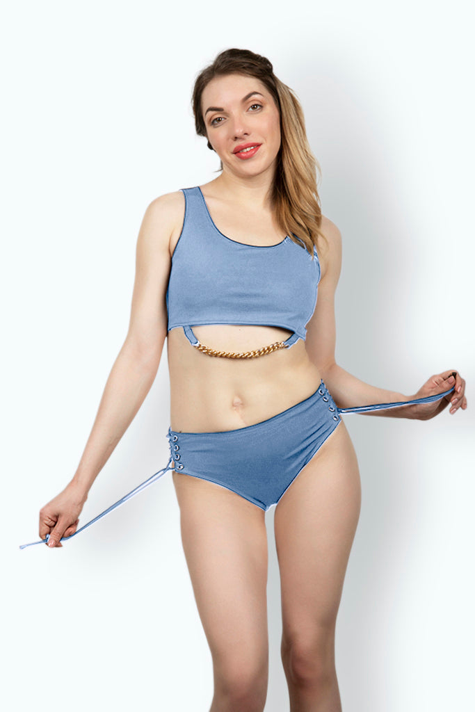 Tyche Bikini is a flawless, sexy top with a bikini bottom. It brings a flattering look. Mid-age girls/women can definitely pick this style for their beach vacation, pool party. This bikini is perfect for apple-shaped girls. Apple-shaped women/girls have heavy tops and they must pick V-neck, Tyche bikini that will bring a narrow waist illusion. Are you looking for an elegant lady-like swimsuit, then a swim dress is just made for you. The chain and side lace of a swimsuit with a dress make it unique and flirty at the same time. This fashionable bikini is perfect for aqua aerobic and swimming as it is comfortable and sassy too. Women who are blessed with hourglass body shape can definitely choose the Tyche bikini set. The patterns that would make you look fashionable and hot are the color block fashion, solid plane V-neck, halter neckline bikini paired with a solid shade bikini bottom.