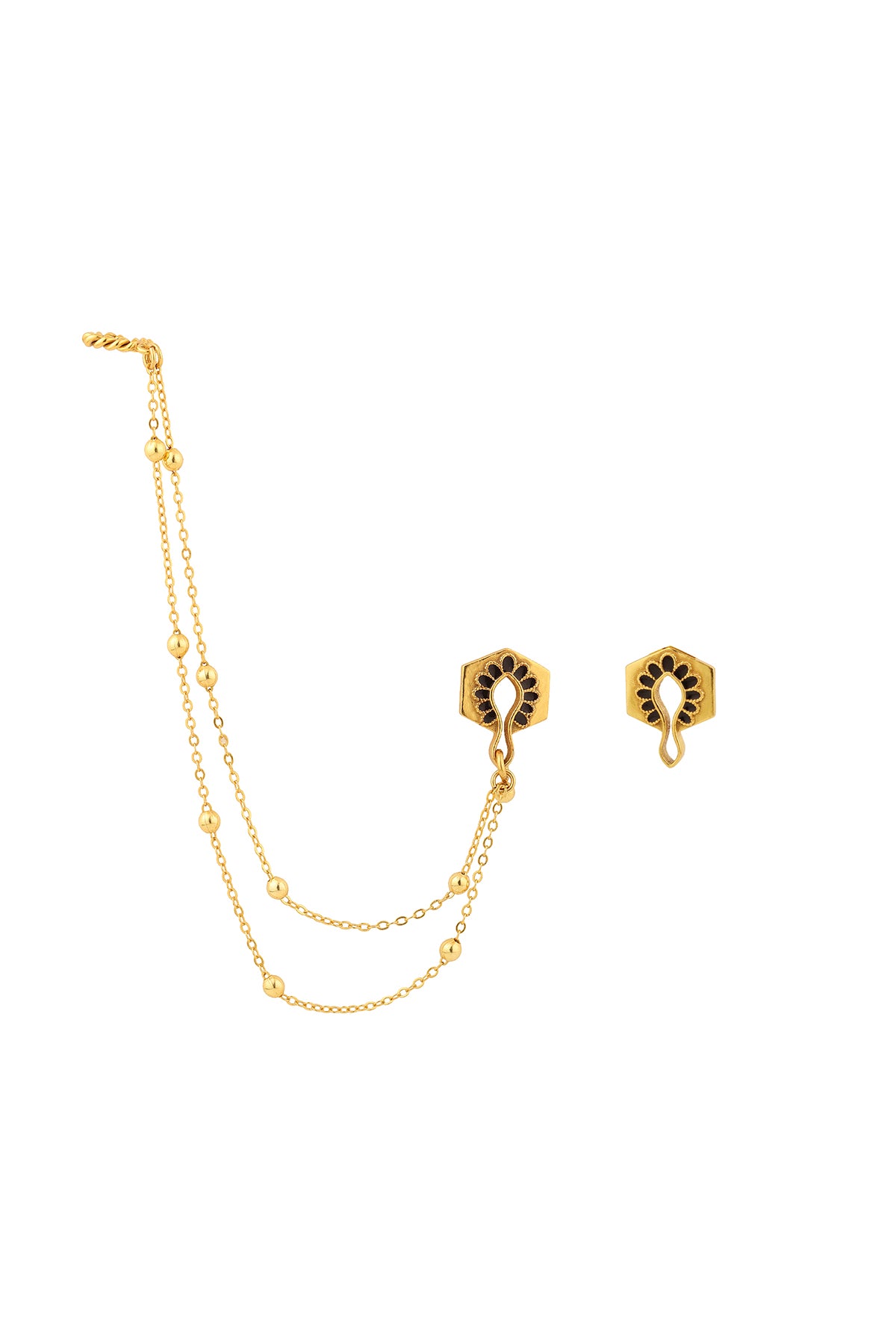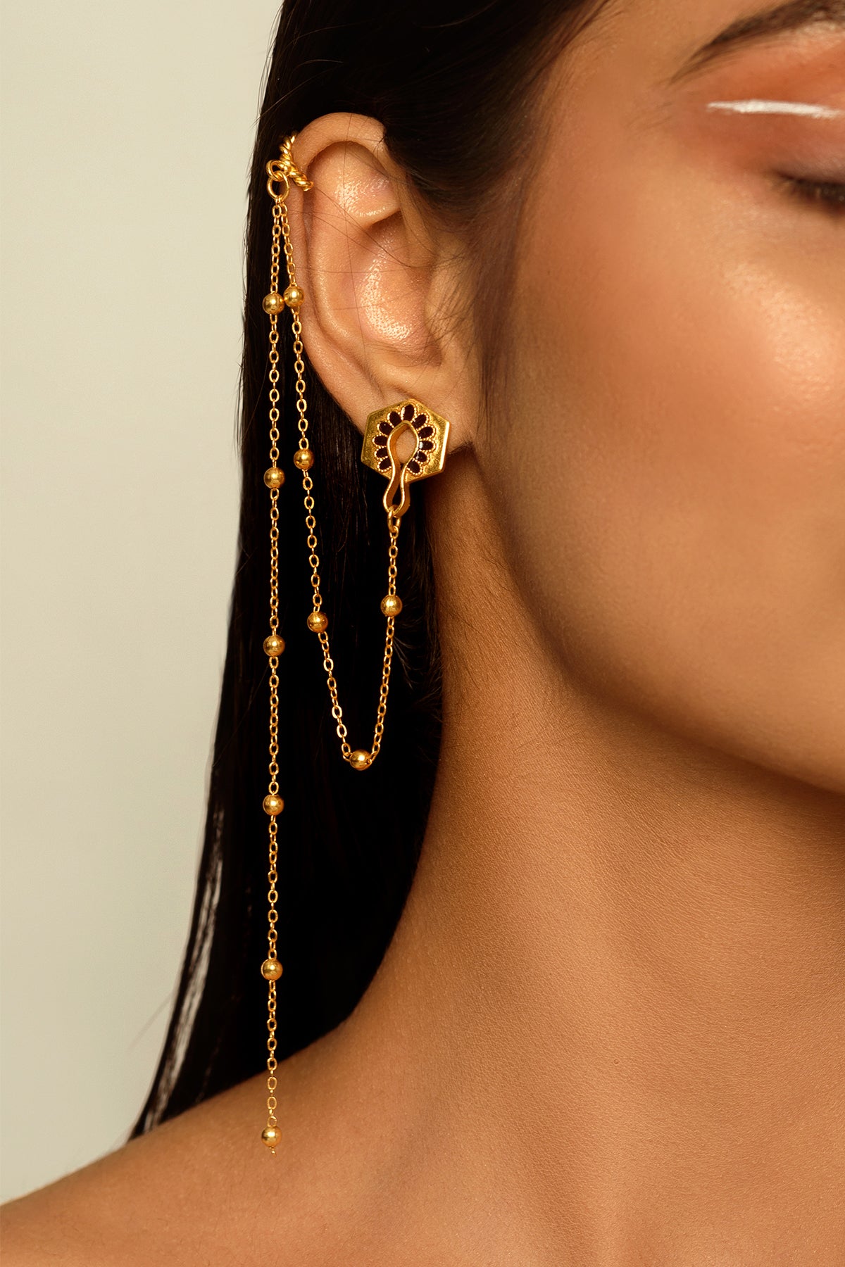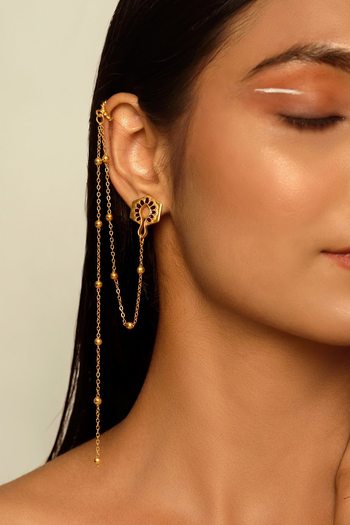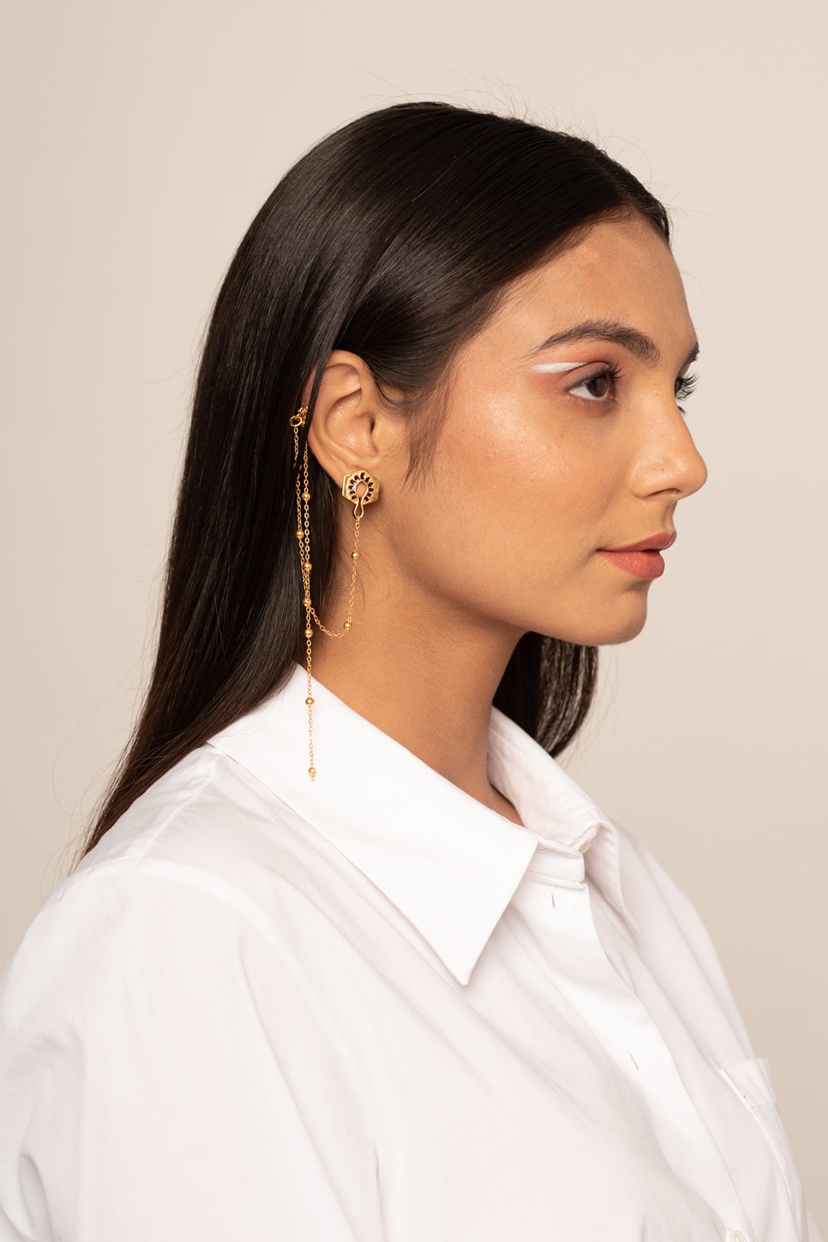This is a pair of assymetric earrings with one side as a stud, and the other side with an attached drop chain that can be placed on the helix.