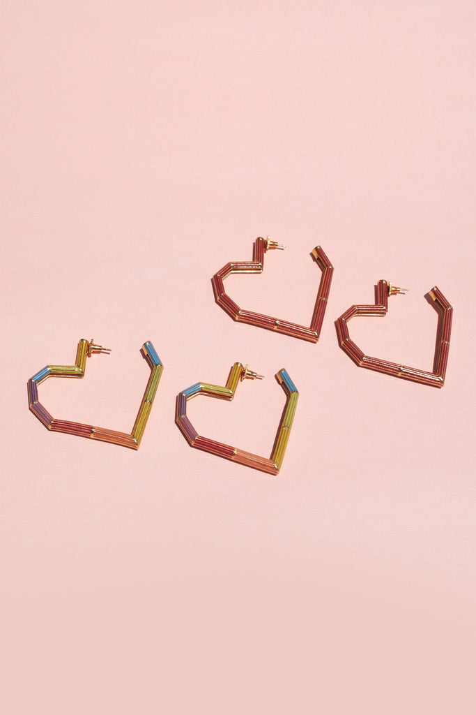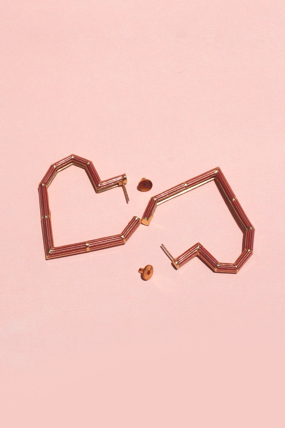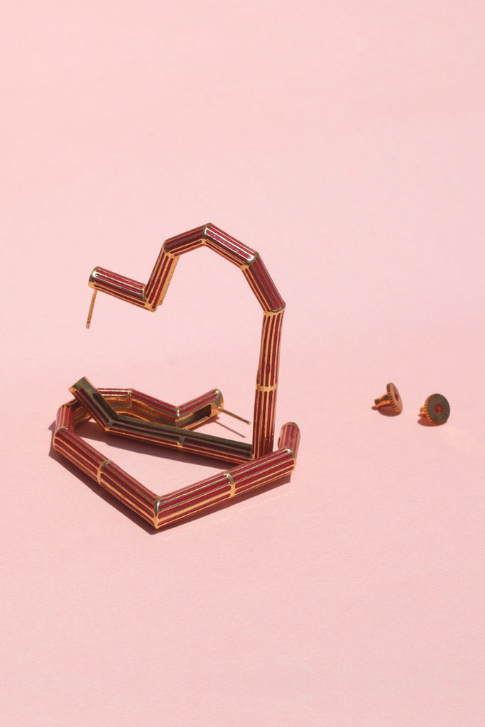 Introducing the heart earrring inspired by artwork of Eva Rothschild. precisely handcrafted, dressed in 22kt gold plating and red enamel, Adorn this piece of jewel and style it in endless ways.