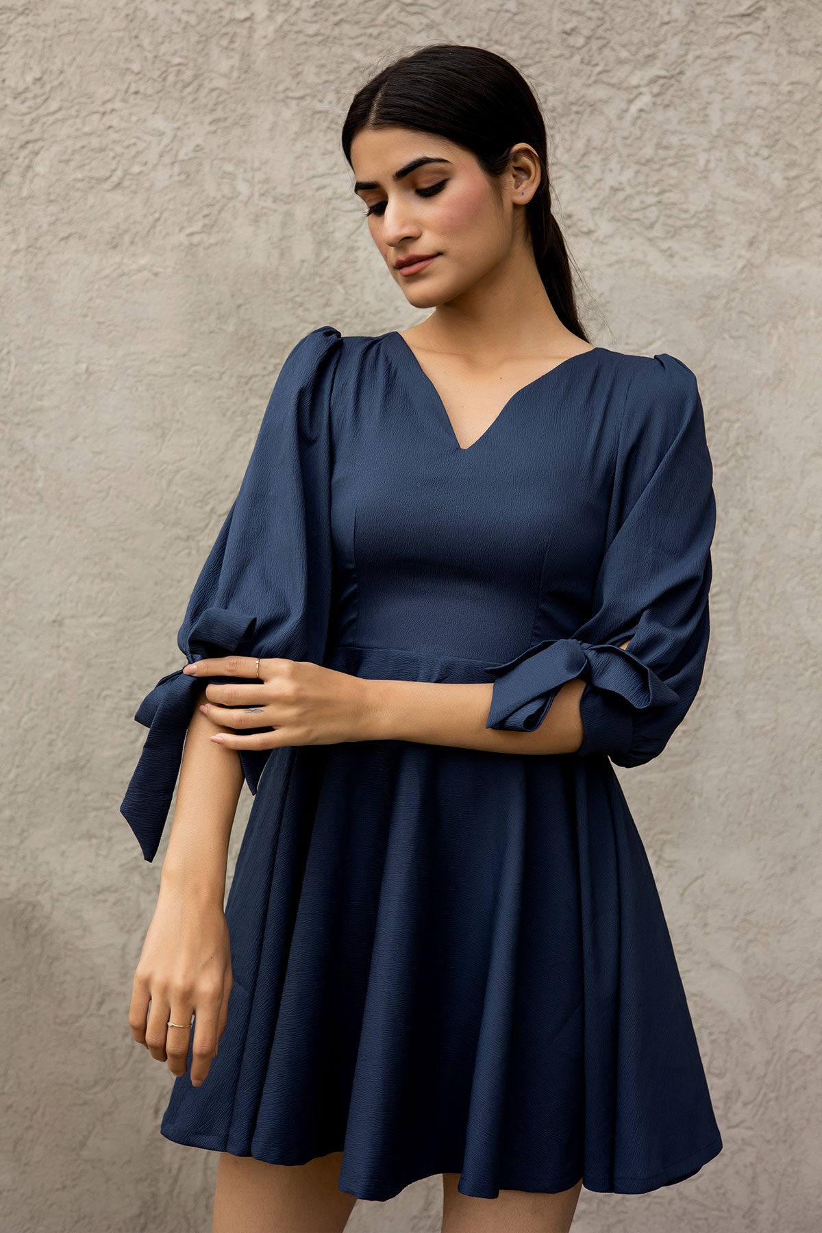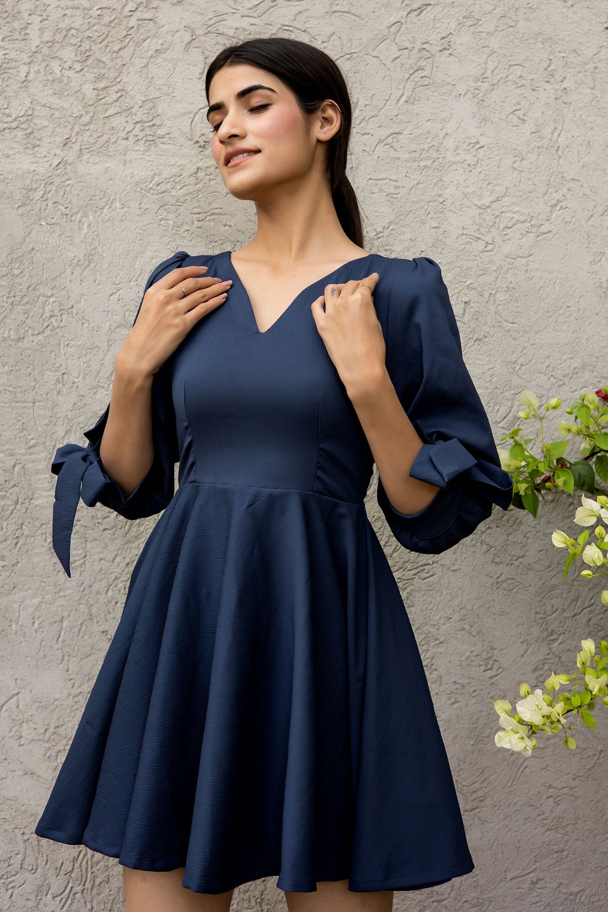This cobalt blue color dress has V-neck & elbow length knotted sleeves with puffed shoulder. It's a crepe fabric made short flared dress with umbrella cut. A perfect choice for being woman of a party or for a picnic plan.