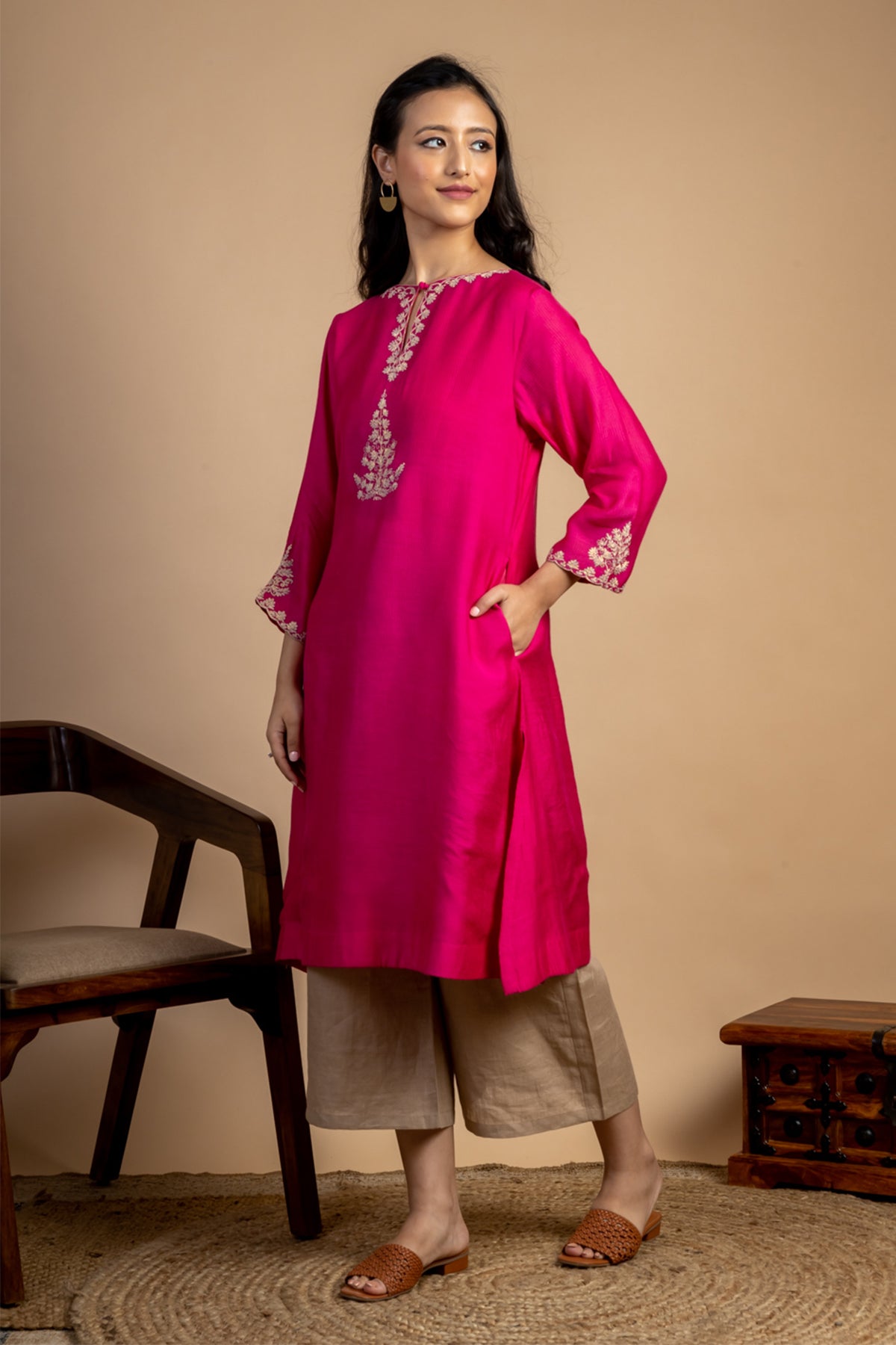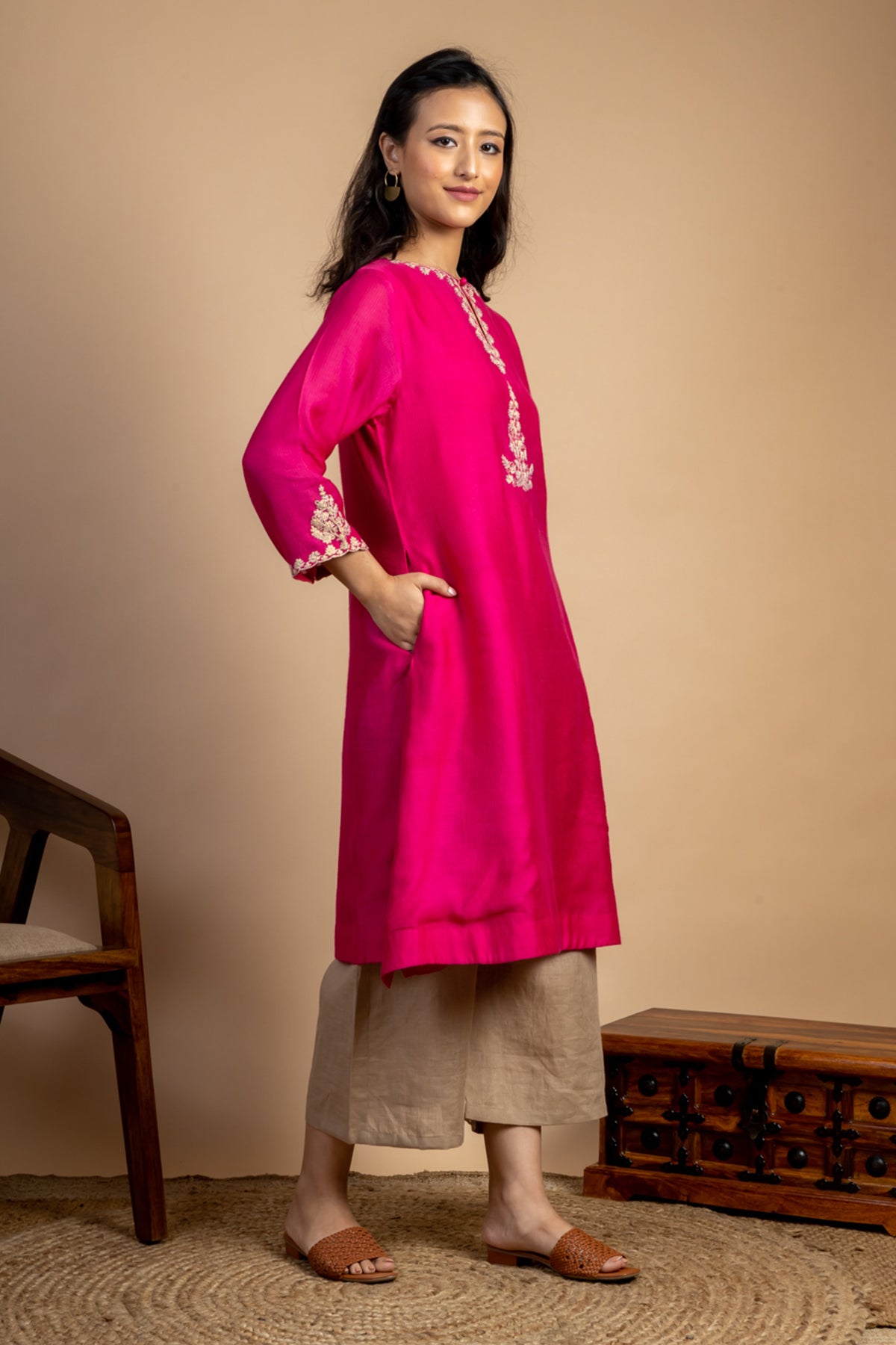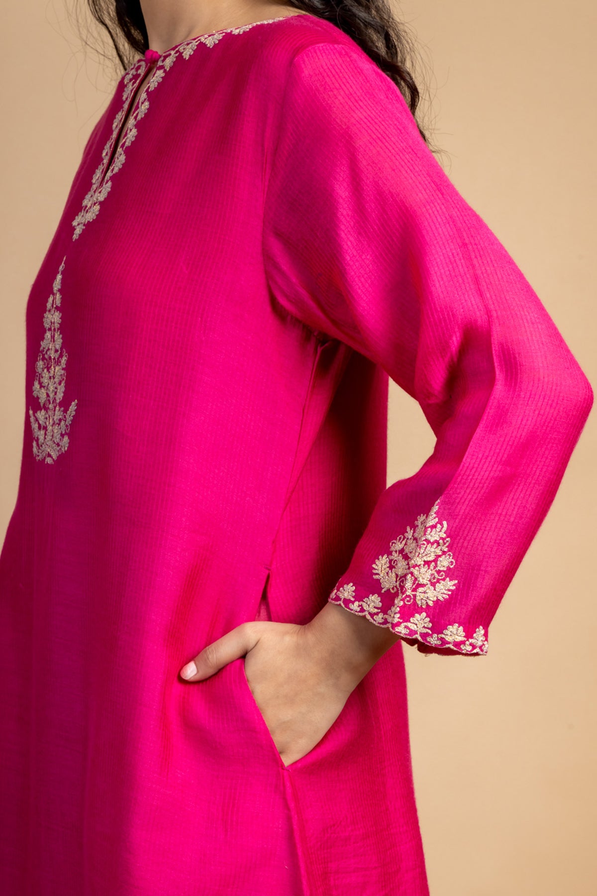 Our Tejo Kurta is made in the most breathable Handwoven Maheshwari silk fabric. This kurta from our Tyohar collection has beautiful embroidery at the sleeves and around the neck with keyhole detail. It also features pockets and is perfect for the festive season.