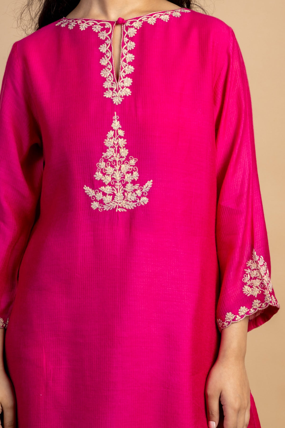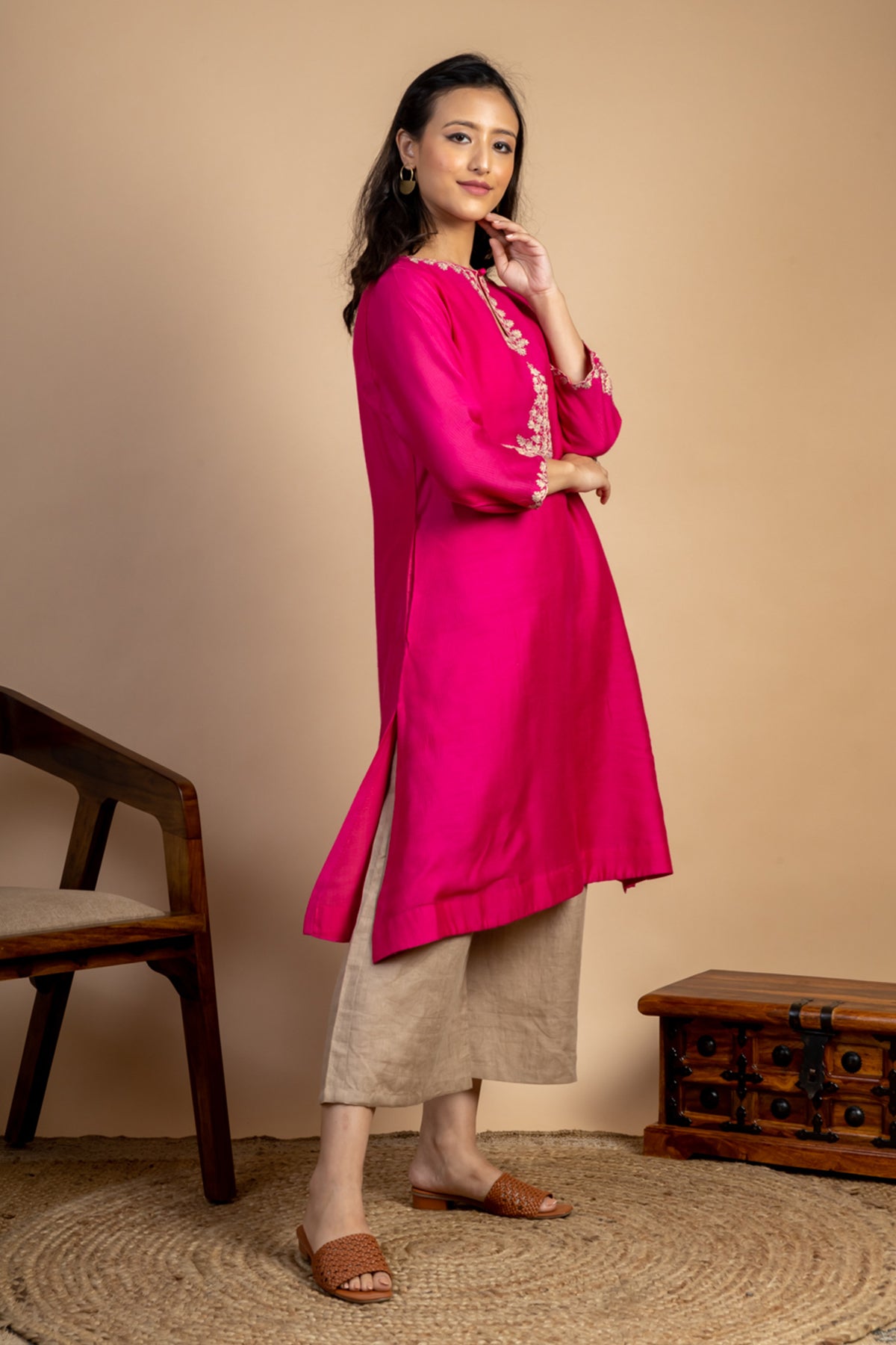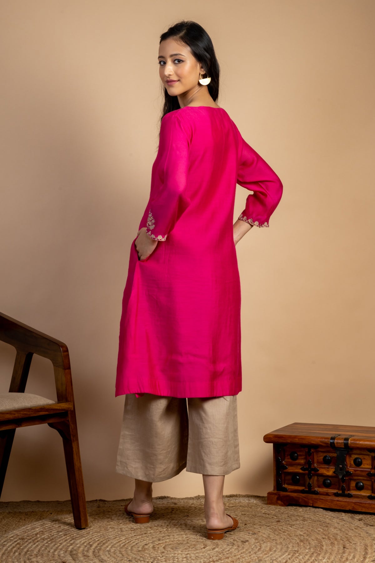 Our Tejo Kurta is made in the most breathable Handwoven Maheshwari silk fabric. This kurta from our Tyohar collection has beautiful embroidery at the sleeves and around the neck with keyhole detail. It also features pockets and is perfect for the festive season.