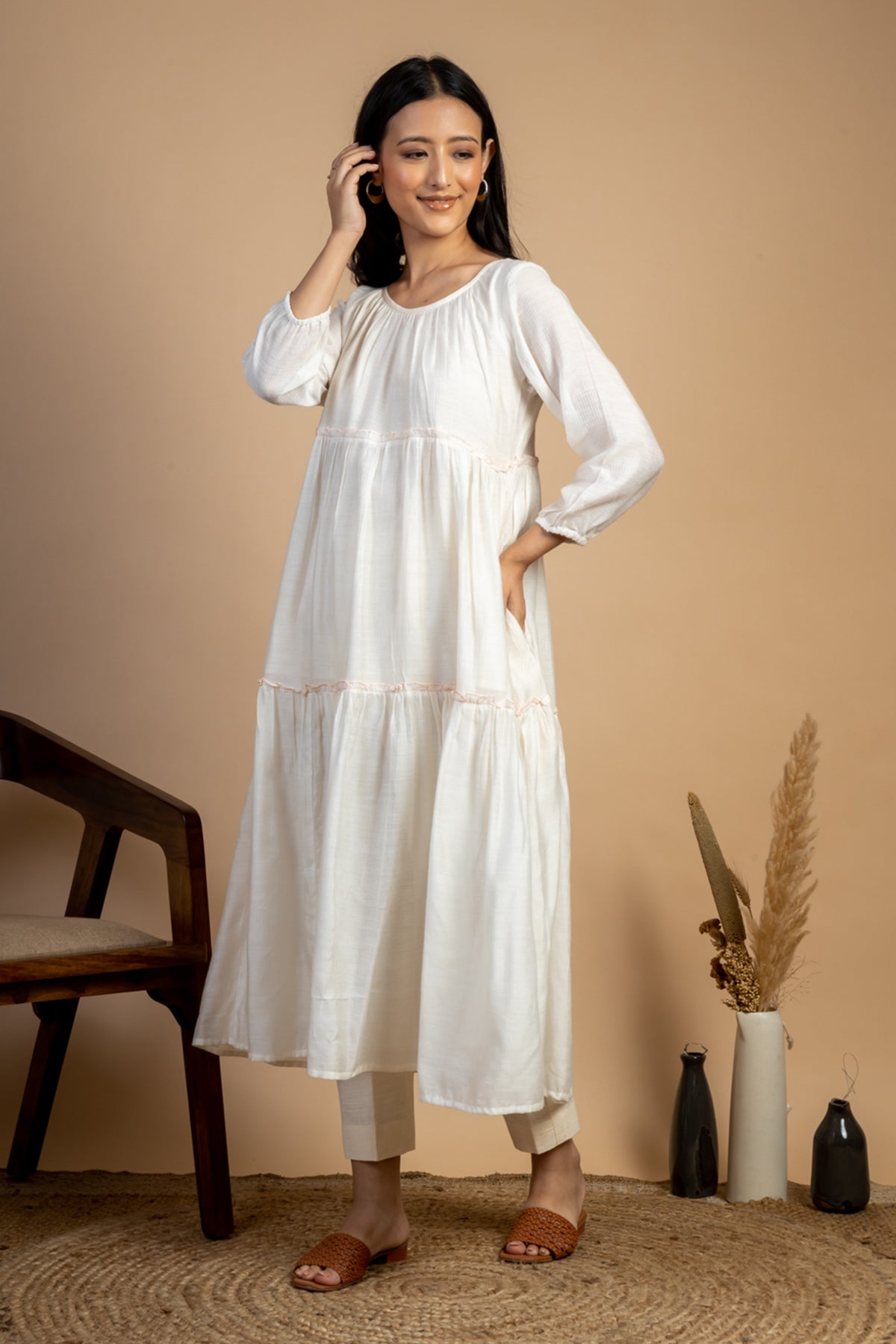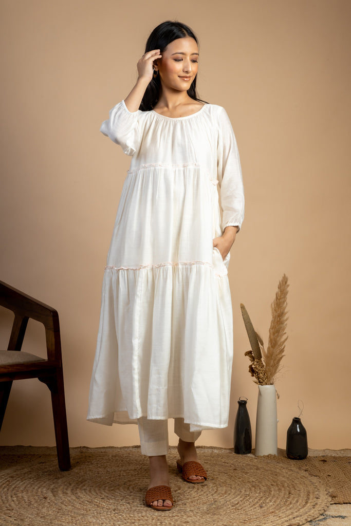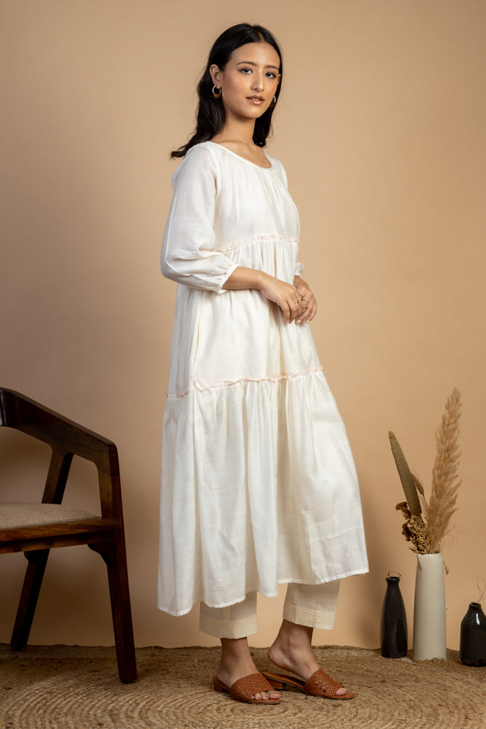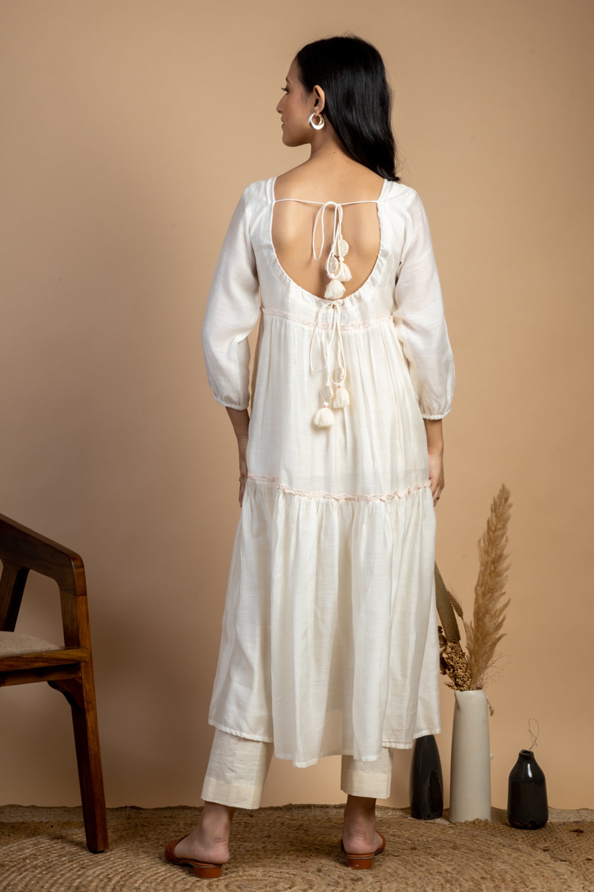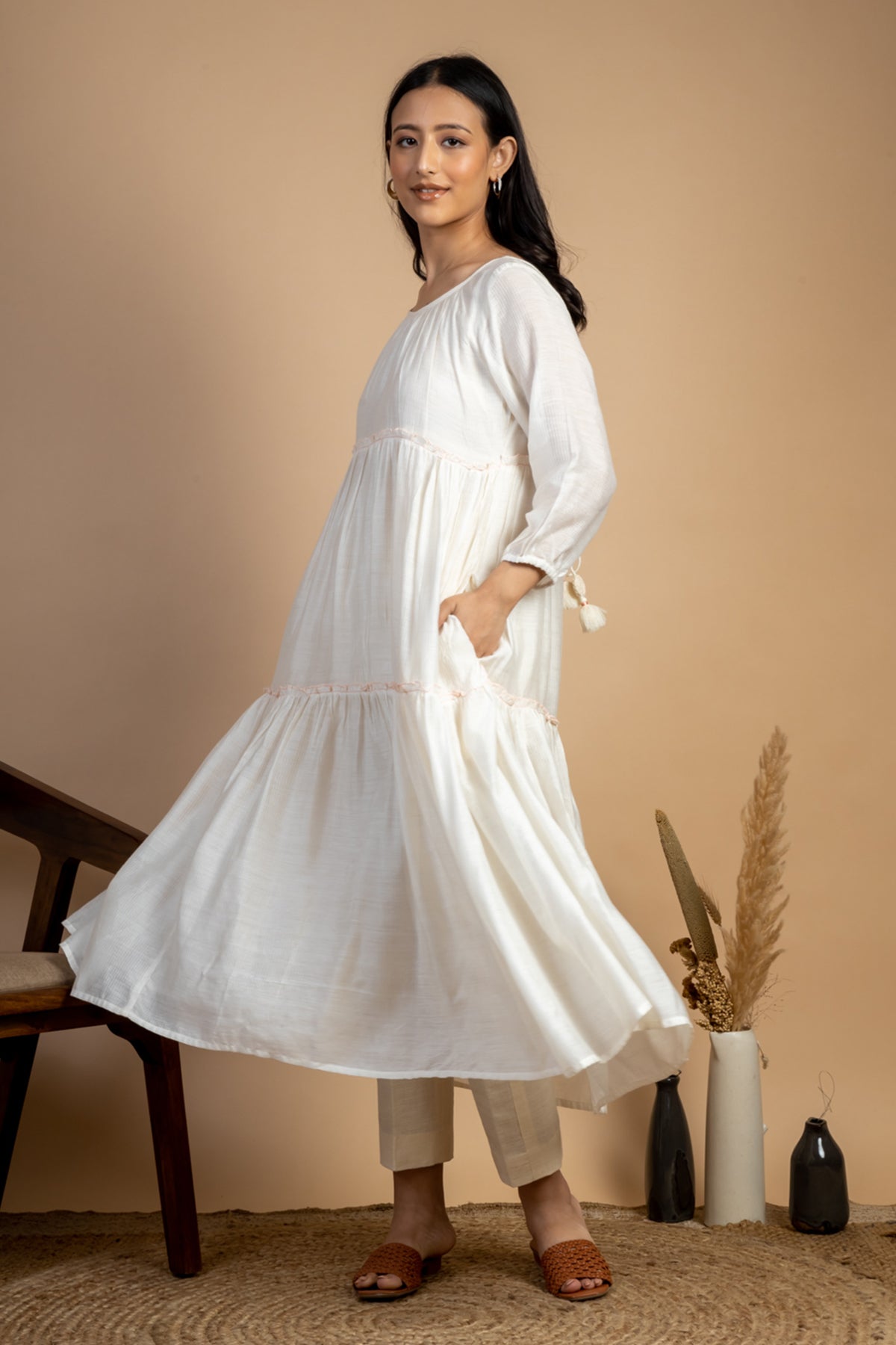 Our Ujavani dress is made in beautiful Maheshwari Silk fabric. This classic off-white tier dress has ruffle detail adorned with pink contrast thread stitch that adds to the charm of the dress. This easy-breezy dress is super comfortable and the tassel detail at the back makes you fall in love with it.