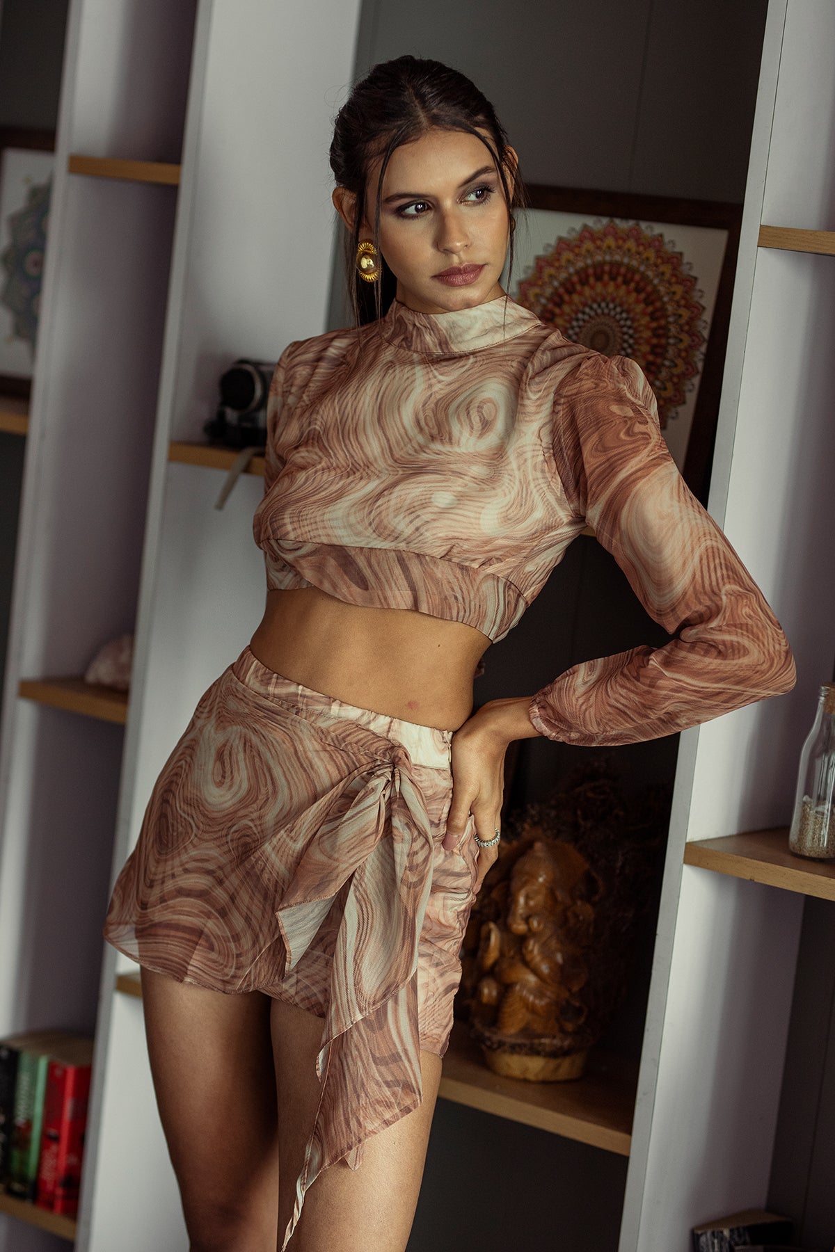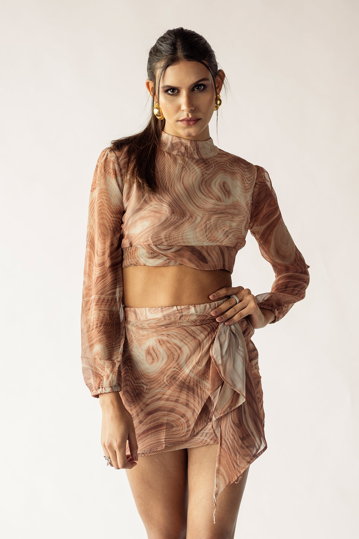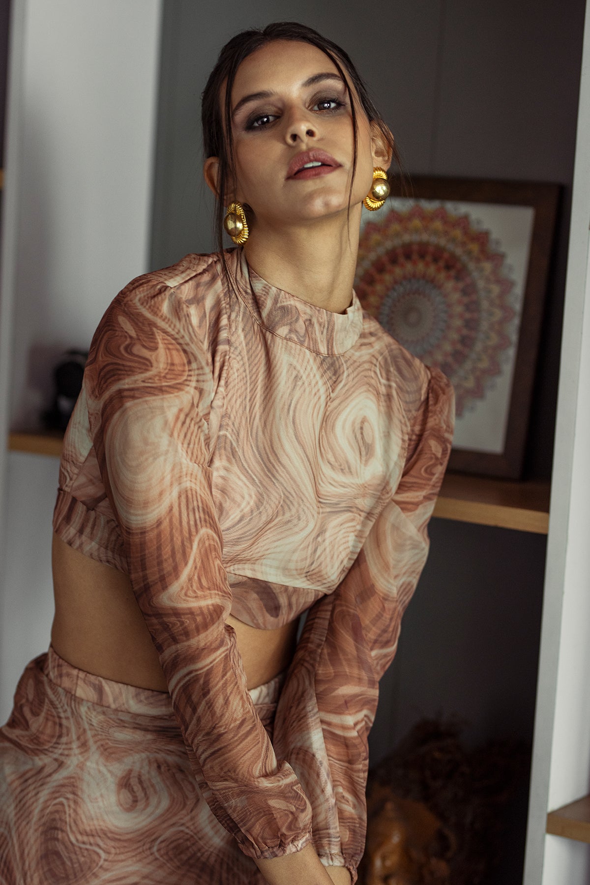 Aspen high neck crop top in earthy brown color that look wholesome in printed georgette fabric as its lightweight, dull-finished crêpe that has good strength. It has got button fastening at the back with super fun and bold to wear voluminous sleeve design. Pair it with the gathered skirt or oversized boyfriend jeans for a bold statement look.