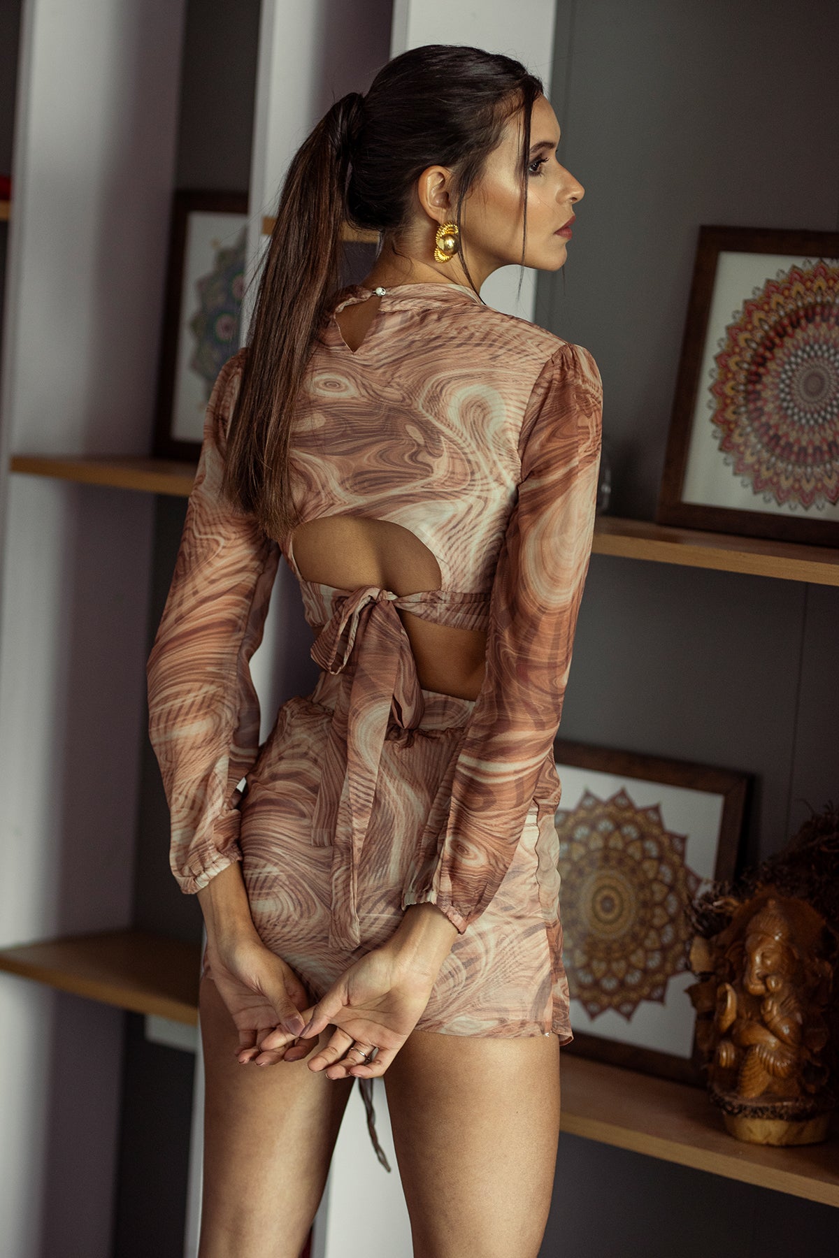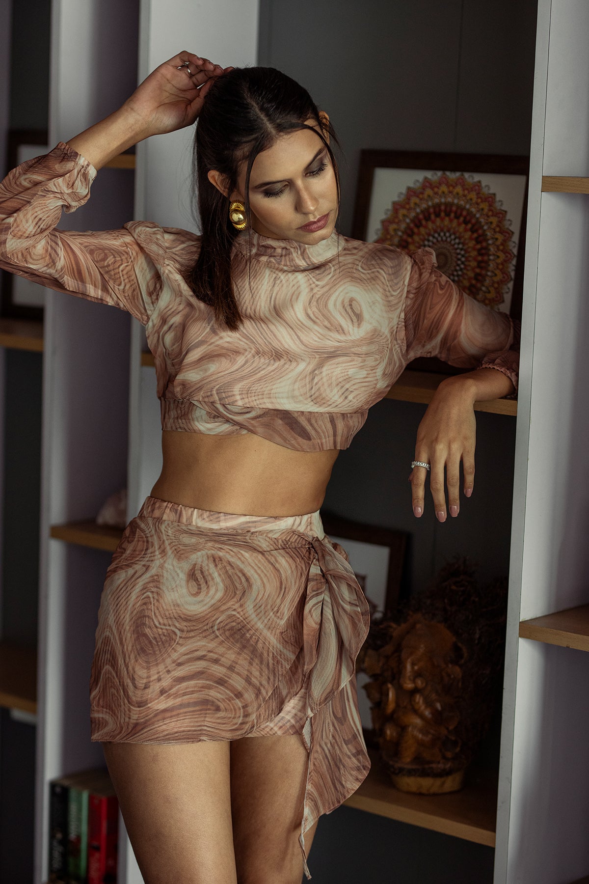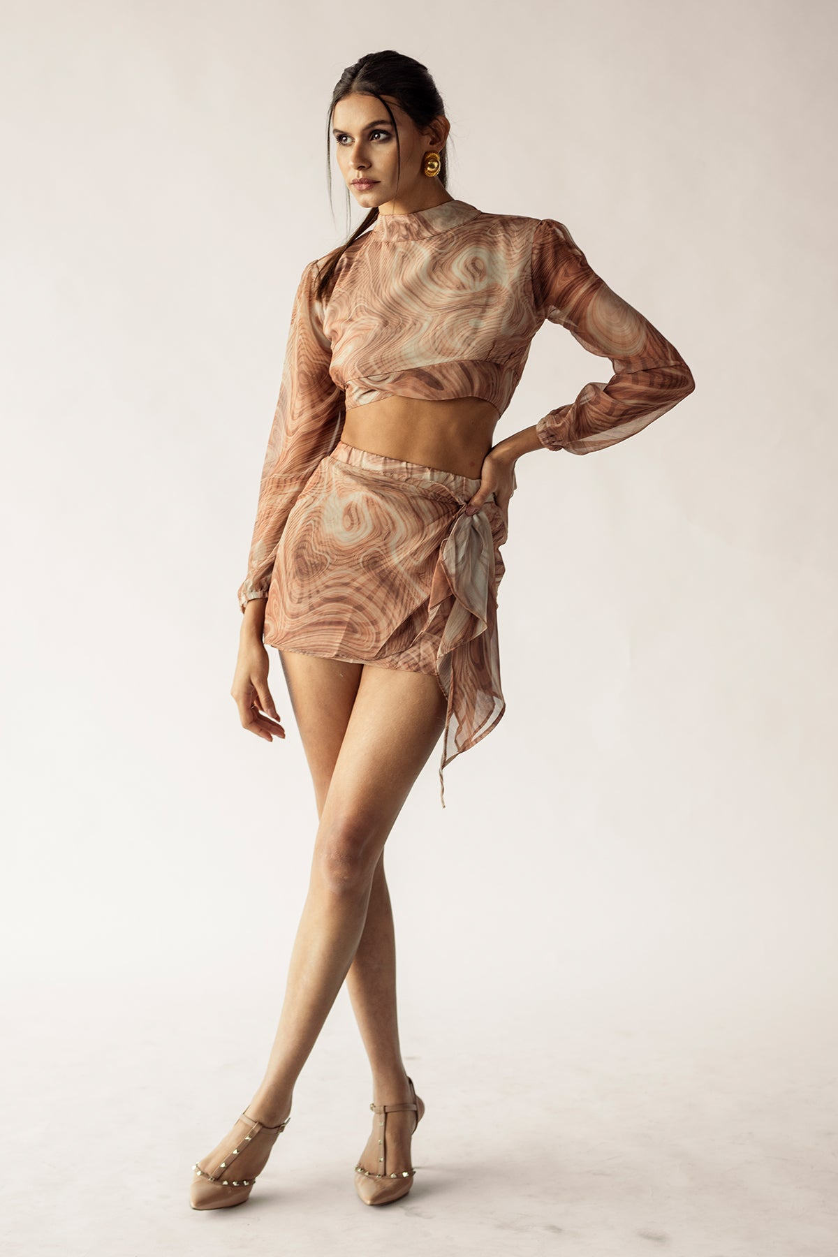 Aspen high neck crop top in earthy brown color that look wholesome in printed georgette fabric as its lightweight, dull-finished crêpe that has good strength. It has got button fastening at the back with super fun and bold to wear voluminous sleeve design. Pair it with the gathered skirt or oversized boyfriend jeans for a bold statement look.