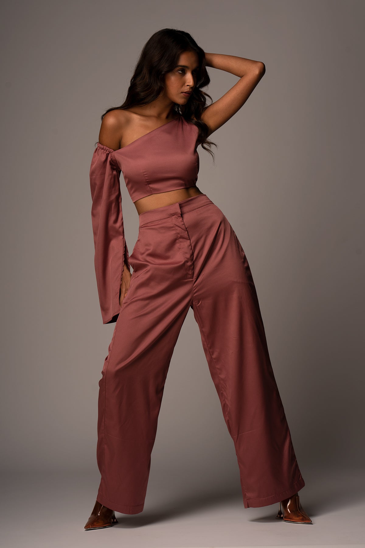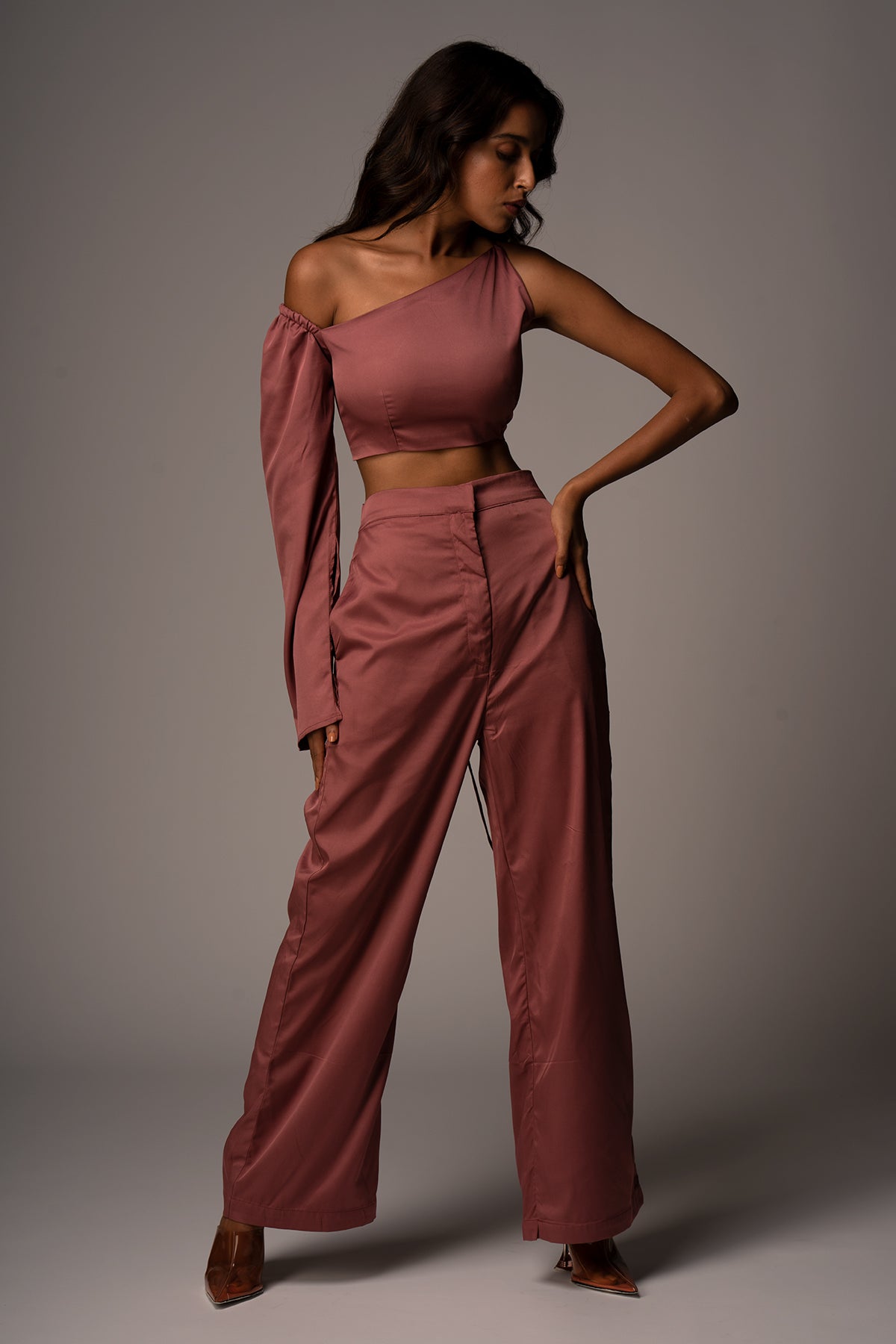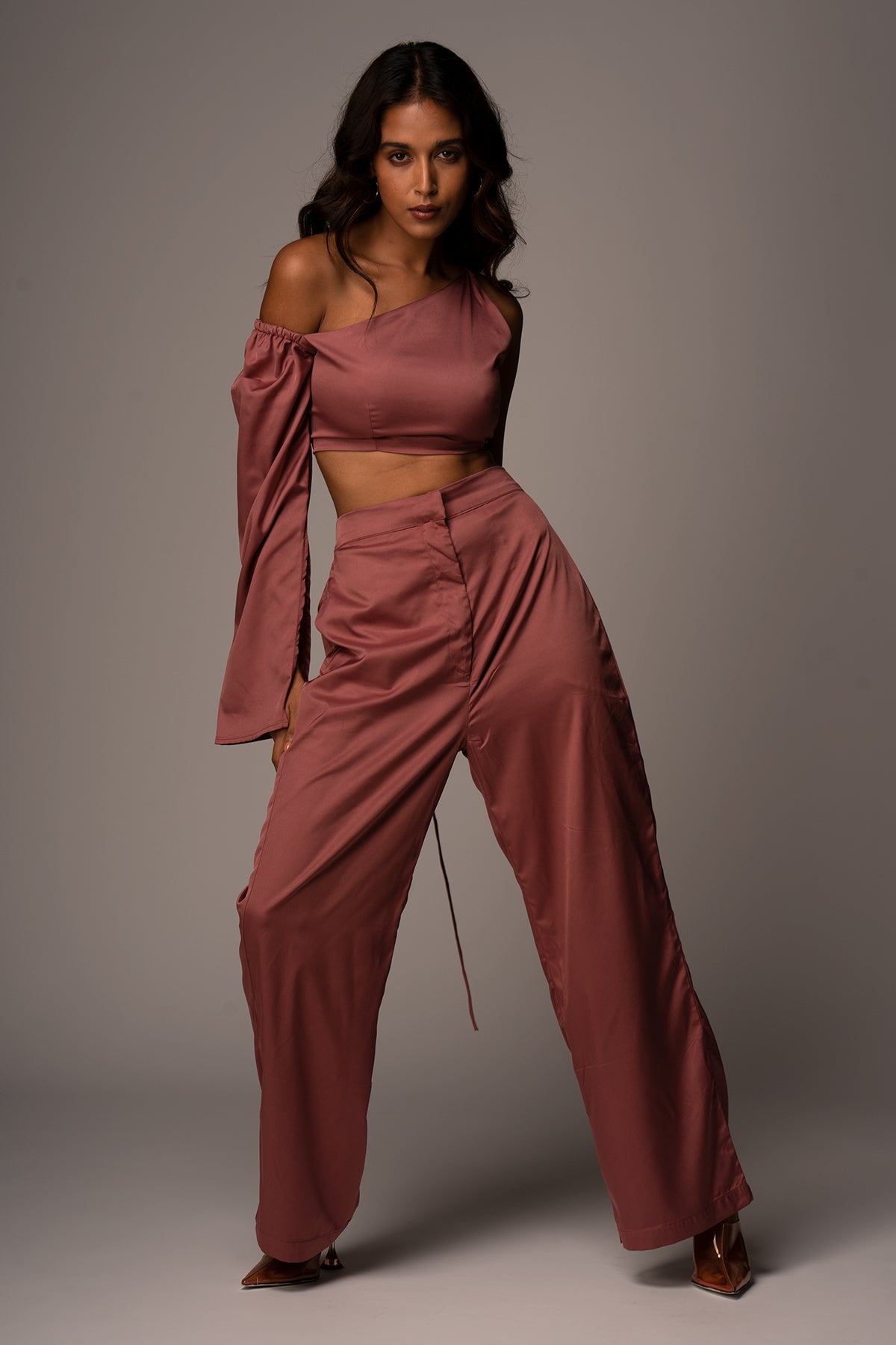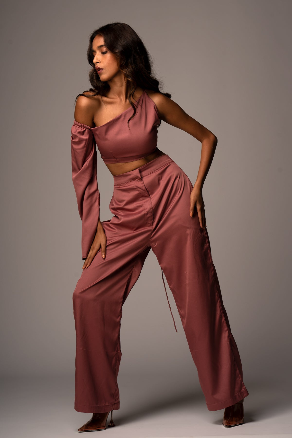 A perfect cordinate for your date night or brunch with friends, Pressego set is made of stretchable satin material with an open back and tie details. It showcases one sleeve and wide leg bottoms which gives you a stylish yet comfy look.