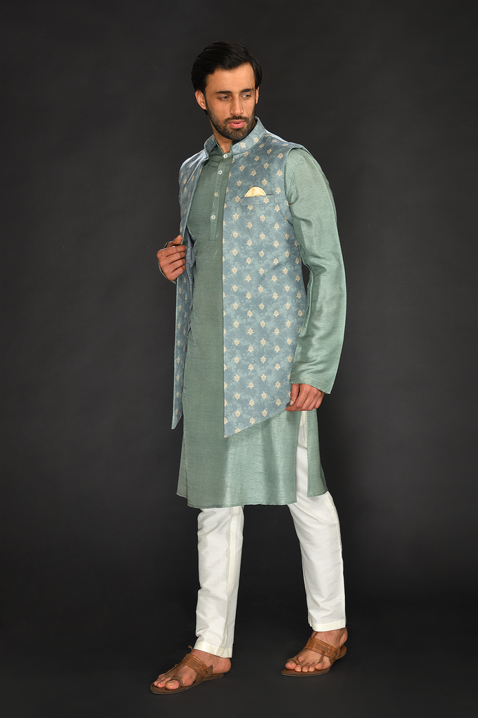 Dull Mint Green Long Bundi with Kurta and Chudidar