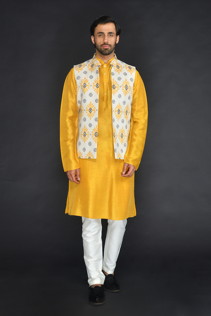 Off White & Mustard Poly. Khadi Printed Bundi with Kurta and Chudidar