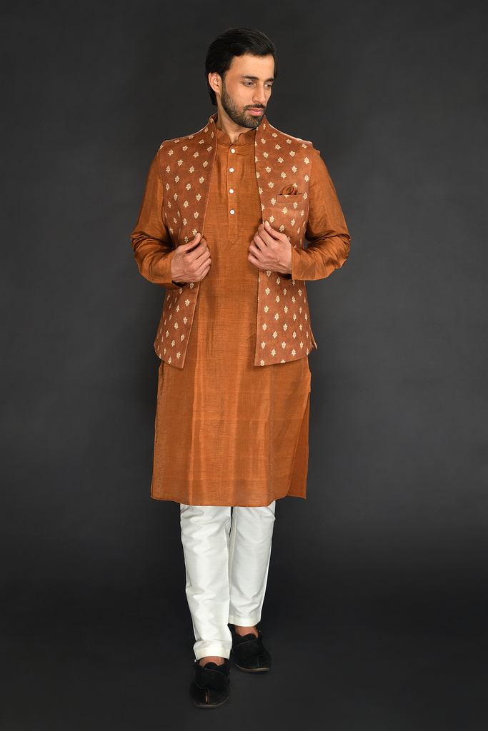 Brown Imported Velvet Printed Long Bundi with Kurta and Chudidar