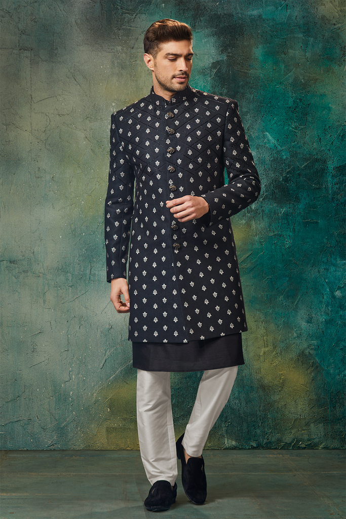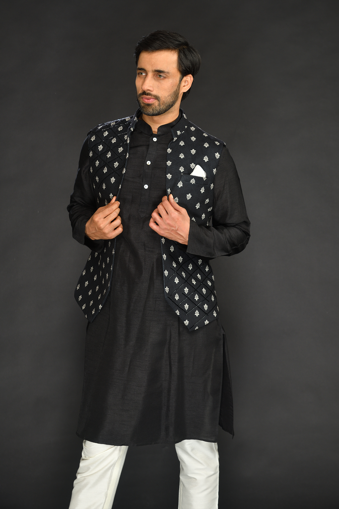 Black Imported Velvet Printed Indowestern with Kurta and Pants