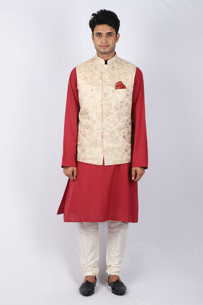 Paisley Embroidered Nehru Jacket with Kurta Set - Maroon Beige