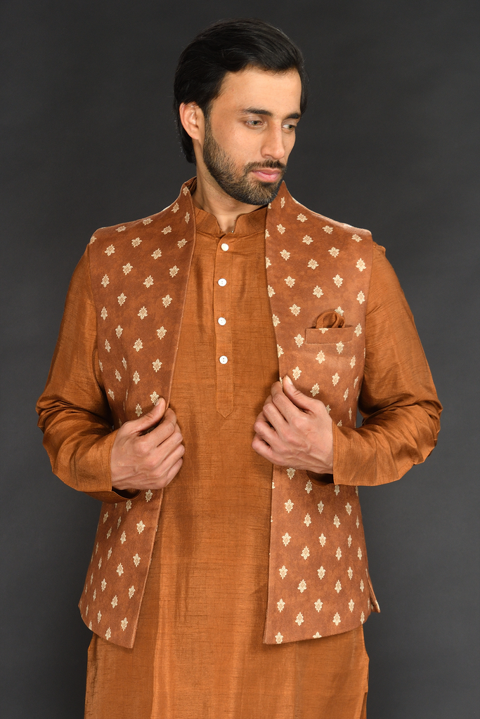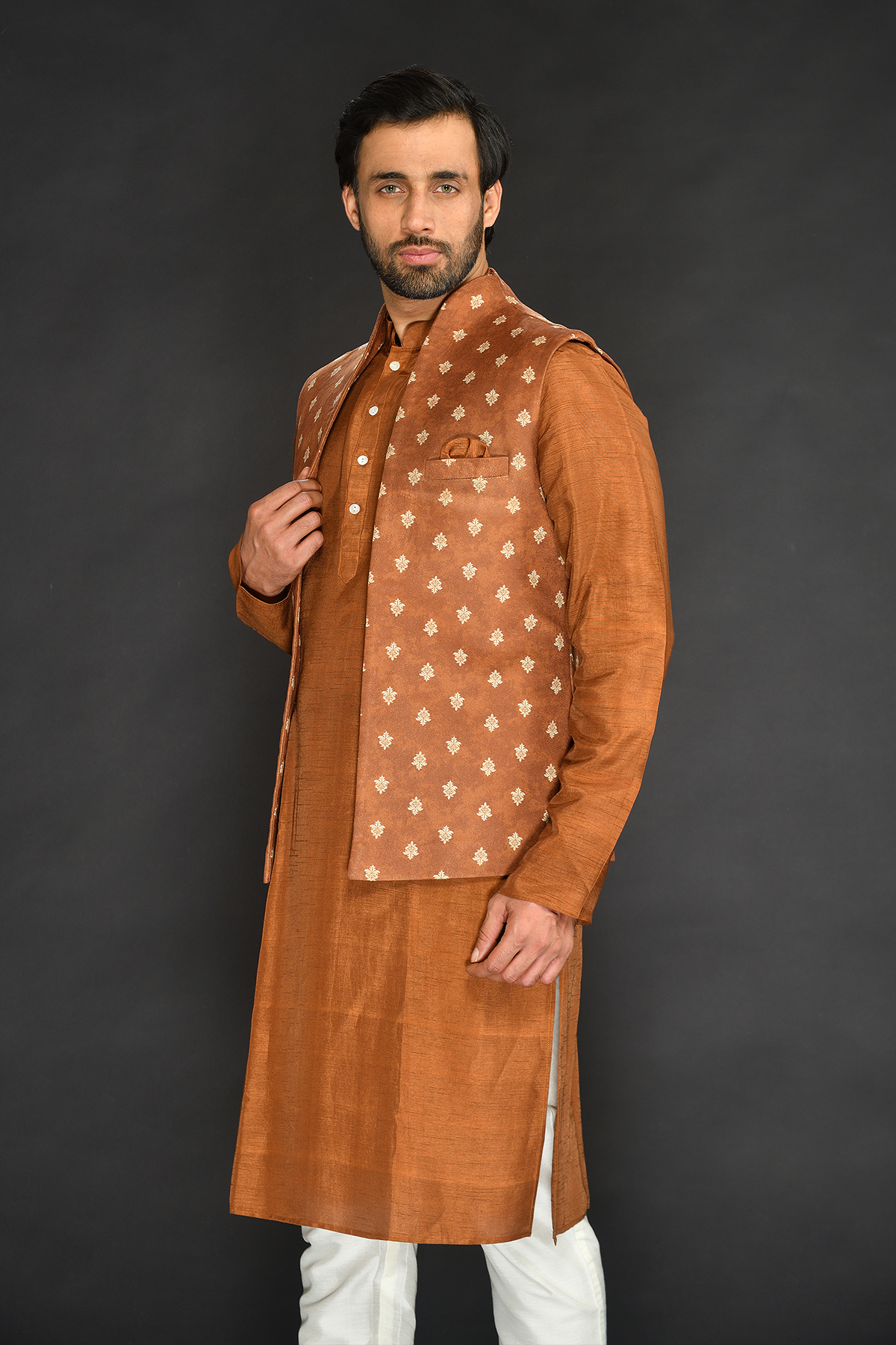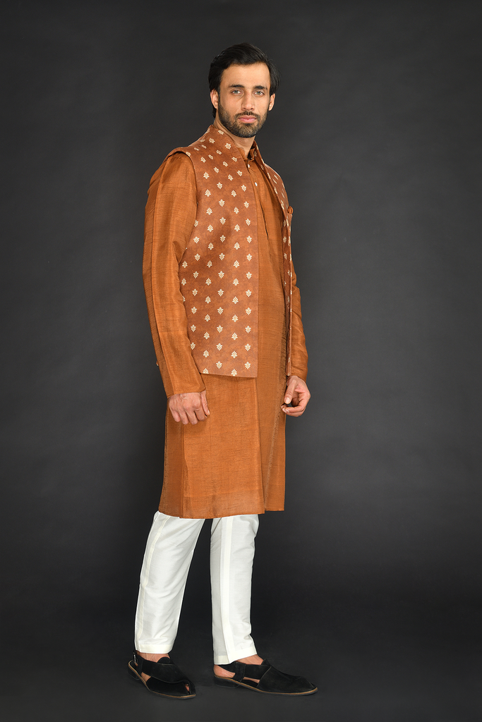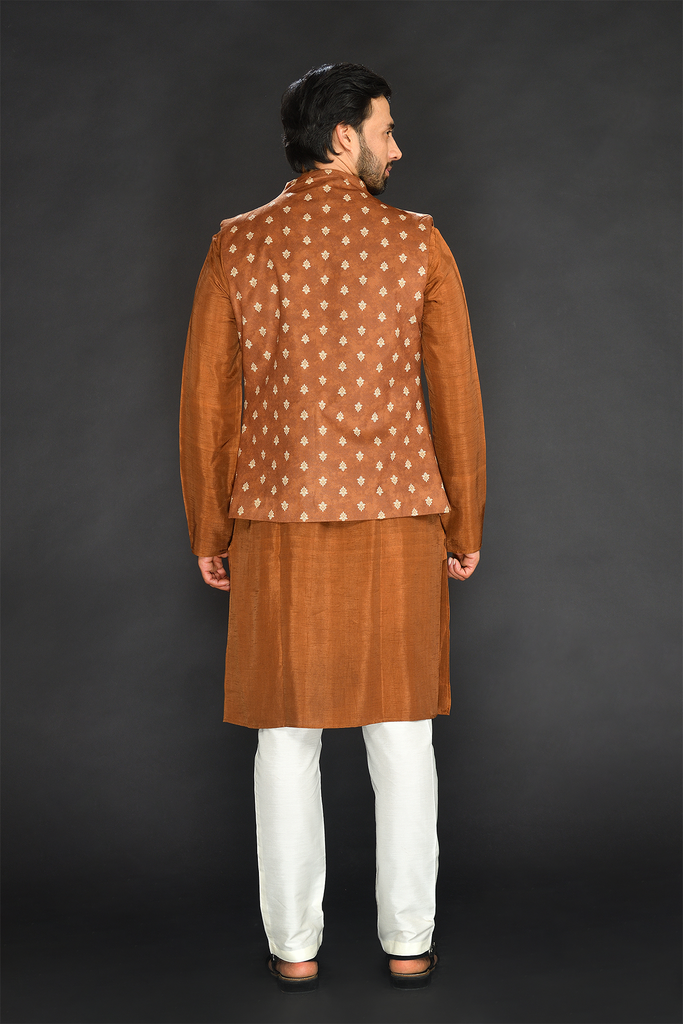 Brown Imported velvet Printed Bundi with vis. Silk peach Kurta paired with off white spun silk Chudidar.