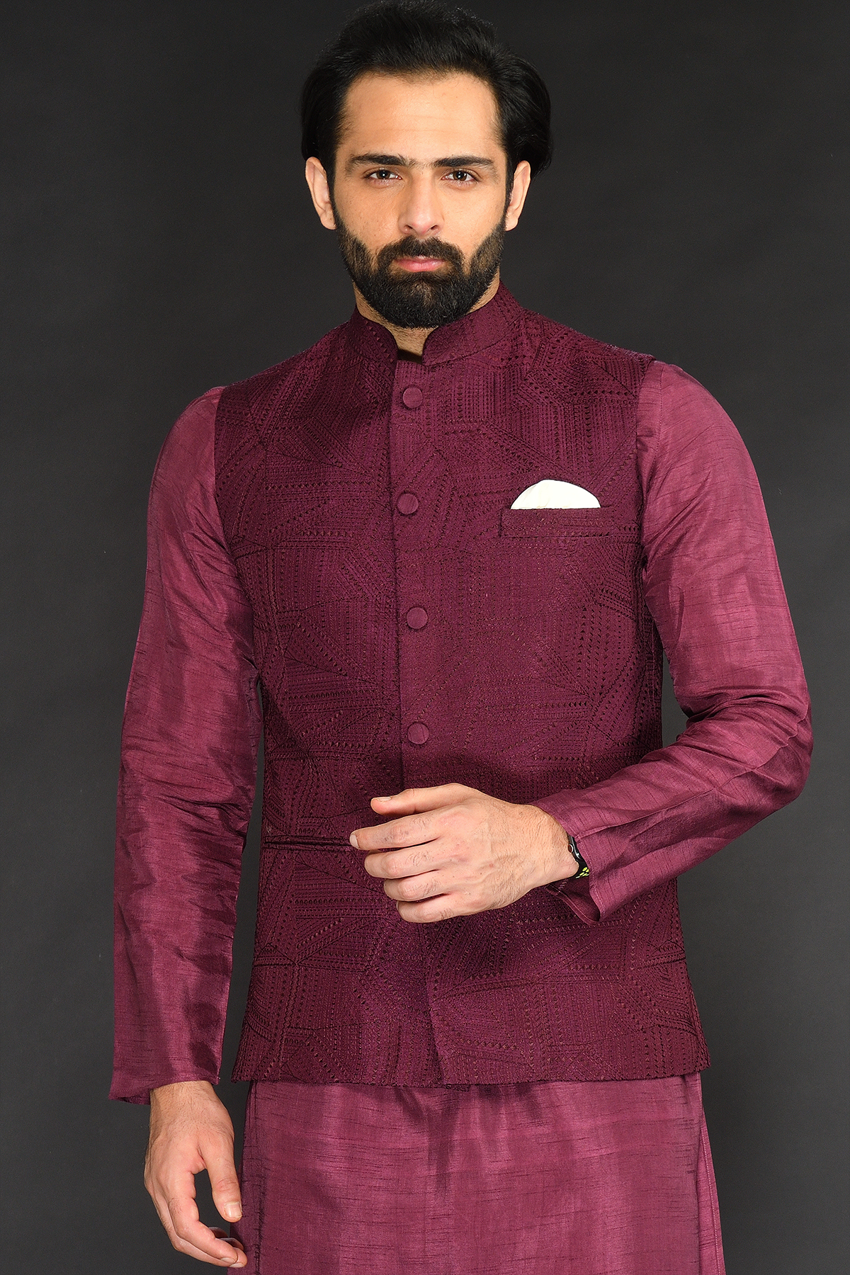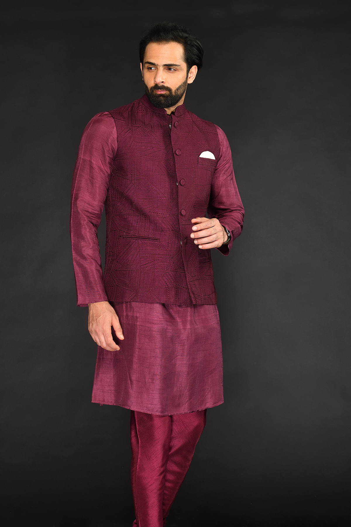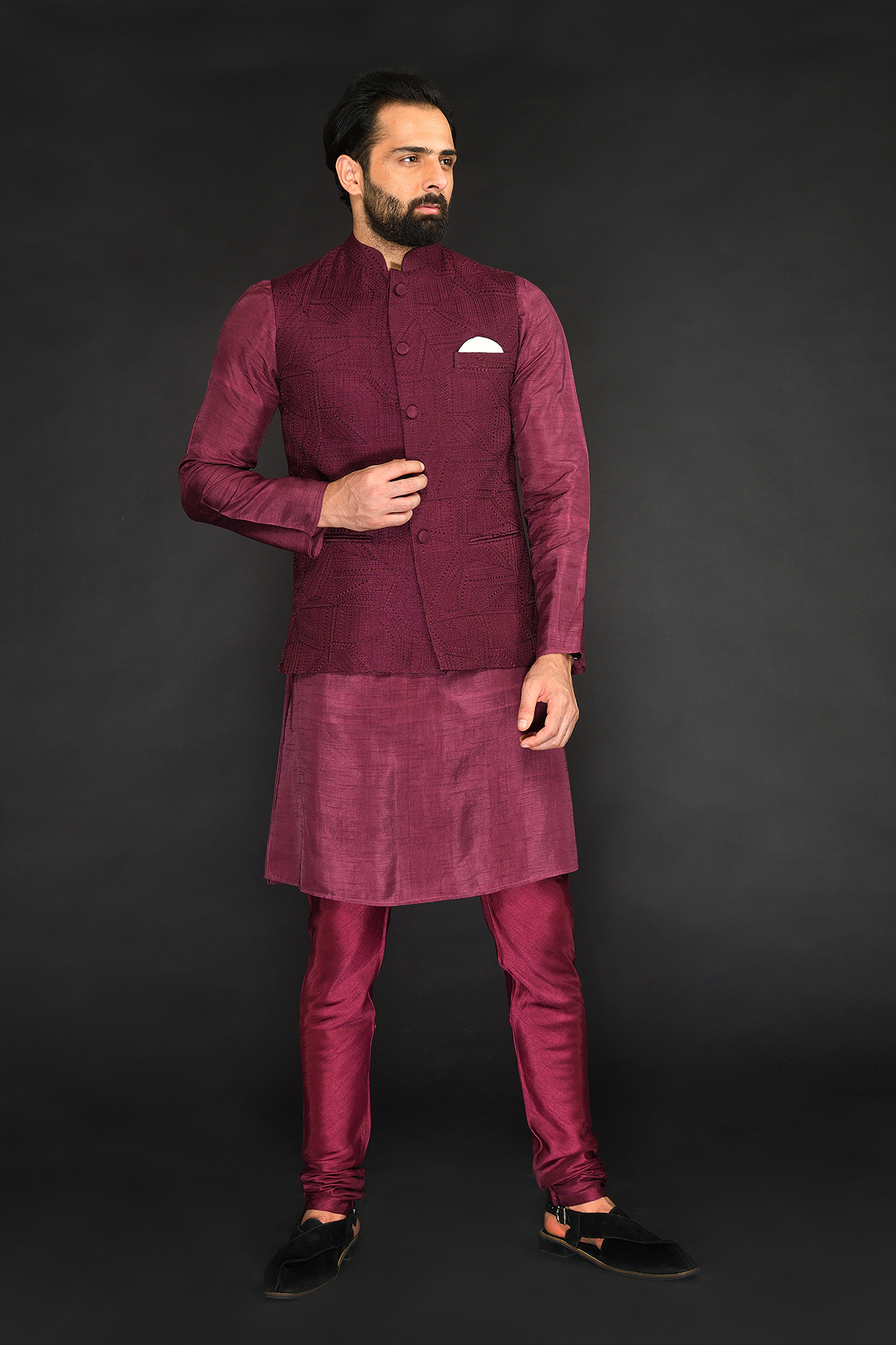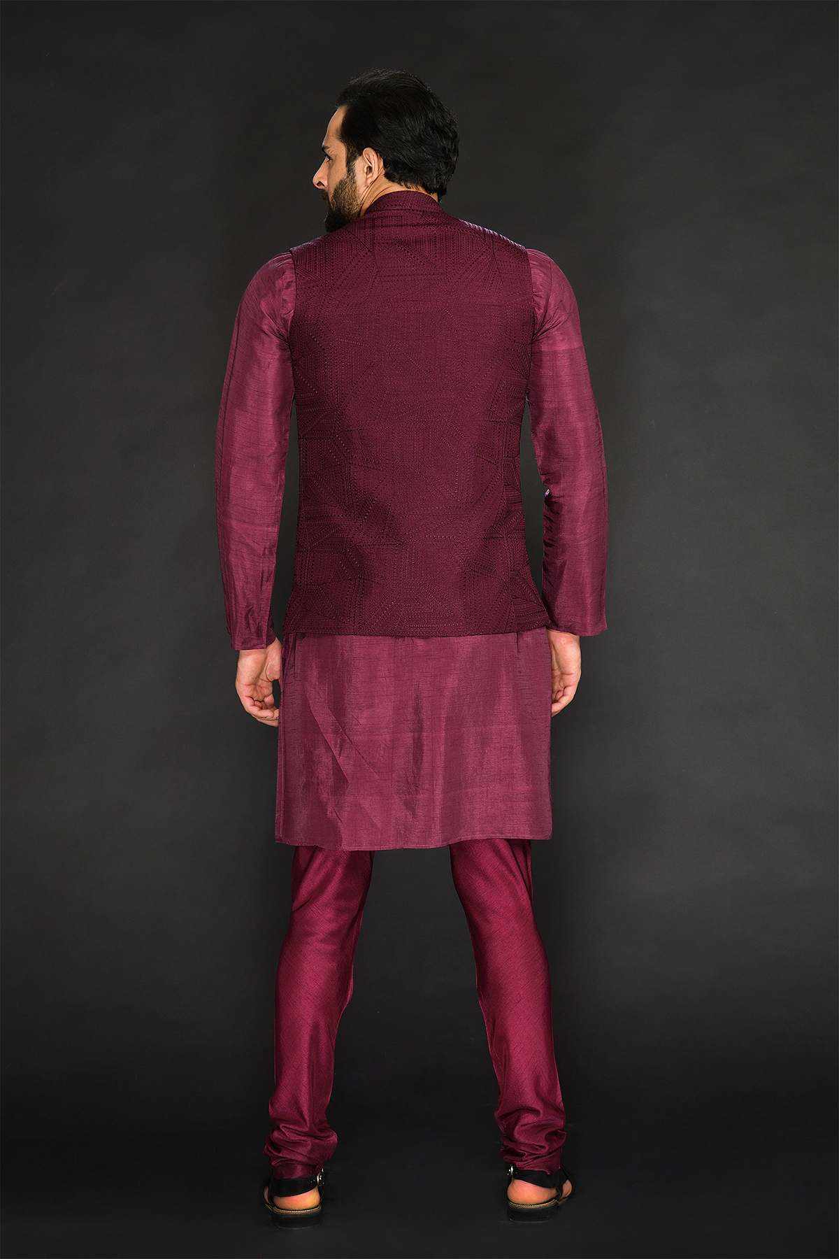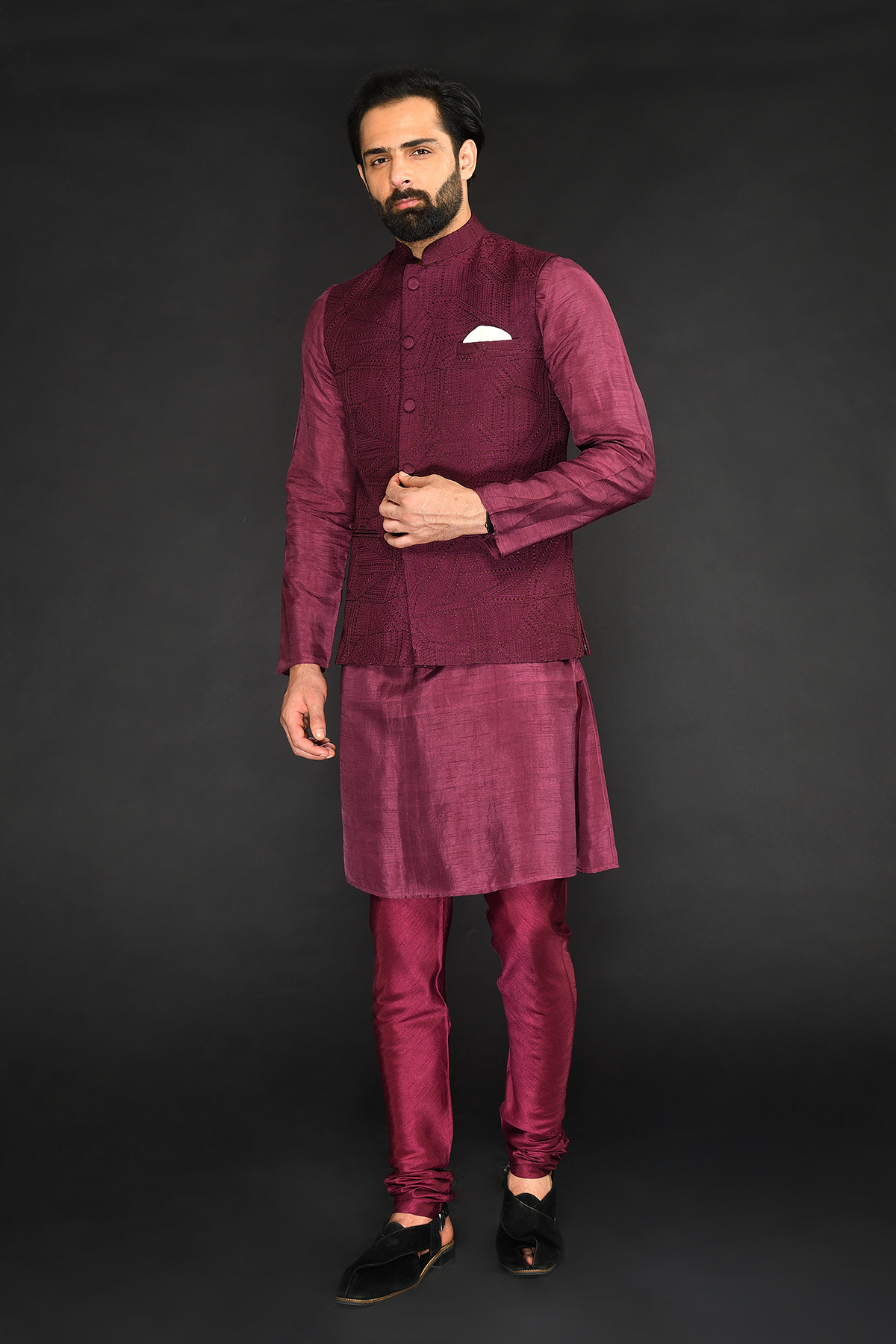 Maroon Geometric Machine Textured Bundi with palin Kurta and Chudidar Pants.