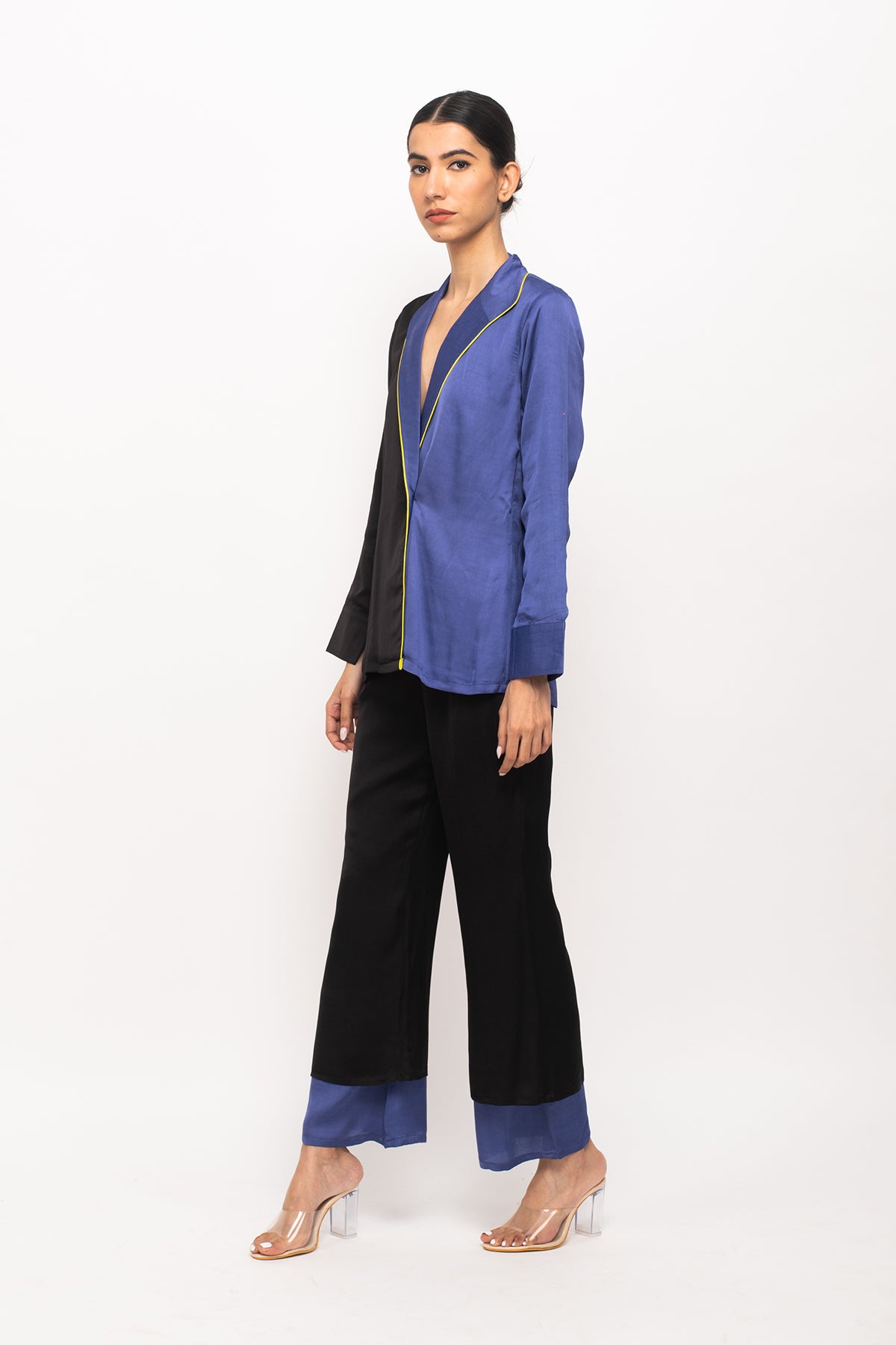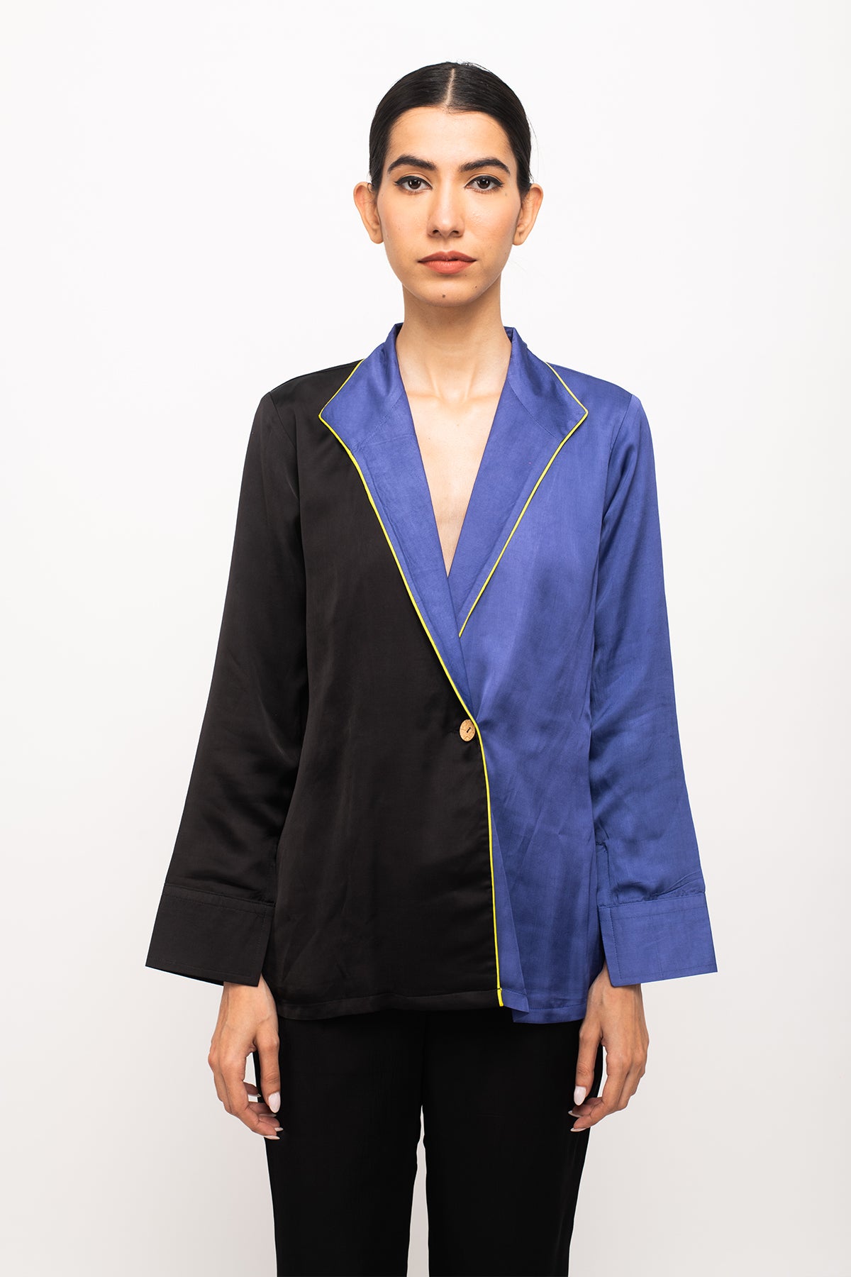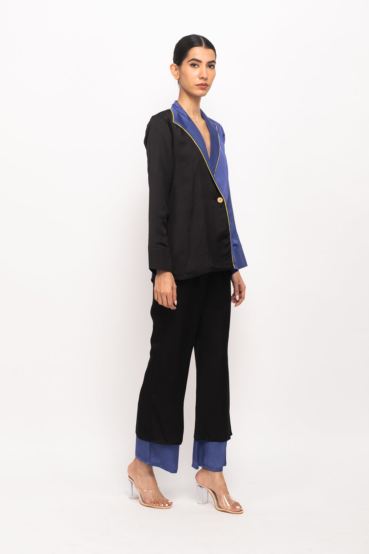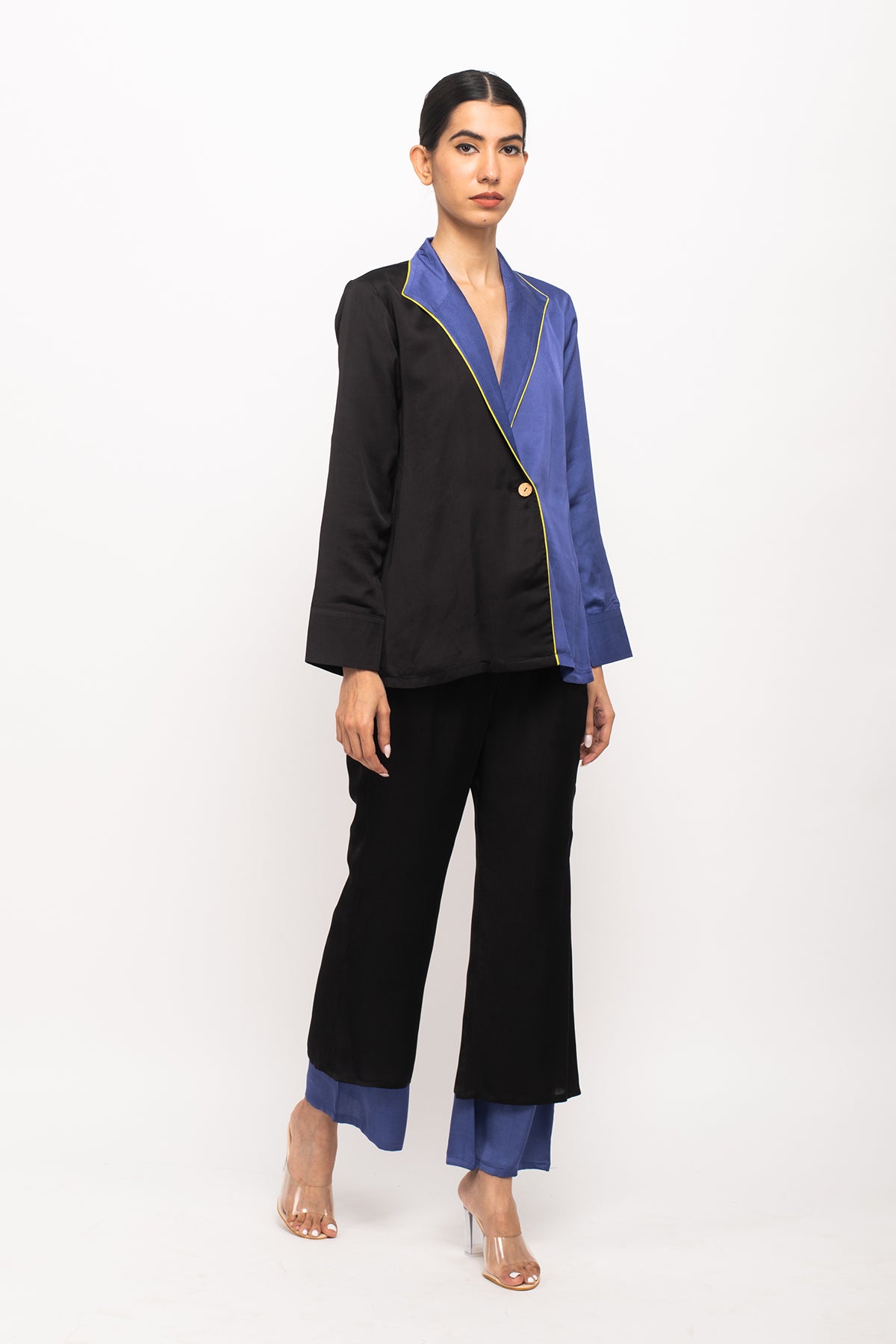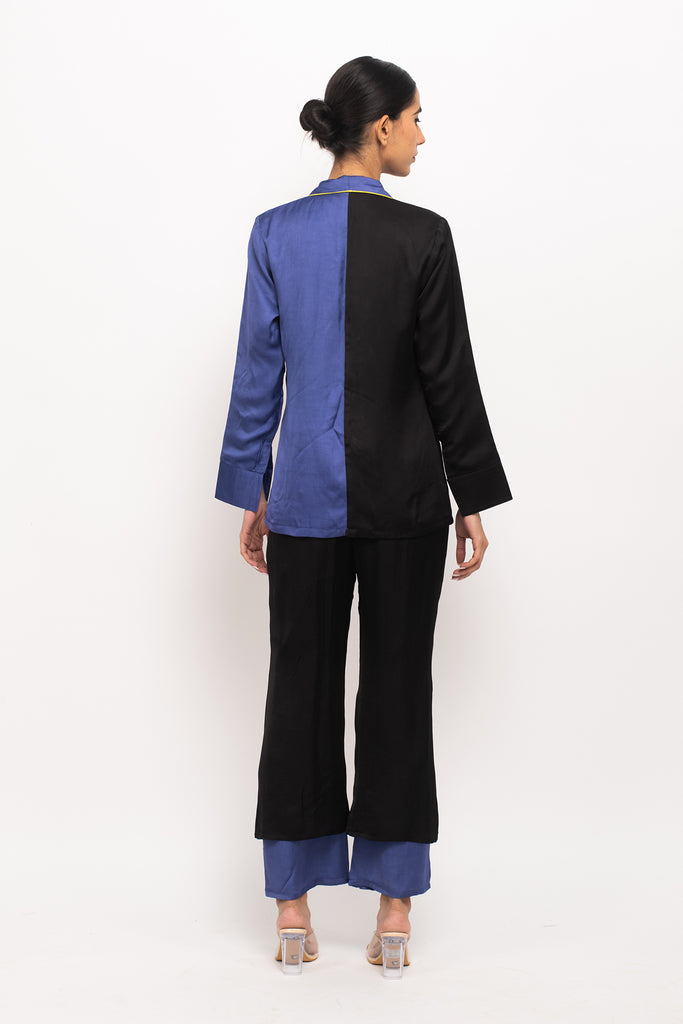 Black-Blue blazer set with full sleeves blazer with neon pipin throughout the edge and black-blue colorblocked regular pants.Length of the Garments: Blazer- 27, Pant- 38