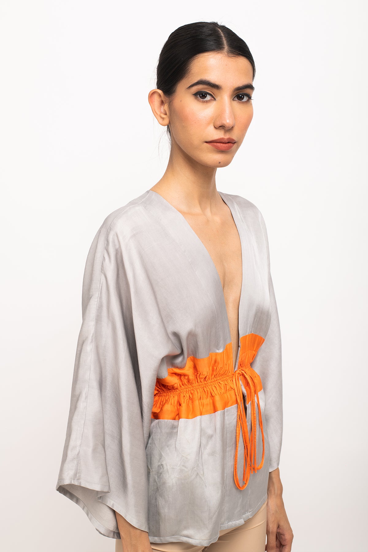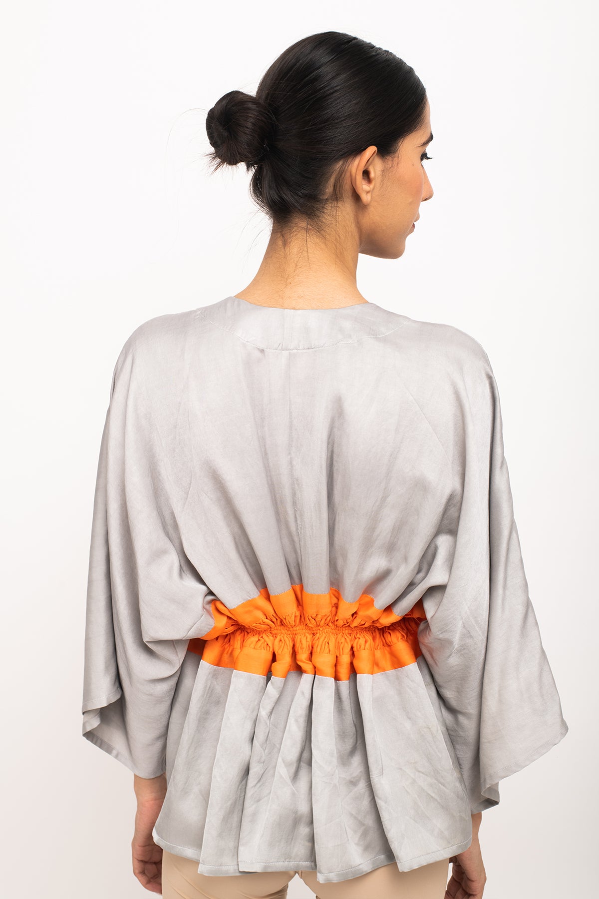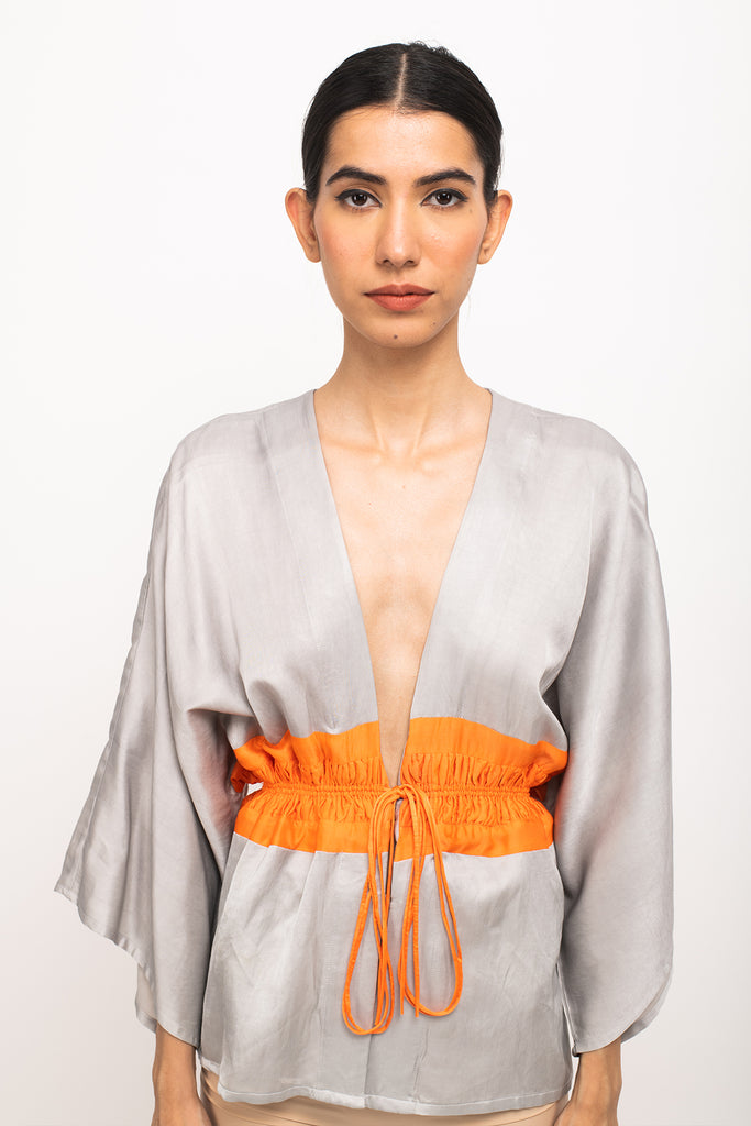 Grey-Orange short cape with neon rouching on the waist making it entirely adjustable and free size.Length of the Garments: 27