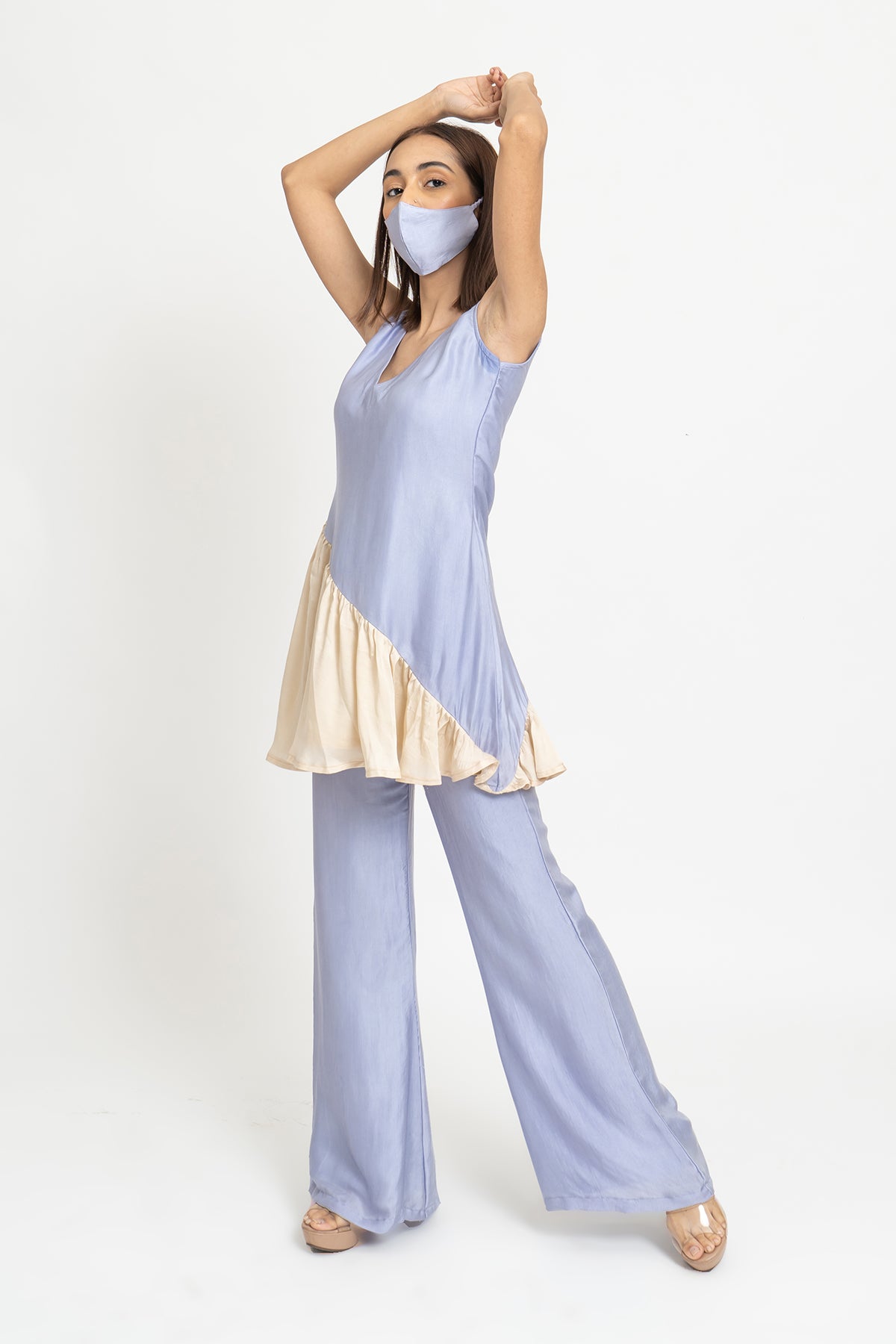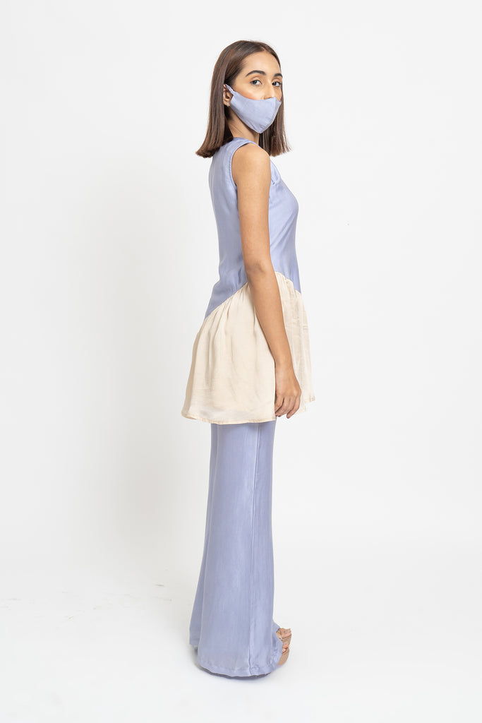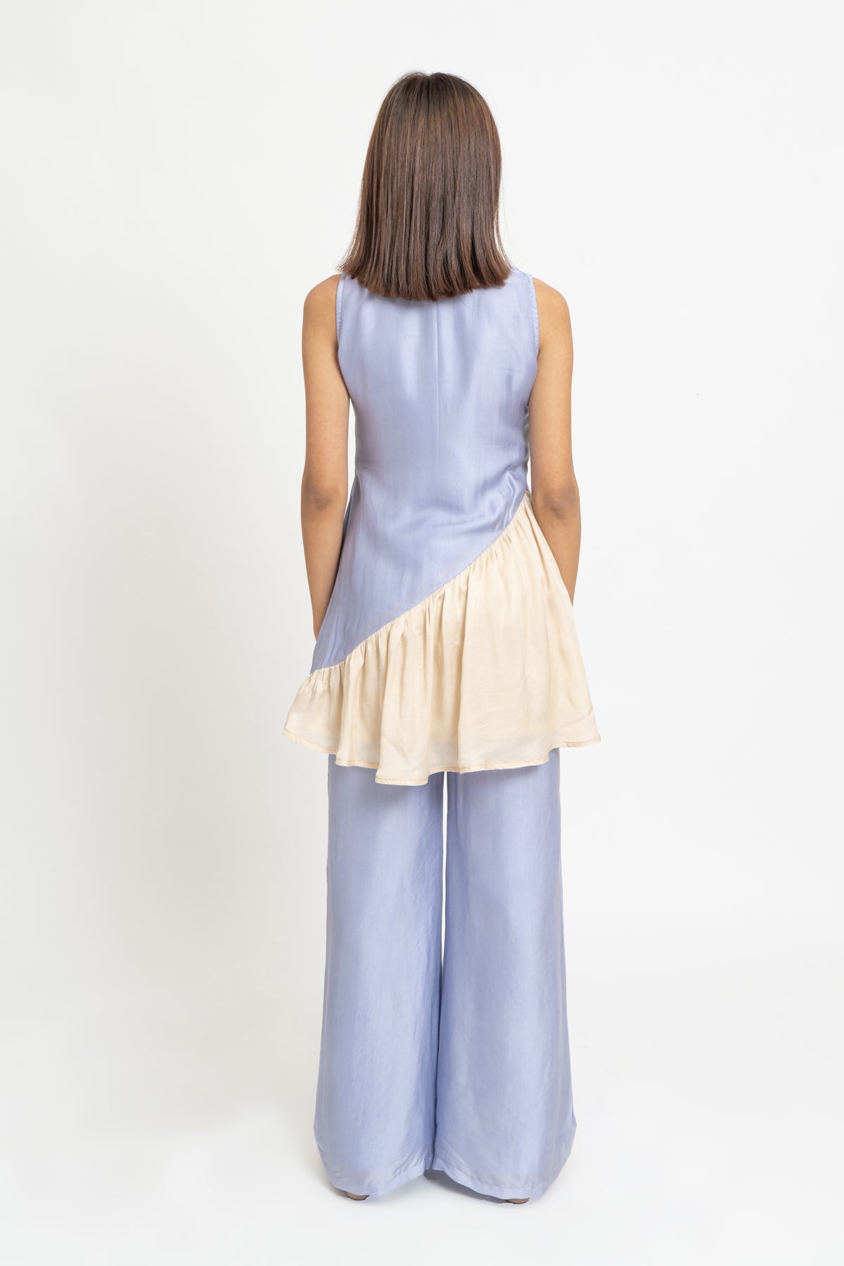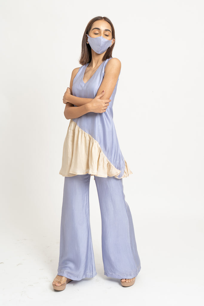 Lilac and Beige Colorblocked Sleeveless Tunic with Wide Legged Lilac Pants.