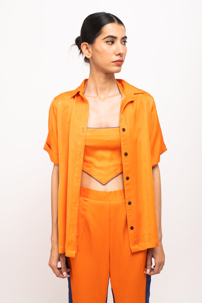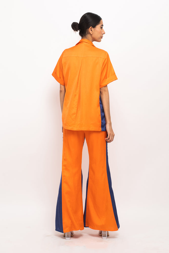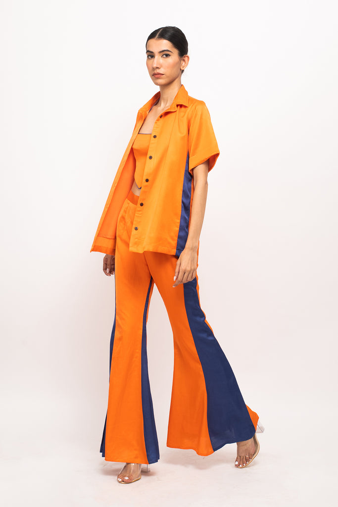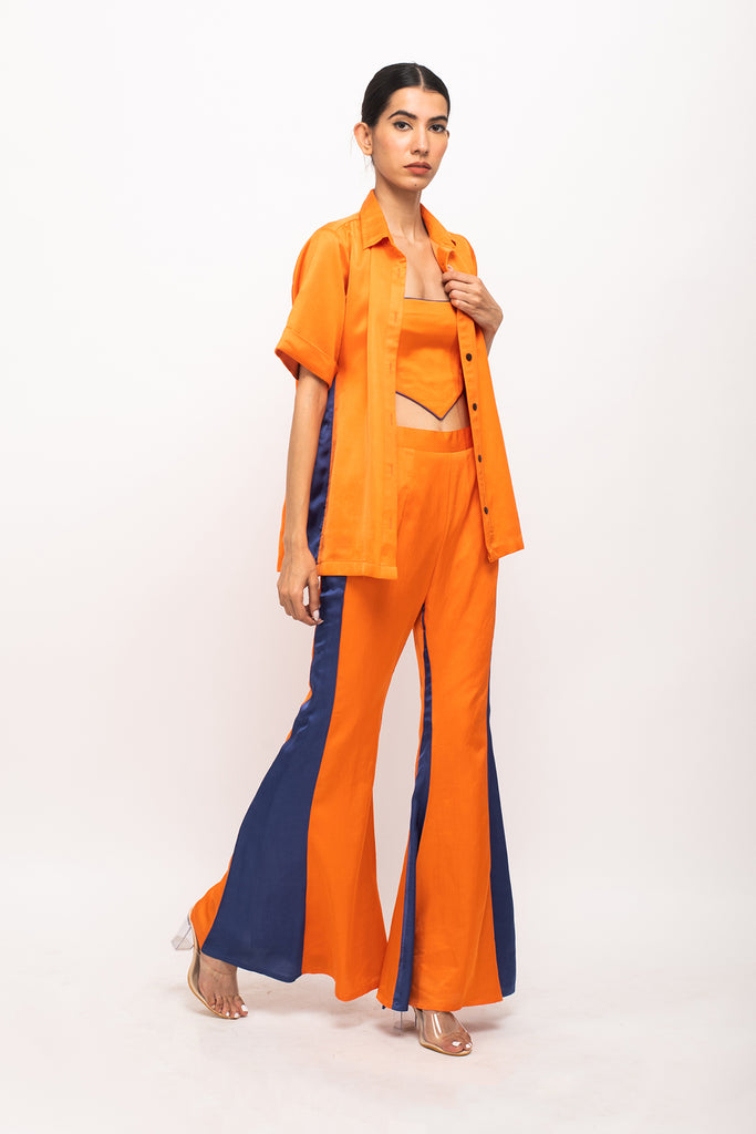 Orange-Blue three piece co-ord set; orange halter neck bustier paired with an orange-blue panelled shirt and orange-blue panelled flared pants.