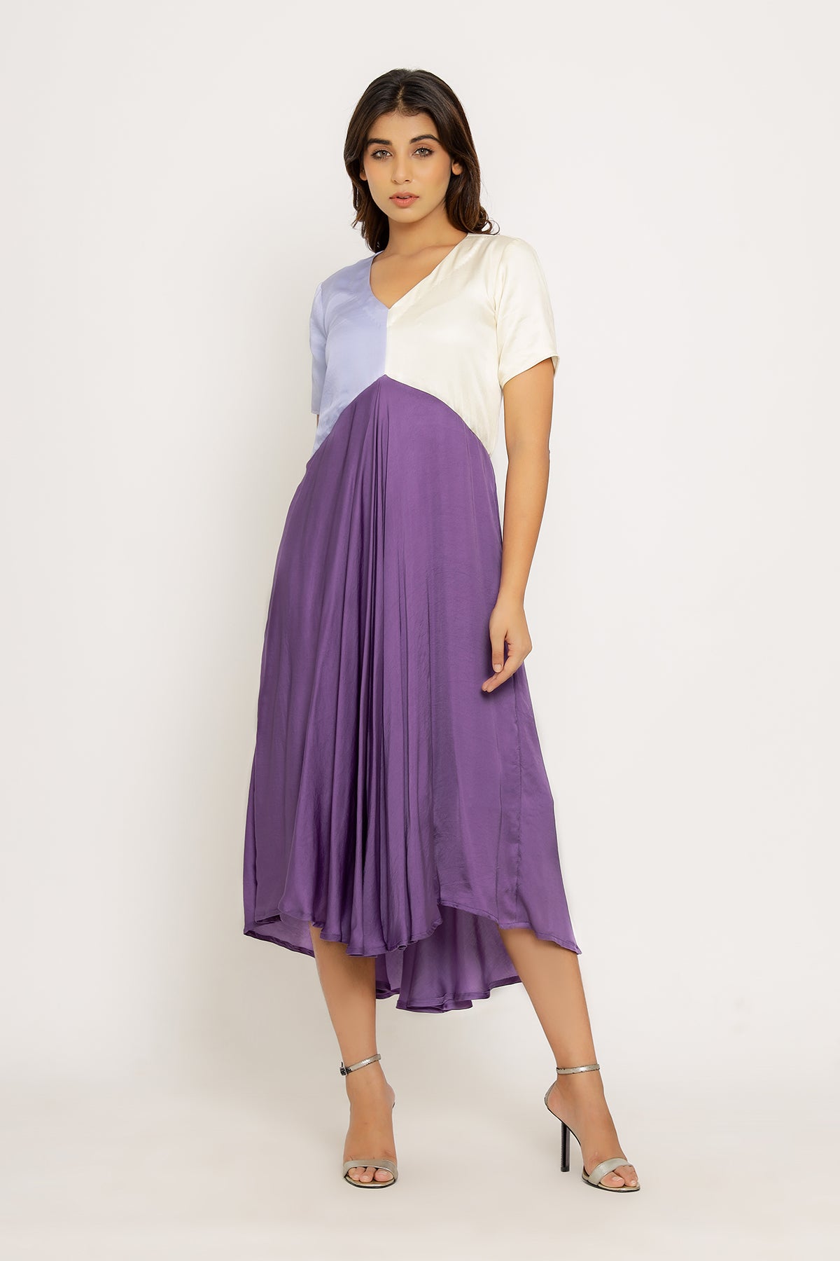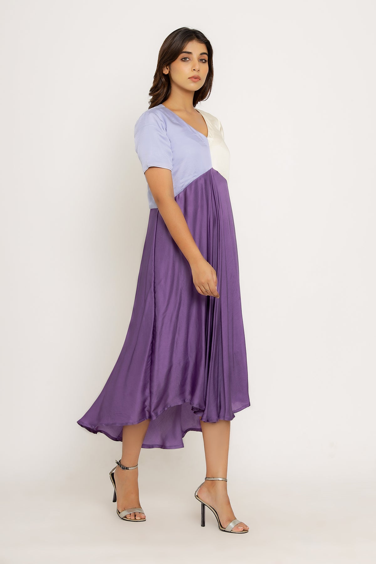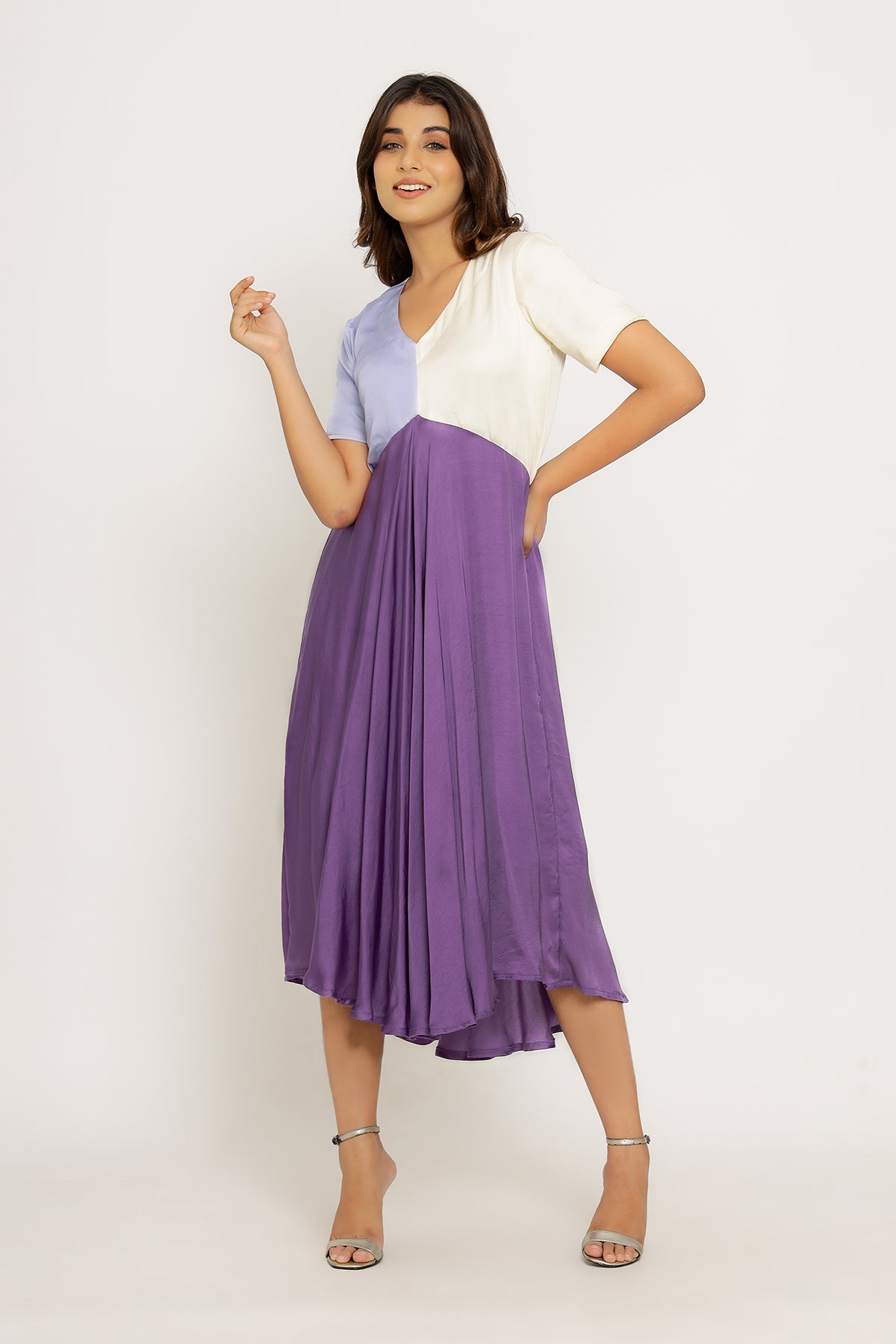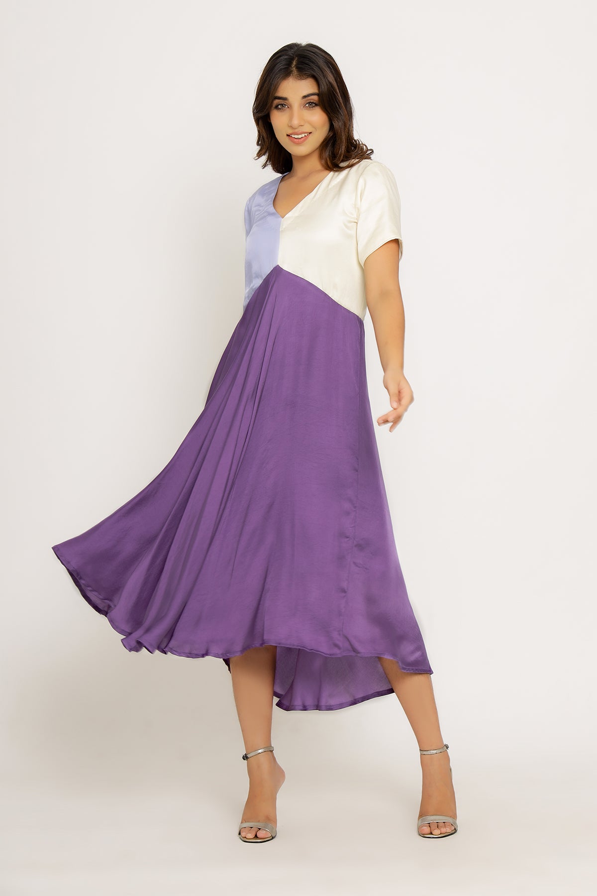 Purple-Lilac Midi Dress with Tri Colorblocked Pattern.Length of the Garments: 44