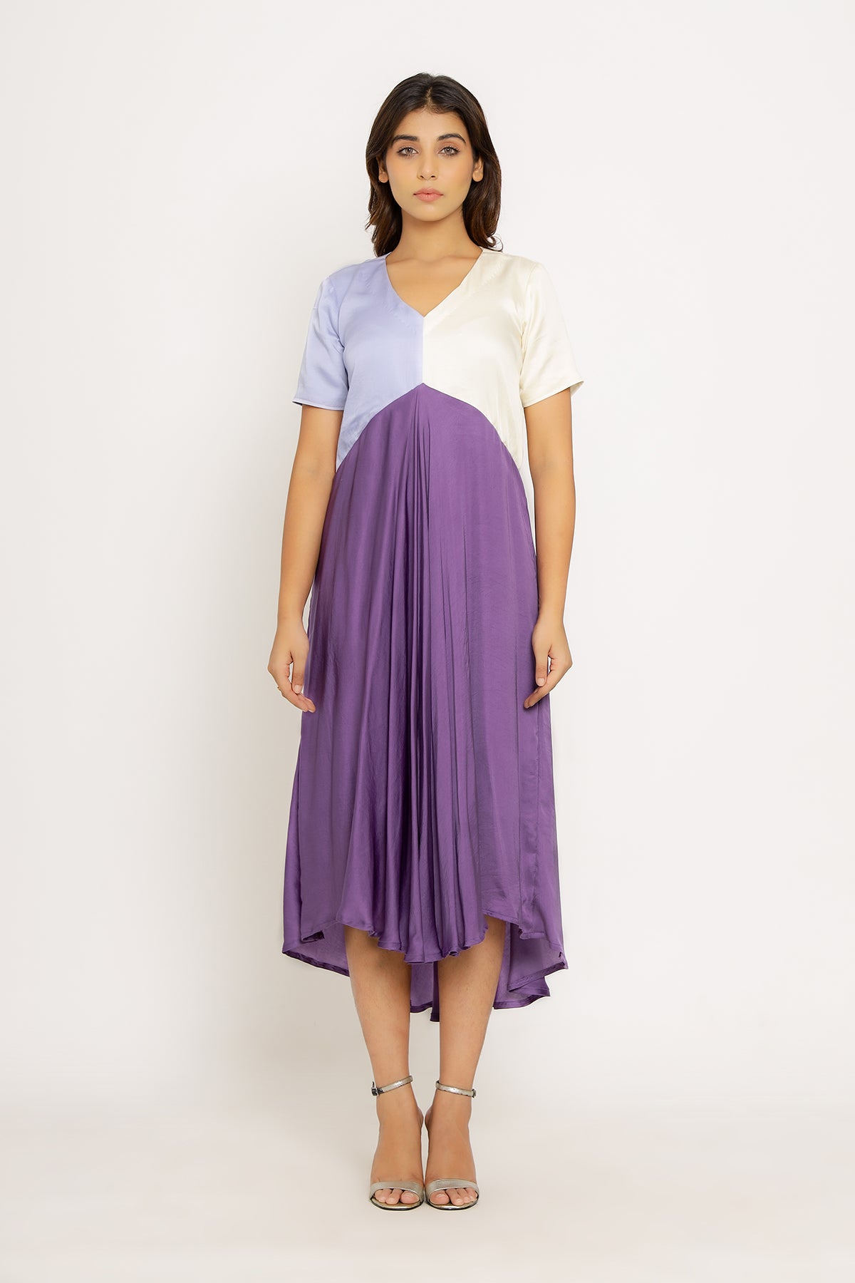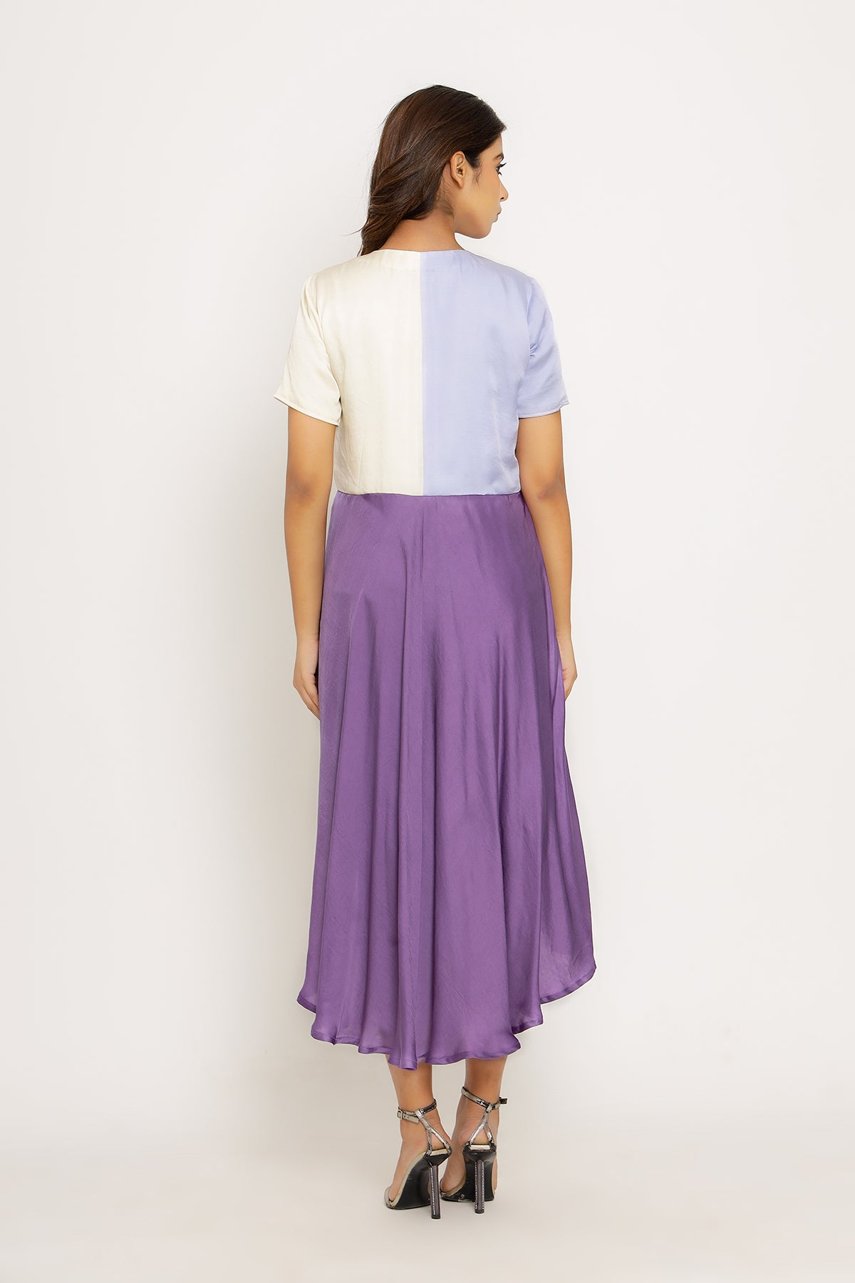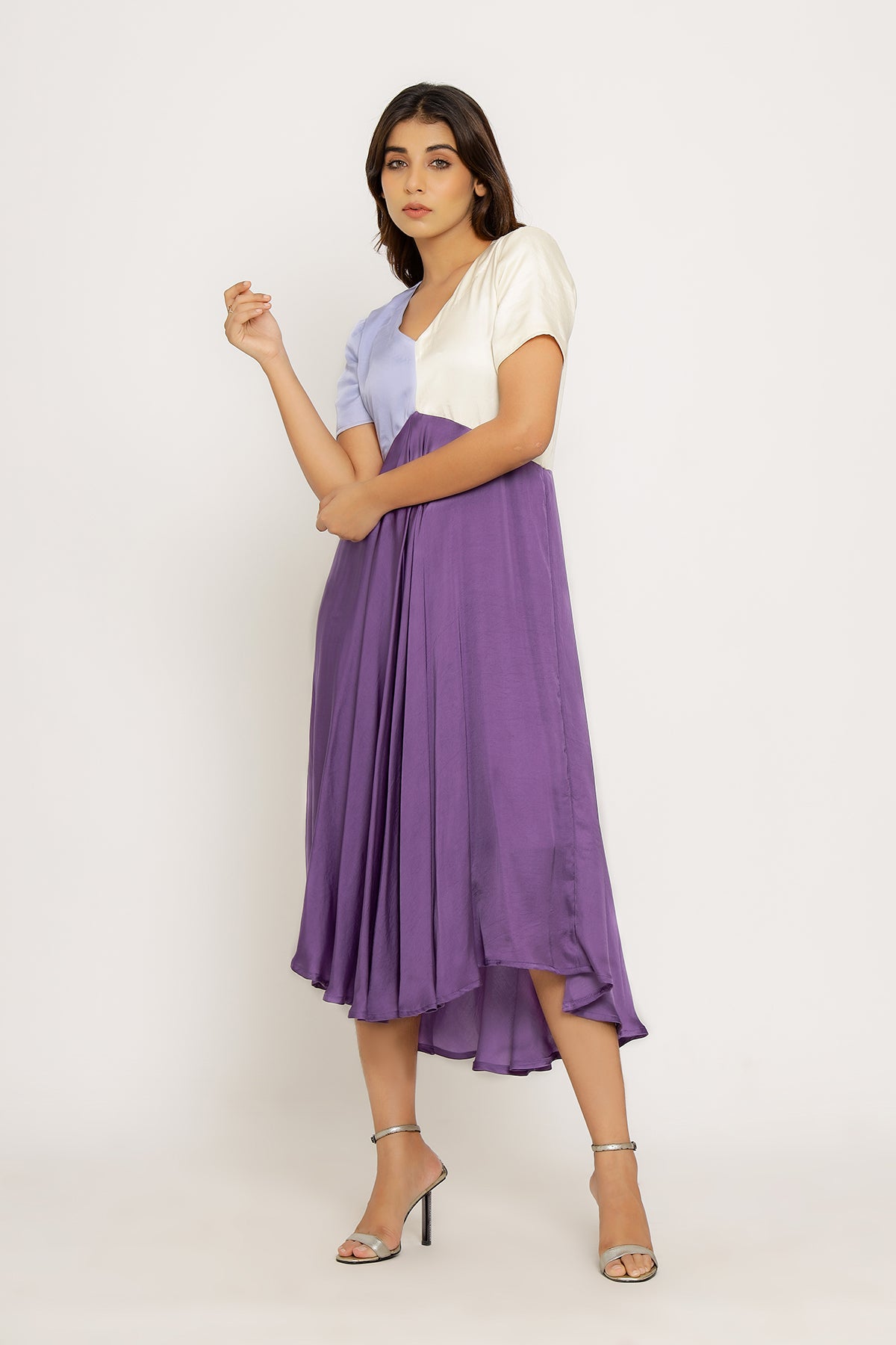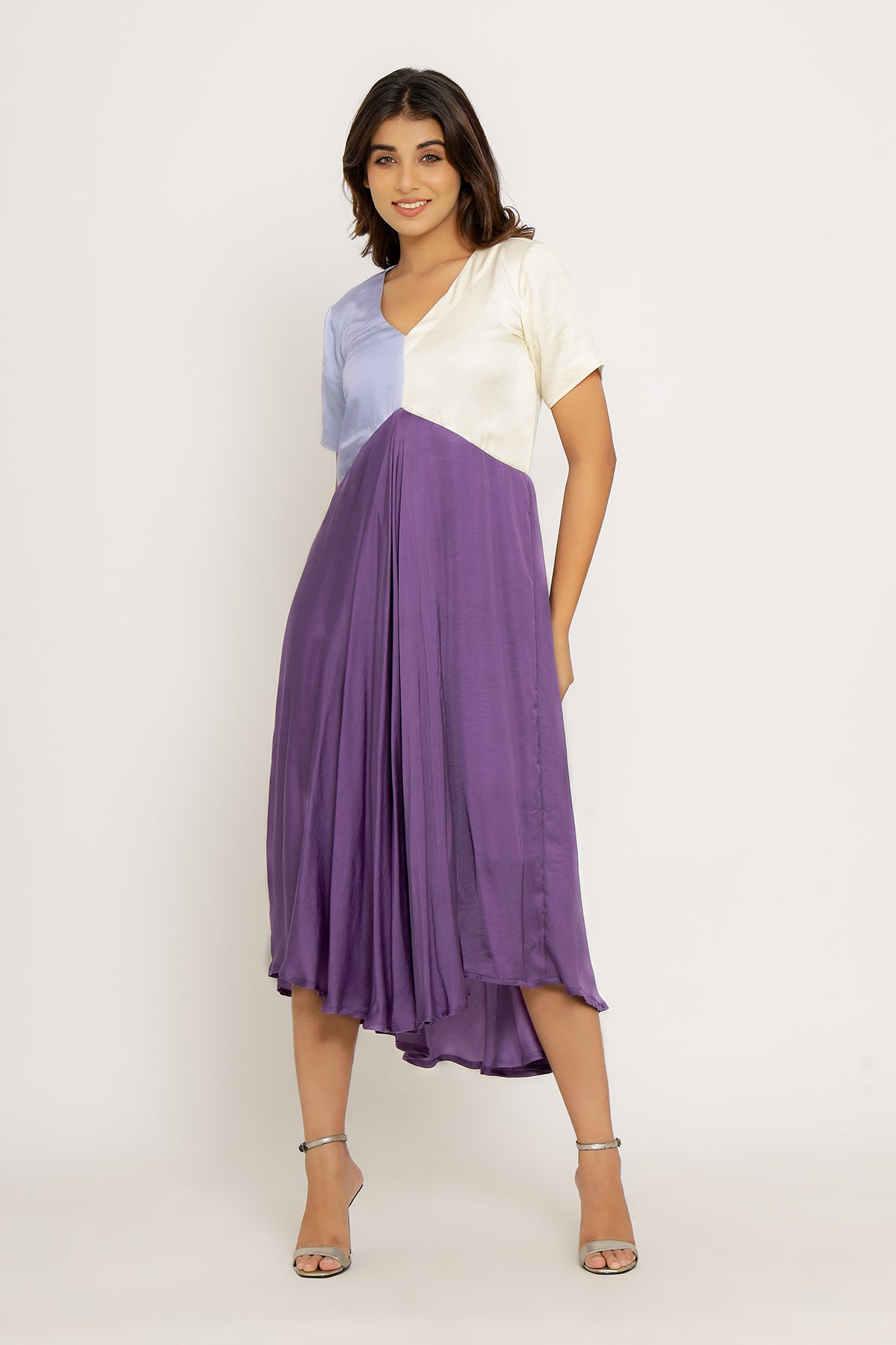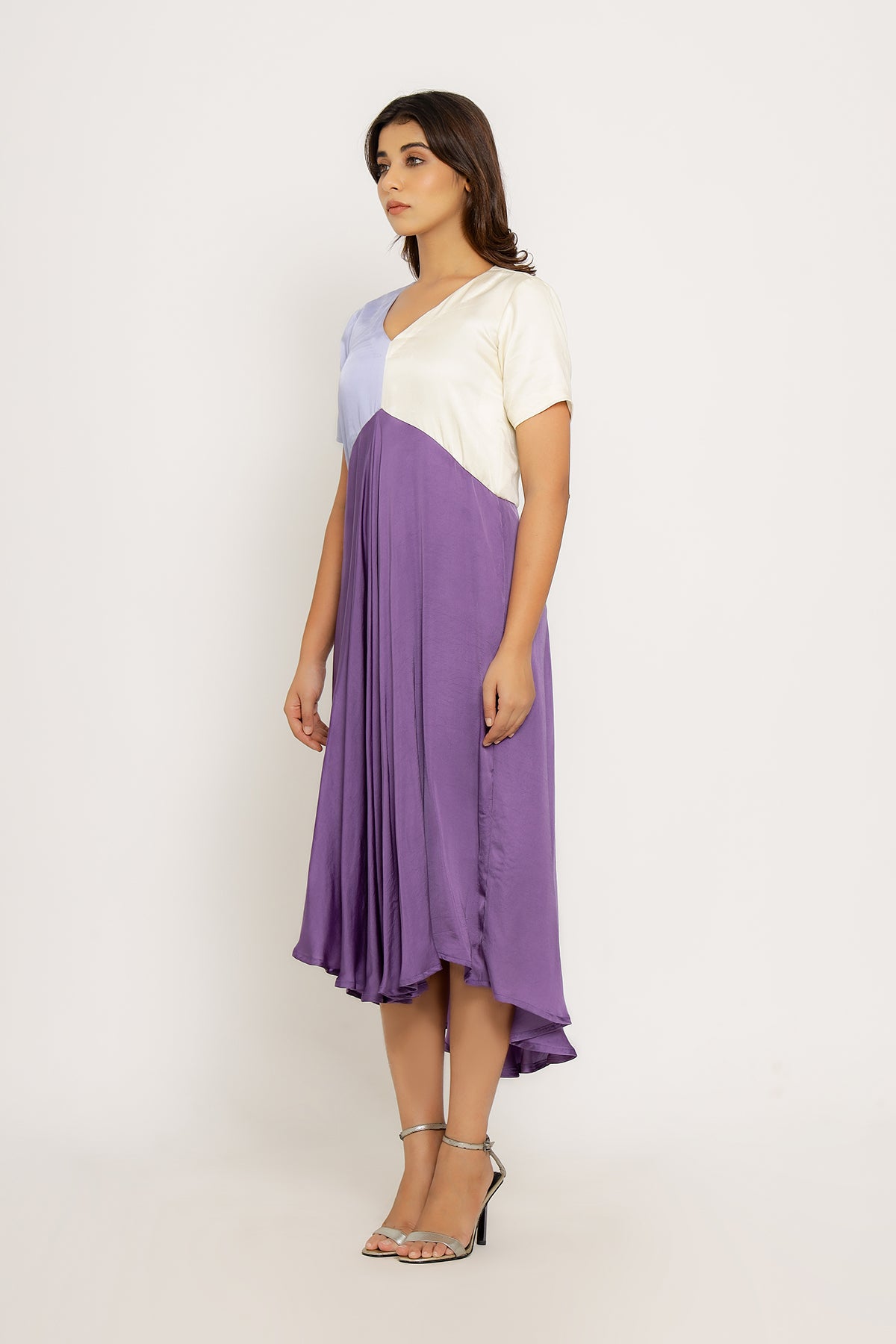 Purple-Lilac Midi Dress with Tri Colorblocked Pattern.Length of the Garments: 44