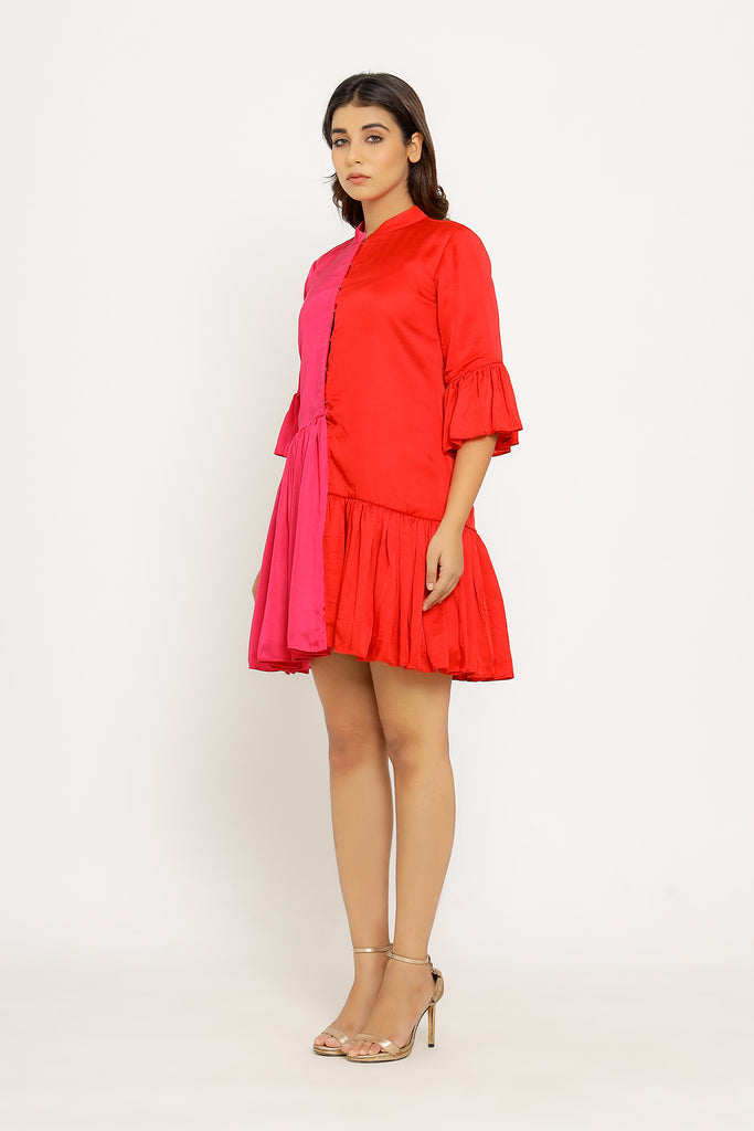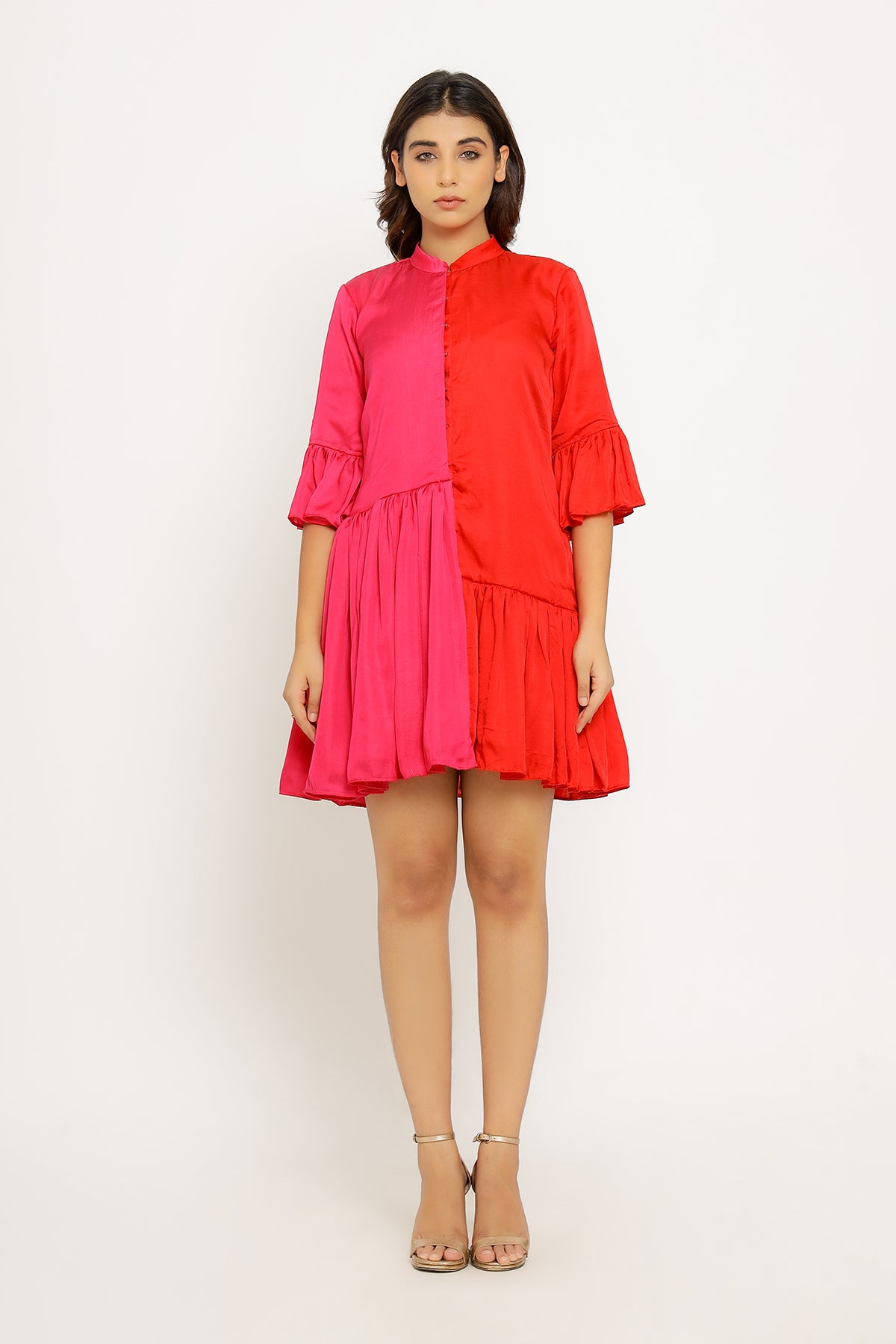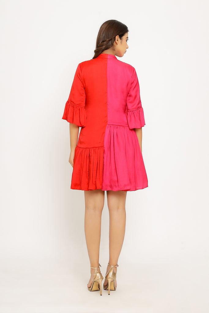 Red-Pink Mid Length Dress with Asymmetrical Gathers and Elbow Sleeves with Bell Gathers.Length of the Garments: 35