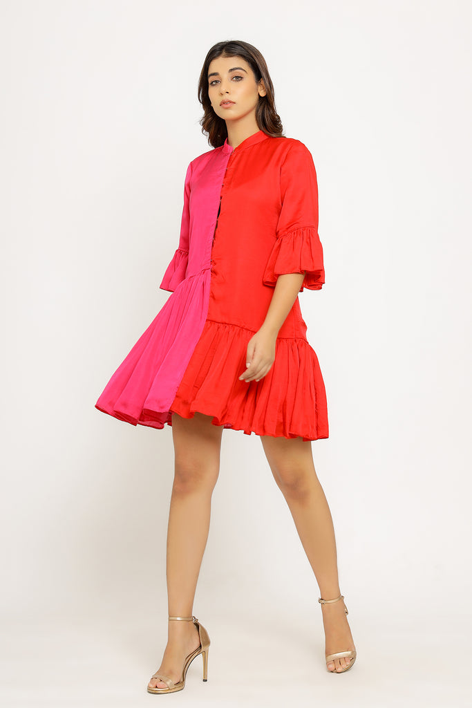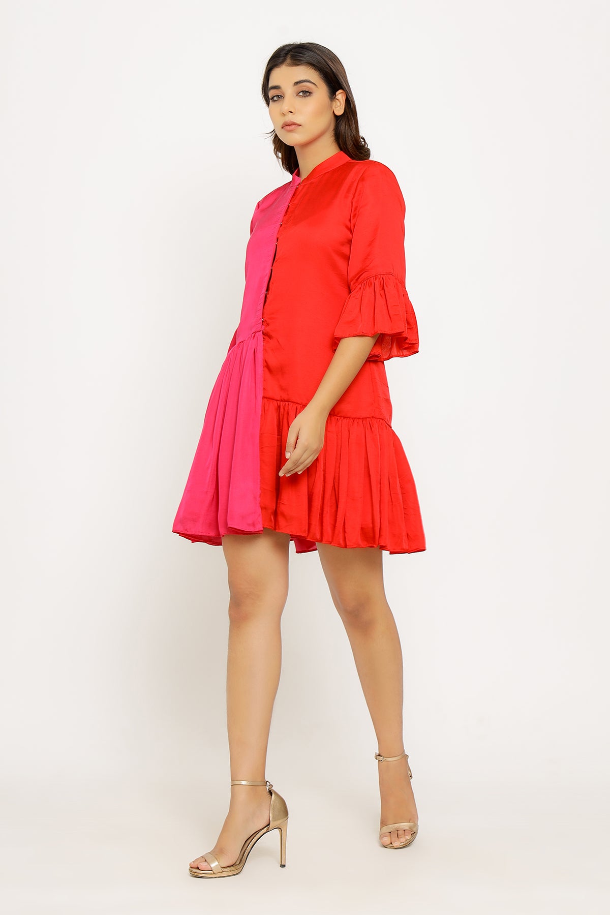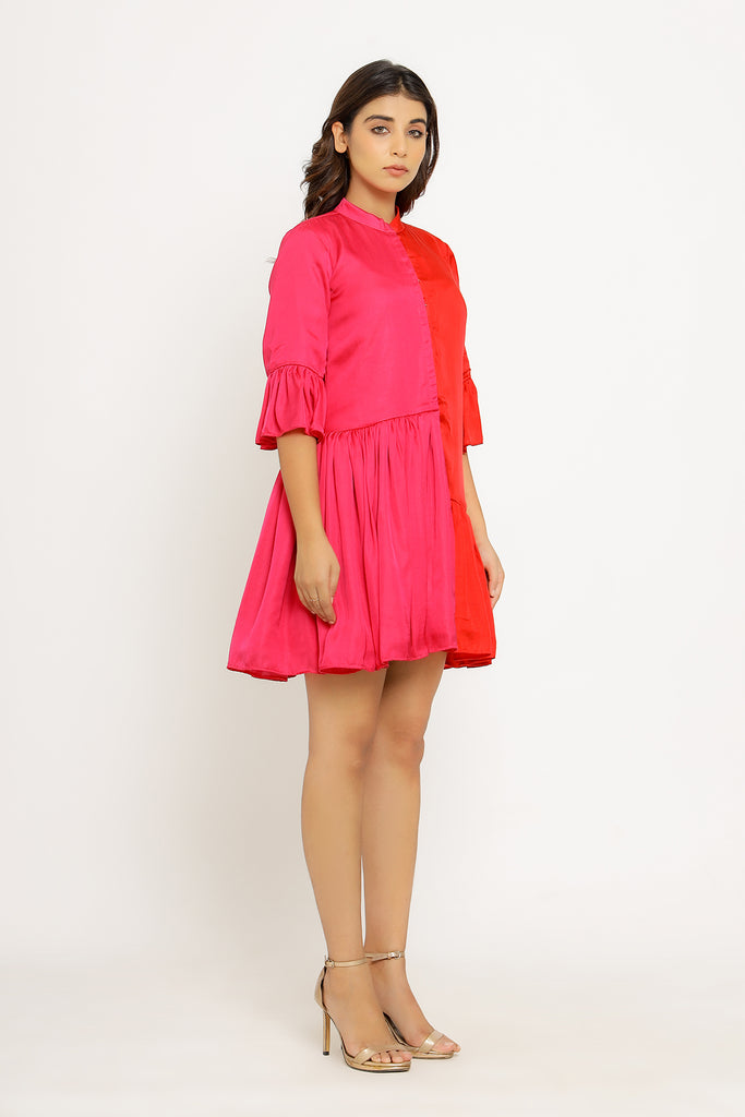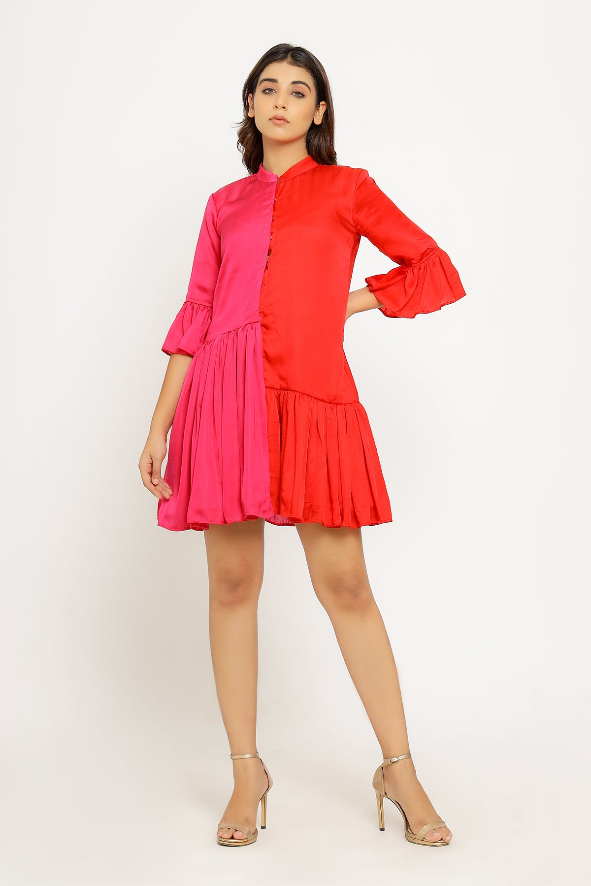 Red-Pink Mid Length Dress with Asymmetrical Gathers and Elbow Sleeves with Bell Gathers.Length of the Garments: 35